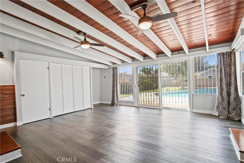 Gorgeous Pool Home!! Beautifully maintained 2-bedroom, 1-bath home of 1,424 square feet of inviting living space. Welcoming layout features hardwood floors with wooden window shutters pouring in natural light. The living and dining areas perfectly flow seamlessly to a step-down large family room that leads directly into a lovely huge backyard with a pool ideal for outdoor entertaining, or even the potential of an ADU (buyer to verify). Fully upgraded kitchen with stainless steel oven, stove, refrigerator, dishwasher, and plenty of cabinet space. Modern light fixtures. A long driveway for additional parking. Recreation Park directly across the street. Centrally located near major freeways, shopping centers, schools, and public transit. This property is a gem that combines charm, space, and potential in one compelling package.