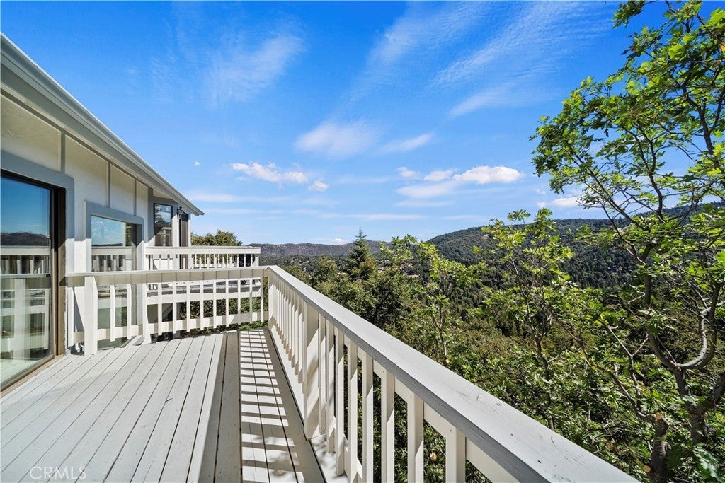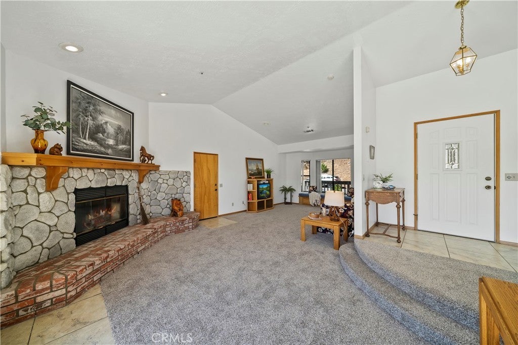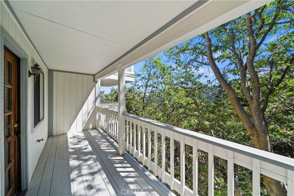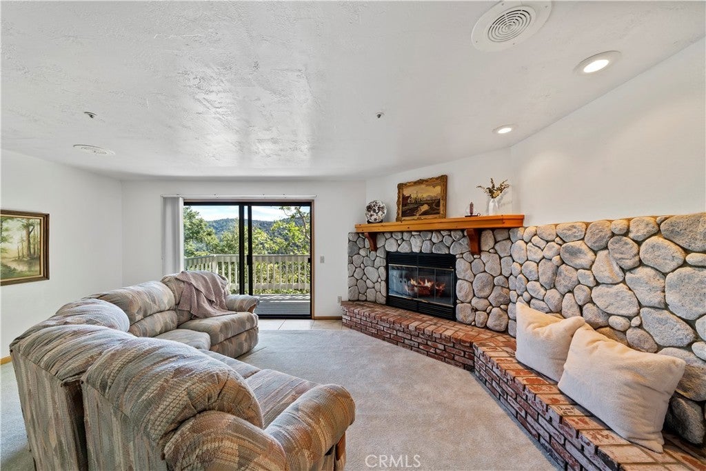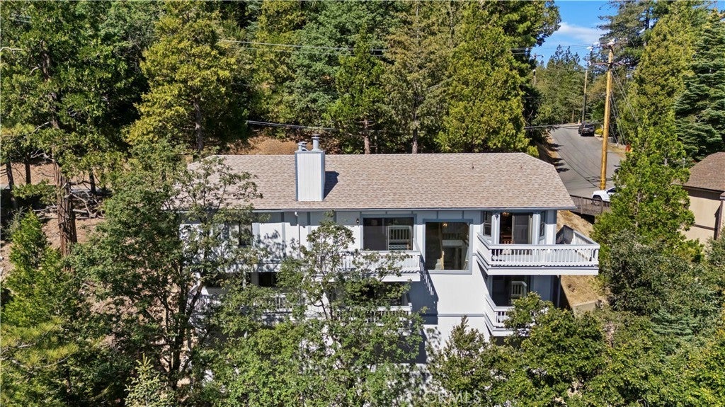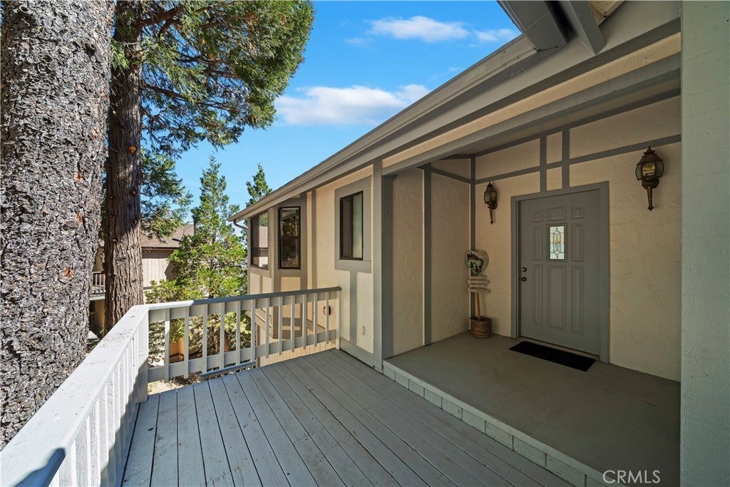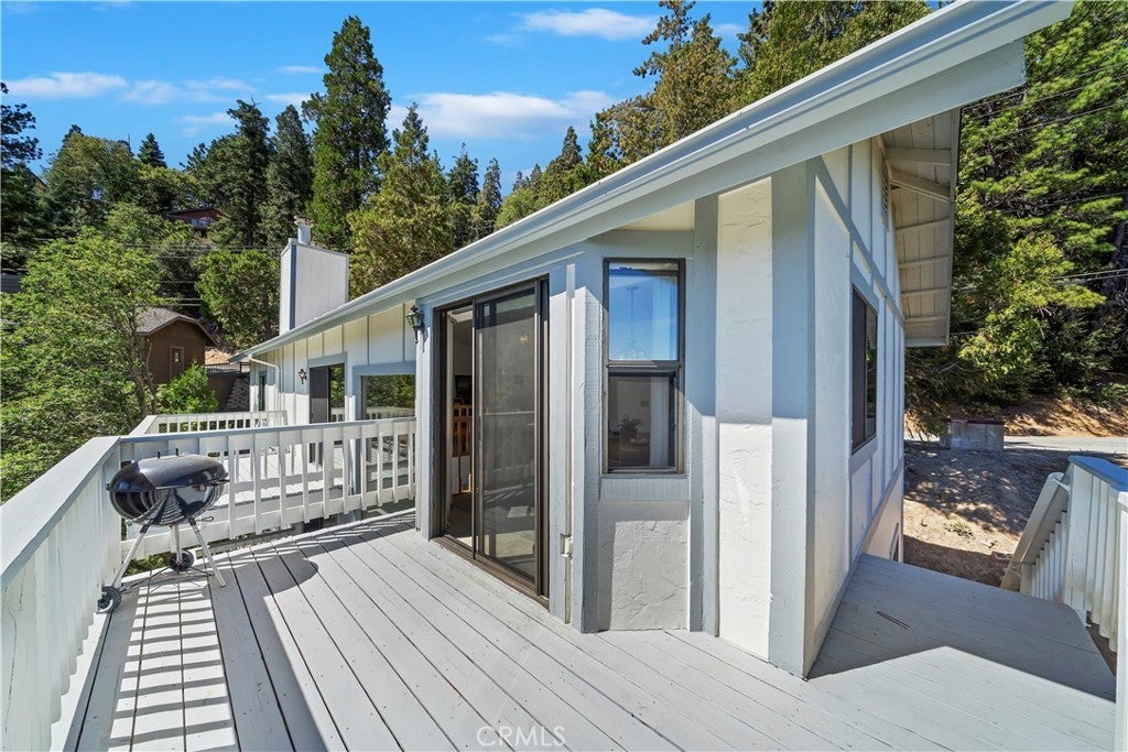 Nestled in the forest is your opportunity to own a mountain chalet with a open floorplan. Step through the foyer and take in the views from the windows and doors. The living room beckons you to come in and relax by the fireplace with raised hearth and rich mantle. It also features a bay window seating area with storage cabinets as well. Relax and read a book by the window with a view. The living room also has a walk-on deck with view of the forest. Invite family and friends over for dinner in your formal dining room with a walk-on deck perfect for a BBQ, taking in the sunrise early in the morning with a cup of coffee, or maybe star gazing in the evening. Great kitchen with ample counterspace and cabinetry, new dishwasher, 5 burner gas cooktop, trash compactor, convection microwave, oven, refrigerator/freezer, breakfast bar including the bar stools. Powder room as well. The second level features a primary suite with living area with walk-on deck perfect for relaxing, amazing fireplace with raised hearth and mantle, bedroom area has two closets, adjoining primary bath features dual vanity, step up separate soaking tub with massaging jets, separate walk in shower, walk-on deck off bath, walk in closet, and your own private sauna. 1st secondary bedroom has window with view and two closets, 2nd secondary bedroom has it's own walk-on balcony with view, Plus a inside laundry room that includes the washer and dryer, 3rd level is a spacious bonus room that was basement area. It comes with pool table and light, a table with chairs for playing cards, games or eating area. The flooring at the table area is tiled. Remaining room is carpeting, large area for kids to play, storage area under the stairway perfect for toys, games, etc. Plenty of room for family and friends over for the weekend, holidays, etc. There is a two car garage with automatic opener and the driveway can hold two additional cars. Close to Lake Gregory with water park, swim beach, Lake trail, Skate park, boating, kayaking, paddle boarding and dog park. Property is perfect for short-term rental or year round living. Celebrate the Christmas holidays this year in your mountain home. Don't miss this great opportunity to call this your new home.