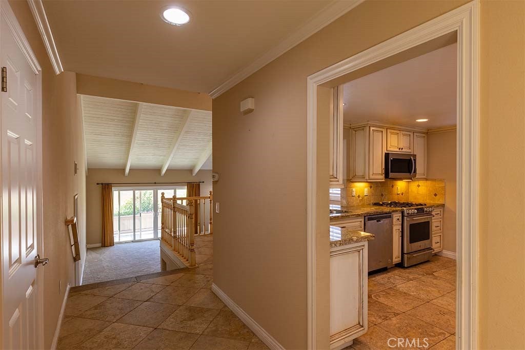 Highly sought after model in Fairway Village! End unit with 3 bedrooms 2 bathrooms with approximately 1572 sq ft. Updated kitchen with stainless appliances granite counters and stone flooring. Other features include, double door formal entry, Cathedral ceilings, ceiling fans, and built in cabinet in guest room. The Primary bedroom is located on the lower level with ensuite bath, with dual sinks, walk in closet and and large walk in shower with a private balcony. There is new carpet in the bedrooms and fireplace in living room with sliding door to the large balcony. Convenient 2 car attached garage and plenty of guest parking. This secure community has a 24 hour guard at the gate, and many HOA amenities to include pool, spa, clubhouse, pickle ball ,tennis courts, and meandering greenbelts. Located close to St Jude Hospital and the vibrant life of Downtown Fullerton. Won't last!