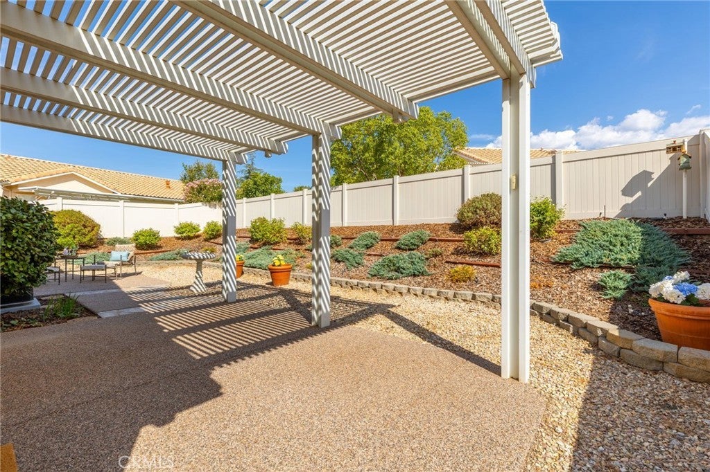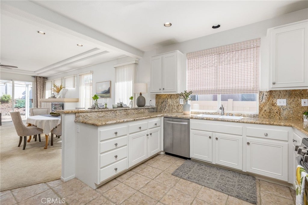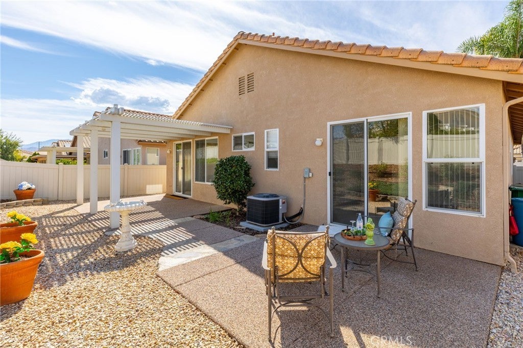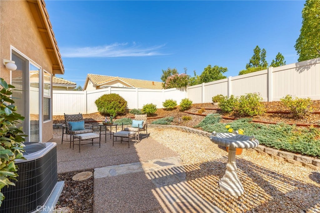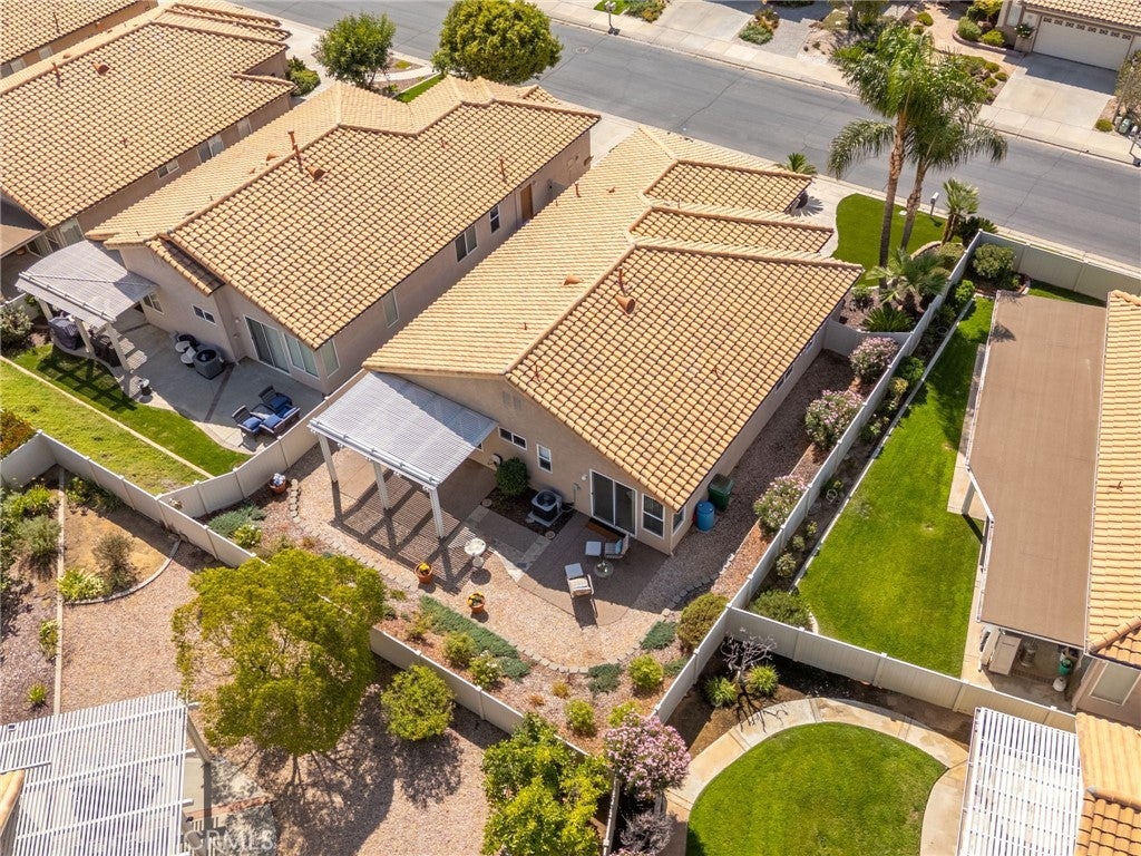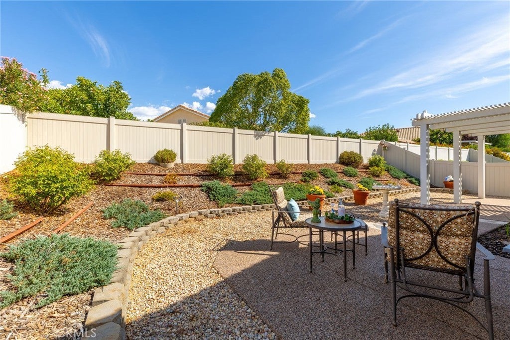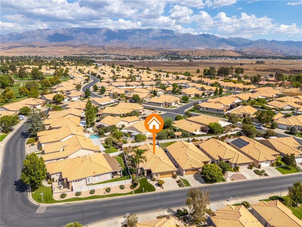 Spacious, inviting and full of light…welcome to 4945 Silverado Avenue in Sun Lakes Country Club; a picturesque, active lifestyle 55+ guard gated community. This desirable Forsythia Model offers with low maintenance landscape; freeing up your days to enjoy everything this golf course community offers! Featuring 2 bedrooms, 2 bathrooms, plus versatile den. In the kitchen, enjoy professionally painted cabinetry accented with premium brushed nickel hardware, under-cabinet lighting, granite countertops with bar seating, stainless steel appliances, and a walk-in pantry. The open-concept dining and living room invites you to gather with friends, featuring a built-in media niche, a cozy gas fireplace, and a sliding glass door that fills the space with natural light. The expansive primary suite is a retreat of its own, complete with a sliding glass door to the backyard, a spacious walk-in closet, and an en-suite bathroom with dual sinks, a wide mirror, and a step-in shower. Guests will appreciate their own private bedroom and full bathroom, while you will love the convenience of an indoor laundry room with storage and direct access to the 2-car garage, which includes cabinetry and a built-in workbench. Throughout the home you will find high ceilings, recessed lighting, ceiling fans, mirrored closets, and a neutral color palette that makes decorating easy. Outdoors, you can unwind on an Epoxy-sealed pebbled patio beneath the Aluma-Wood cover, surrounded by rose bushes, a bird bath, and mountain views in both directions. The yard is designed with artificial turf and slate stone pathways, offering beauty without the hassle. Life at Sun Lakes Country Club is second to none. Experience one of the two championship golf courses, fitness centers, pickleball, tennis, and live entertainment at one of the three clubhouses, where every day feels like a vacation. The community features a ballroom, a restaurant and lounge, indoor and outdoor resort-style pools, a library, over 80 clubs, and even private RV storage. Internet and cable are included with the HOA, and there are no Mello Roos taxes. Close to the 10 fwy, casino, and Cabazon Outlets. This turnkey home on a private corner lot, has been lovingly maintained by its original owners. All you need to do is move in, hop on your golf cart, and embrace the lifestyle that Sun Lakes has to offer.