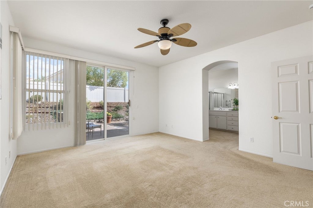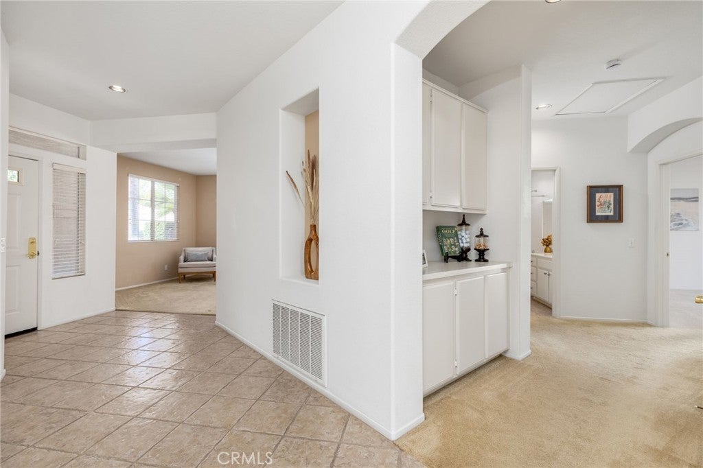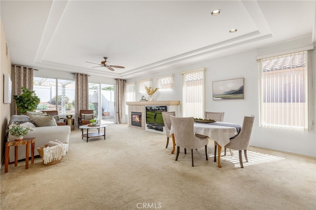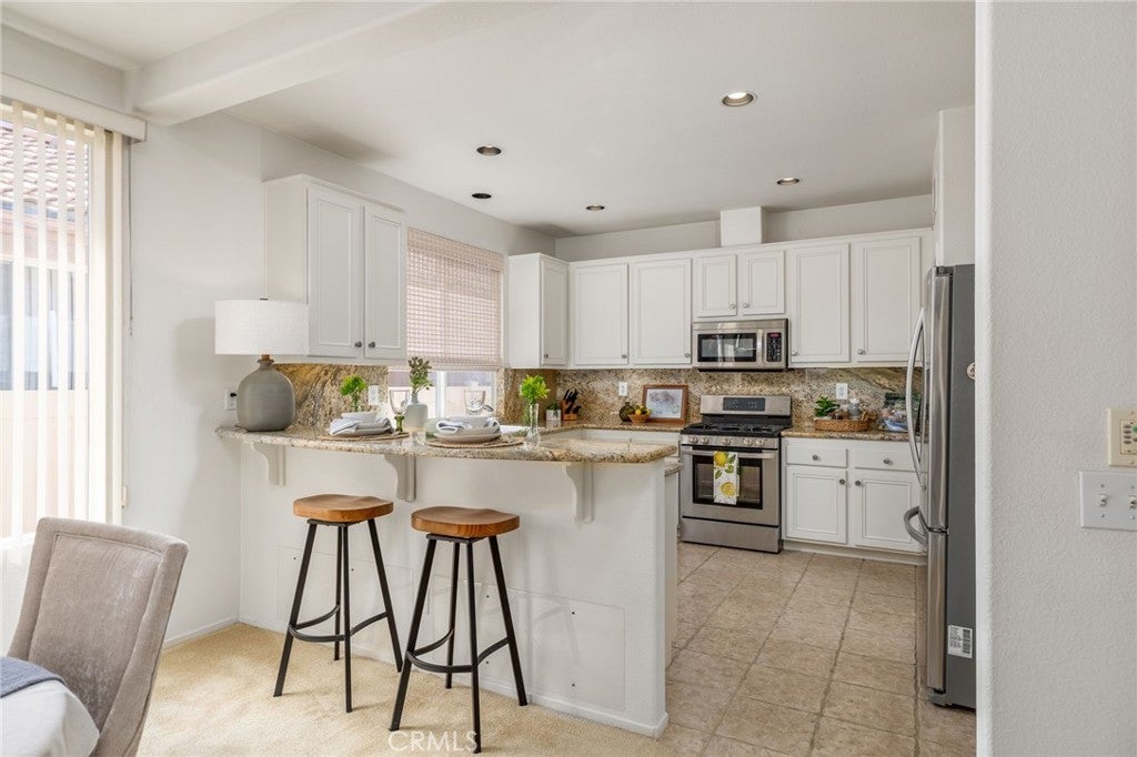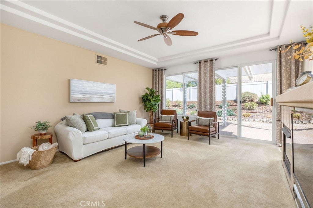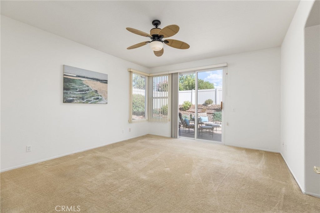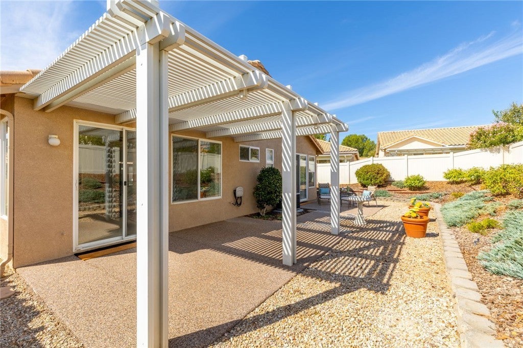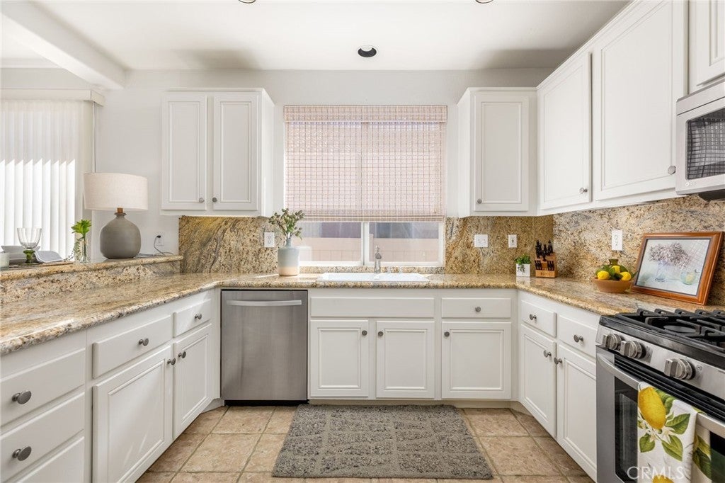 Spacious, inviting and full of light…welcome to 4945 Silverado Avenue in Sun Lakes Country Club; a picturesque, active lifestyle 55+ guard gated community. This desirable Forsythia Model offers with low maintenance landscape; freeing up your days to enjoy everything this golf course community offers! Featuring 2 bedrooms, 2 bathrooms, plus versatile den. In the kitchen, enjoy professionally painted cabinetry accented with premium brushed nickel hardware, under-cabinet lighting, granite countertops with bar seating, stainless steel appliances, and a walk-in pantry. The open-concept dining and living room invites you to gather with friends, featuring a built-in media niche, a cozy gas fireplace, and a sliding glass door that fills the space with natural light. The expansive primary suite is a retreat of its own, complete with a sliding glass door to the backyard, a spacious walk-in closet, and an en-suite bathroom with dual sinks, a wide mirror, and a step-in shower. Guests will appreciate their own private bedroom and full bathroom, while you will love the convenience of an indoor laundry room with storage and direct access to the 2-car garage, which includes cabinetry and a built-in workbench. Throughout the home you will find high ceilings, recessed lighting, ceiling fans, mirrored closets, and a neutral color palette that makes decorating easy. Outdoors, you can unwind on an Epoxy-sealed pebbled patio beneath the Aluma-Wood cover, surrounded by rose bushes, a bird bath, and mountain views in both directions. The yard is designed with artificial turf and slate stone pathways, offering beauty without the hassle. Life at Sun Lakes Country Club is second to none. Experience one of the two championship golf courses, fitness centers, pickleball, tennis, and live entertainment at one of the three clubhouses, where every day feels like a vacation. The community features a ballroom, a restaurant and lounge, indoor and outdoor resort-style pools, a library, over 80 clubs, and even private RV storage. Internet and cable are included with the HOA, and there are no Mello Roos taxes. Close to the 10 fwy, casino, and Cabazon Outlets. This turnkey home on a private corner lot, has been lovingly maintained by its original owners. All you need to do is move in, hop on your golf cart, and embrace the lifestyle that Sun Lakes has to offer.