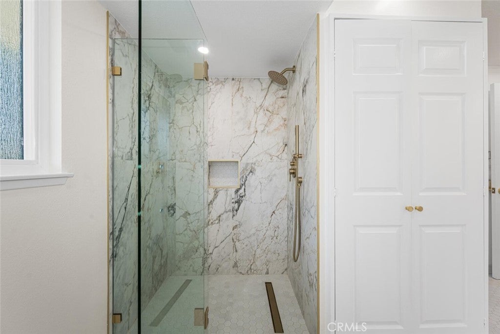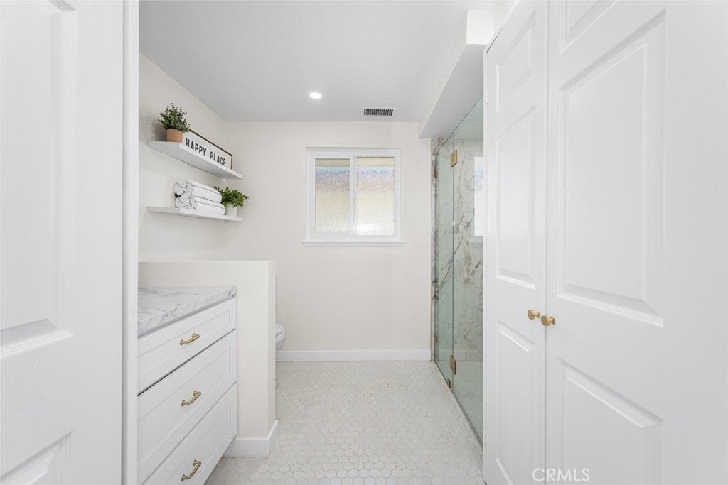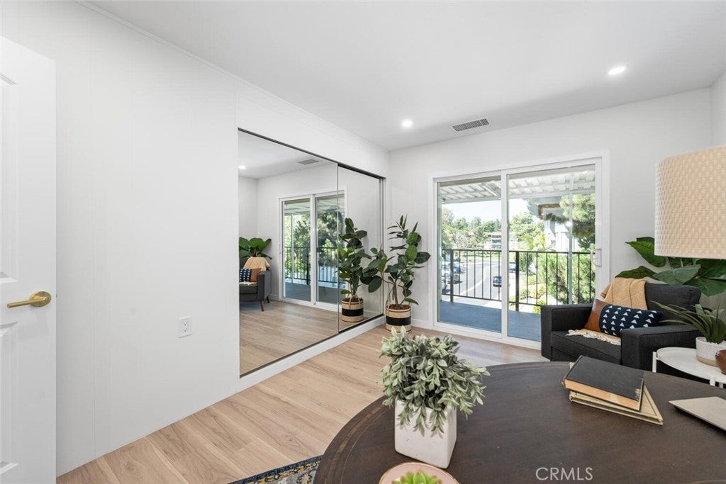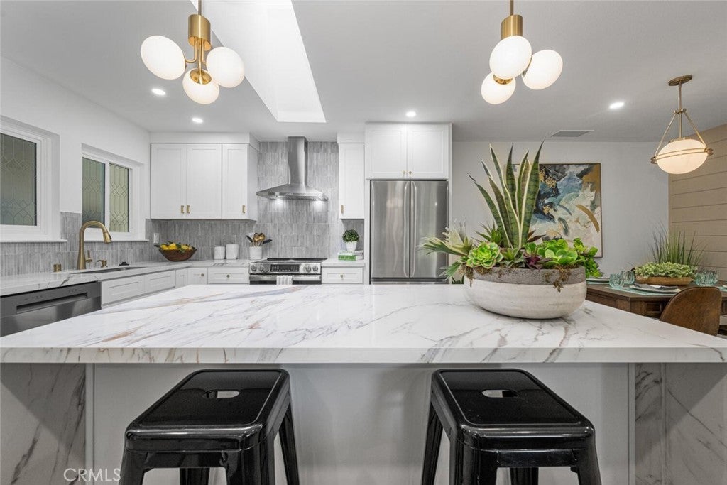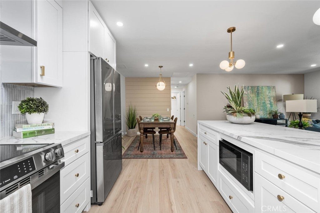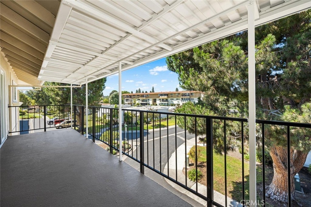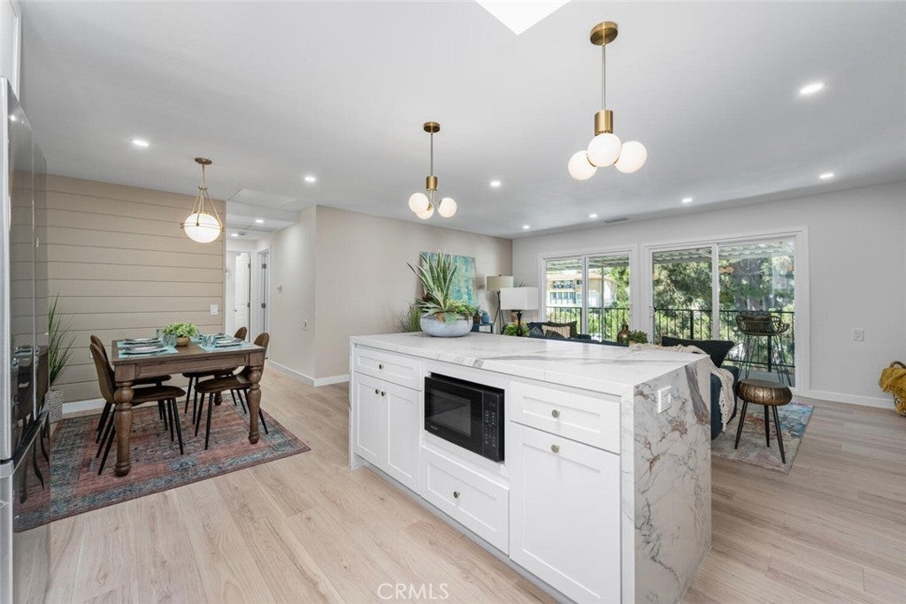 Seller motivated and willing to contribute towards closing costs! Welcome to this beautifully reimagined top-floor Casa Contenta model home, located in the desirable Third Mutual of Laguna Woods! Step inside to discover a stunning open-concept living space featuring recessed lighting and a custom floor-to-ceiling stone electric fireplace that serves as a striking focal point. Expansive dual-pane sliding doors bring the outdoors in, creating a serene, treehouse-like ambiance with an exceptional sense of privacy—no neighbors in sight. Natural light floods the home through a dramatic skylight that spans the width of the kitchen. The kitchen itself is a true showstopper, thoughtfully updated with sleek quartz countertops, stainless steel appliances, Shaker-style cabinetry, pendant lighting, and an oversized island with a breakfast bar—perfect for entertaining. Adjacent to the kitchen is a dedicated dining area accented by stylish custom lighting fixtures, ideal for hosting dinner parties or casual meals. Down the hallway, you'll find a beautifully updated guest bathroom featuring a new vanity, a fully tiled roll-in shower, and a glass enclosure. The unique floor plan includes a private primary suite, complete with a luminous white bathroom boasting quartz counters, a tiled floor, and a low-threshold glass-enclosed shower. Additional highlights include high-quality laminate flooring throughout, central air conditioning, and an in-unit washer and dryer for your convenience.This home is ideally situated within Laguna Woods, allowing residents to take full advantage of its amenities. Laguna Woods Village residents are privileged to enjoy a 27-hole championship golf course, a 9-hole executive par 3 course, pickleball and tennis courts, lawn bowling, gyms, clubhouses, swimming pools, horse stables, gardening centers, an art studio, a world-class wood shop, computer workrooms and classes + over 200 clubs and organizations!