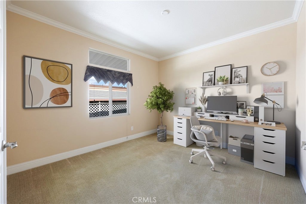 Back on Market due to logistical issues for the buyer's relocation from out of state to CA. Whittier Downs is a 55+ gated community designed for residents who value connection, creativity, and comfort. The home is nestled on ‘Cypress’ street and is a lovely 2 bedroom/2-bathroom home which also comes with a bonus room that can serve as an office, guest bedroom, meditative sanctuary or hobby/craft room. This mobile home is on a solid foundation and feels like a sturdy, traditional home with 9-foot, smooth ceilings, drywall textured walls, recessed lighting in the kitchen and ample storage throughout. The neutral palette of light tan showcases the architectural accents of gleaming white crown molding, 5-inch routed baseboards and mahogany colored cabinetry in the kitchen & bathroom. The paneled interior doors with lever hardware further enhances the feel of a higher-end traditional home and makes accessibility to rooms easier and more user friendly. Plush, low-cut camel colored wall to wall carpeting is soft and warm under foot and has never been stepped on by cat or dog paws. It has been freshly shampooed for you so please feel free to kick off your shoes! The kitchen is punctuated by satin finished stainless steel appliances with a black enamel & stainless 4-burner gas range and deep stainless-steel sinks with sprayer. The interior living area is flooded with natural light and multiple functional windows for cross breezes, and the primary bedroom has subdued lighting for better rest, sleep and relaxation. The ensuite primary bathroom is spacious, has a walk-in shower and ample storage for linens, towels and toiletries. A dedicated laundry room comes with a top-loading washer & gas dryer and has enough space for additional storage cabinets or a laundry folding table or drying rack; and a backdoor leading to the covered carport & a large, no maintenance 'Tuff Shed’. The large AC unit keeps the interior cool in the summer and the gas furnace in the laundry room keeps it warm when the weather shifts to Fall; and is controlled with the touch of a finger from the digital thermostat. This home supports a lifestyle centered on simplicity and social engagement—where residents gather for game nights, coffee and cards, crafting, and shared experiences. The community is surrounded by shopping, dining, fitness studios, personal care services, and healthcare providers. On-site management maintains the grounds and fosters a cohesive, well-cared-for environment.