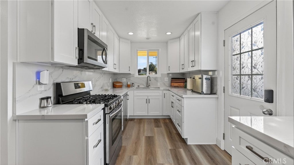 Do not look any further! this is the one- A single story home pride of ownership, Renovated with 4 bedrooms 2 baths, featuring a beautiful remodeled kitchen with quartz countertops pots & pan drawers also top-of-the line appliances, dishwasher, stove, microwave, modern lighting and newer double pane windows, open concept integrates the living,dining and kitchen spaces. Bathrooms are beautiful upgraded with quartz counters and step-in shower, a large family room with beautiful brick fireplace, the sliding door in the family room provides direct access to the patio, one year old roof, copper plumbing, laundry inside, two car garage and extra long driveway offers ample space for multiple cars, new carpet and floors.