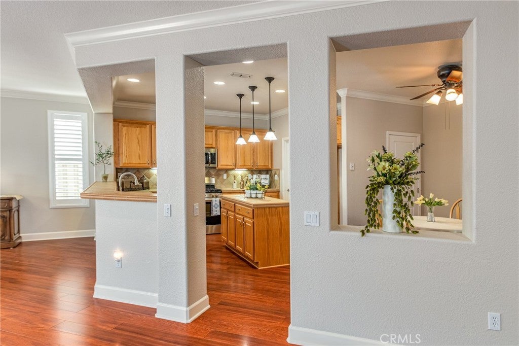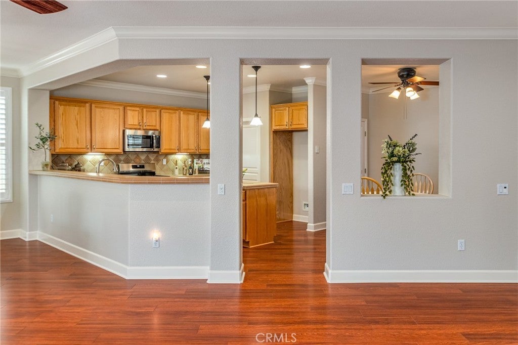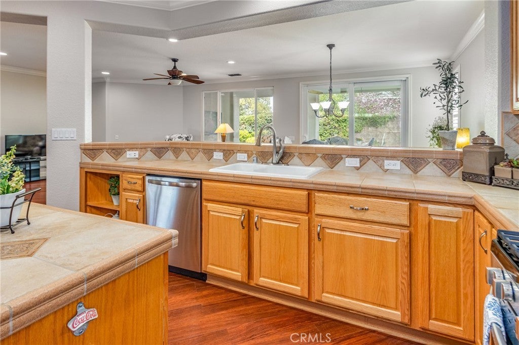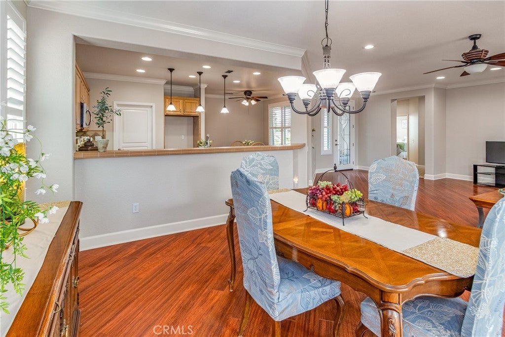 Breakfast Bar, Breakfast Area, Ceiling Fan(s), Crown Molding, Separate/Formal Dining Room, Open Floorplan, Recessed Lighting, Tile Counters, All Bedrooms Down, Bedroom on Main Level, Main Level Primary, Walk-In Closet(s)