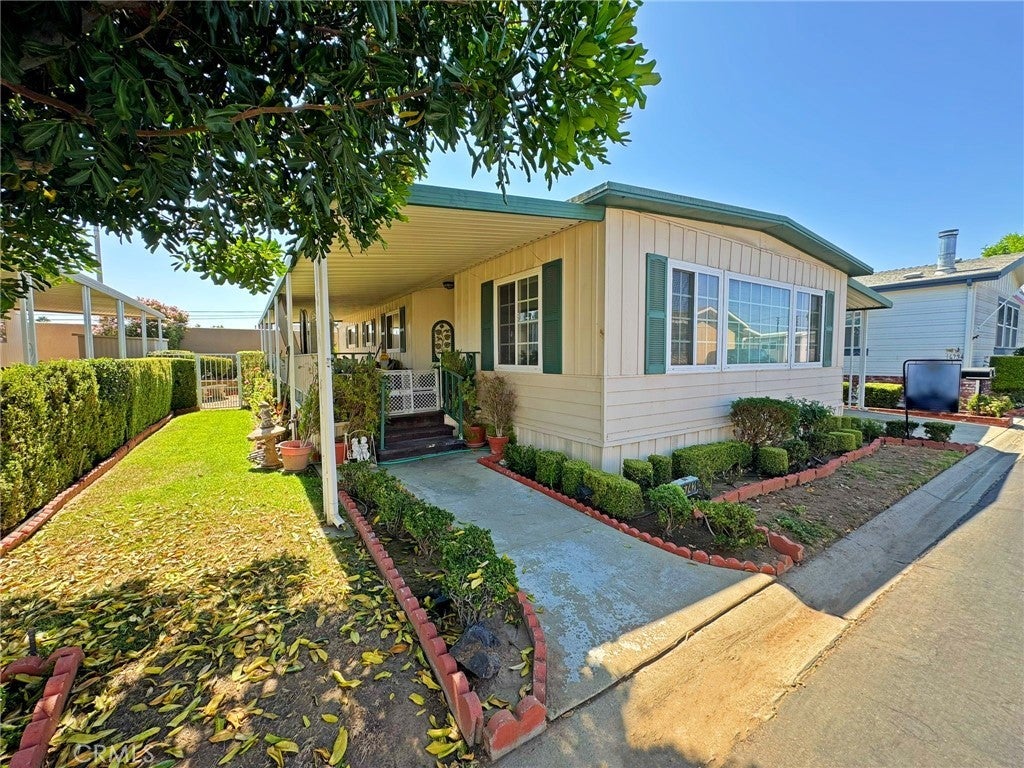 Senior Park Community 55+...Welcome home to this charming home in Lake Park in the wonderfully located area of Yorba Linda. This development borders Brea and is centrally located to tons of shopping, restaurants and entertainment. This home is charming in every sense. Located on a quaint street with covered parking and a fully covered patio that extends the length of the home there is plenty of room for Quiet days at home or entertaining family and friends. This lovely single story has an open layout with smooth ceilings and vinyl windows throughout. Open living room has lots of lighting and opens up to your separate dining area with custom built in cabinetry. The kitchen opens up to the dining area and has a four-burner cooktop as well as double oven and lots of kitchen cabinetry. Separate laundry area has direct access to your extensive covered patio. The hallway has additional linen storage with lots of room for those extras! This 2-bedroom 2-bath home has a full bathroom in the hallway for guests, as well as a generously sized bedroom with mirrored closet wardrobe, and a ceiling fan for those warm nights! Master bedroom sits at the end of the hallway with mirrored wardrobe closets as well as a private bath. Your outdoor living space has plenty of room for socializing, gardening or just relaxing at home! With a clubhouse and two pools this adorable home is ready for its next owner!