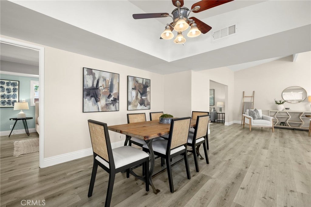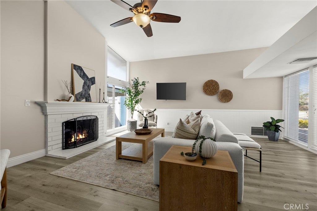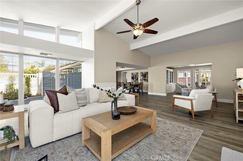 Now offered at an improved price, this home is the lowest-priced property in Rossmoor—an exceptional opportunity for buyers seeking value in a highly desirable community. Welcome to this updated and reimagined mid-century modern home with a hint of ranch architecture—a stunning single-level El Dorado model offering 3 bedrooms and 2 bathrooms across 1,854 sq. ft. on a 7,665 sq. ft. lot in the sought-after Rossmoor community. With vaulted ceilings, an open-concept design, and seamless indoor-outdoor flow, this home captures the essence of Southern California living. Step through the custom front door into a bright, airy interior featuring striking vaulted ceilings, a dramatic floor-to-ceiling fireplace, and expansive windows that fill the home with natural light. The redesigned open layout creates effortless flow between the living, dining, and kitchen areas—ideal for everyday living and entertaining. The chef’s kitchen includes premium energy-efficient stainless steel appliances, a 6-burner Viking cooktop, microwave/convection oven, garden window, skylight, and warm butcher block countertops. Just off the main living area, a spacious bonus room with custom built-ins and backyard access offers flexible use as a media room, playroom, or secondary lounge. Both bathrooms have been fully remodeled, with the spa-inspired primary bath featuring new marble tile, modern vanities, and a walk-in shower. The hall bath includes a jetted tub and a solar tube for added brightness. Enjoy two outdoor living areas: a private front courtyard perfect for al fresco dining, and a landscaped backyard designed for relaxation or entertaining. With only two adjacent neighbors and a tranquil backdrop enhancing privacy, this outdoor space feels like a true retreat. Additional upgrades include seller-owned solar panels (installed 2016), upgraded 200-amp electrical service, and a brand-new roof (2023) with a 50-year warranty. A long driveway, manicured lawn, and colorful flower gardens further enhance curb appeal. Ideally located within the award-winning Los Alamitos Unified School District and minutes from the beach, shopping, golf, and major freeways, this Rossmoor gem offers the perfect blend of architectural character, modern upgrades, and long-term peace of mind.