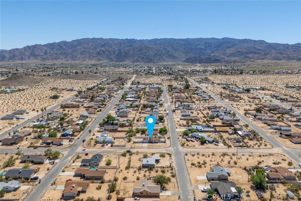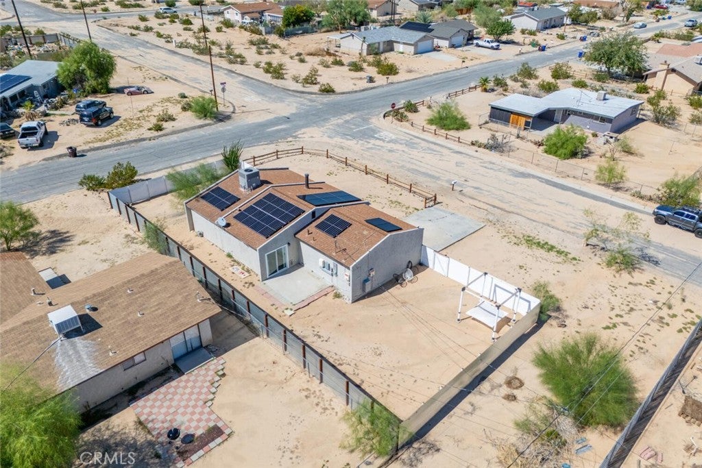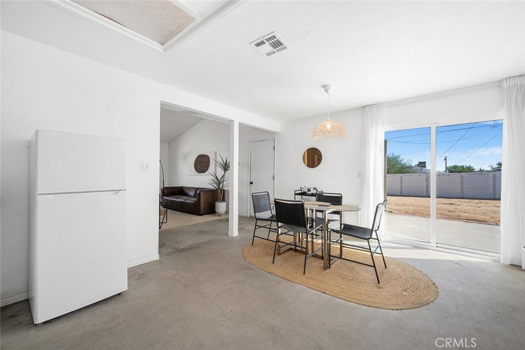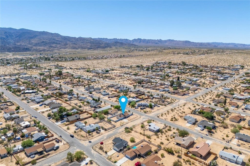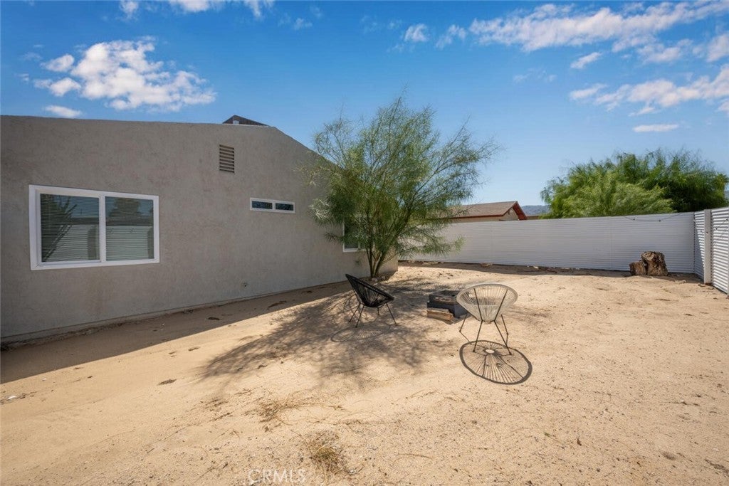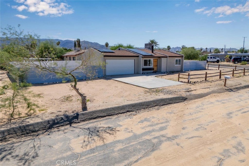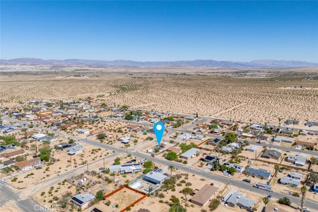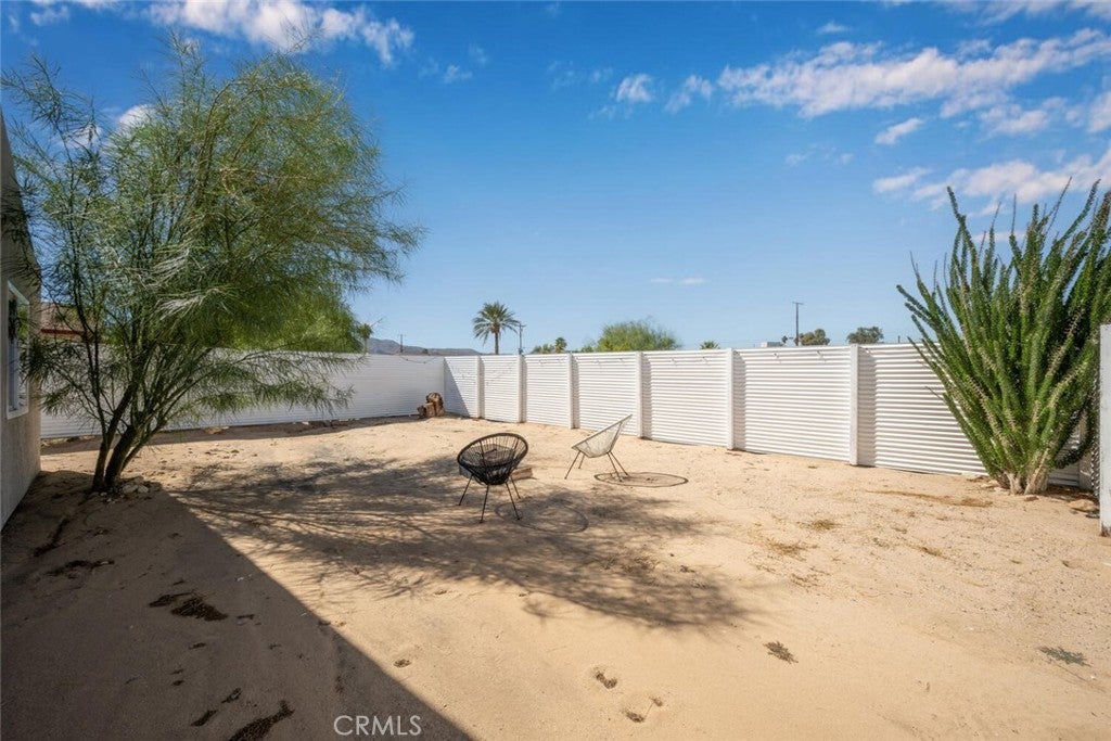 Nestled in a quiet, sunlit neighborhood just minutes from the north entrance of Joshua Tree National Park, this 2-bedroom, 1-bath home presents a seamless blend of modern comfort and relaxed desert charm. As you enter, you’ll feel the calm of the neutral color palette, soft natural light, and an open layout that creates a sense of effortless flow. The living and dining areas are connected, making it easy to host or lounge with ease. Vaulted ceilings add roomy height, and updated windows bring in gentle breezes and desert views. The kitchen is well appointed and designed to be both functional and welcoming. Ample cabinetry, updated appliances, and a breakfast nook/open dining spot near the back patio make daily life comfortable and inviting. Each bedroom retains a serene, understated feel while being flexible enough for guest or personal use. The bathroom is clean and bright, with an expanded walk-in shower newly tiled to the ceiling. Outdoor living is effortless — step out to the patio for morning coffee or evening stargazing. The fenced yard invites desert landscaping, creative outdoor setups, or relaxing in privacy. Located close to local shops, easy access routes, and the natural wonders of the high desert, it offers both serenity and convenience; this home is an ideal full-time residence, desert getaway, or investment opportunity.