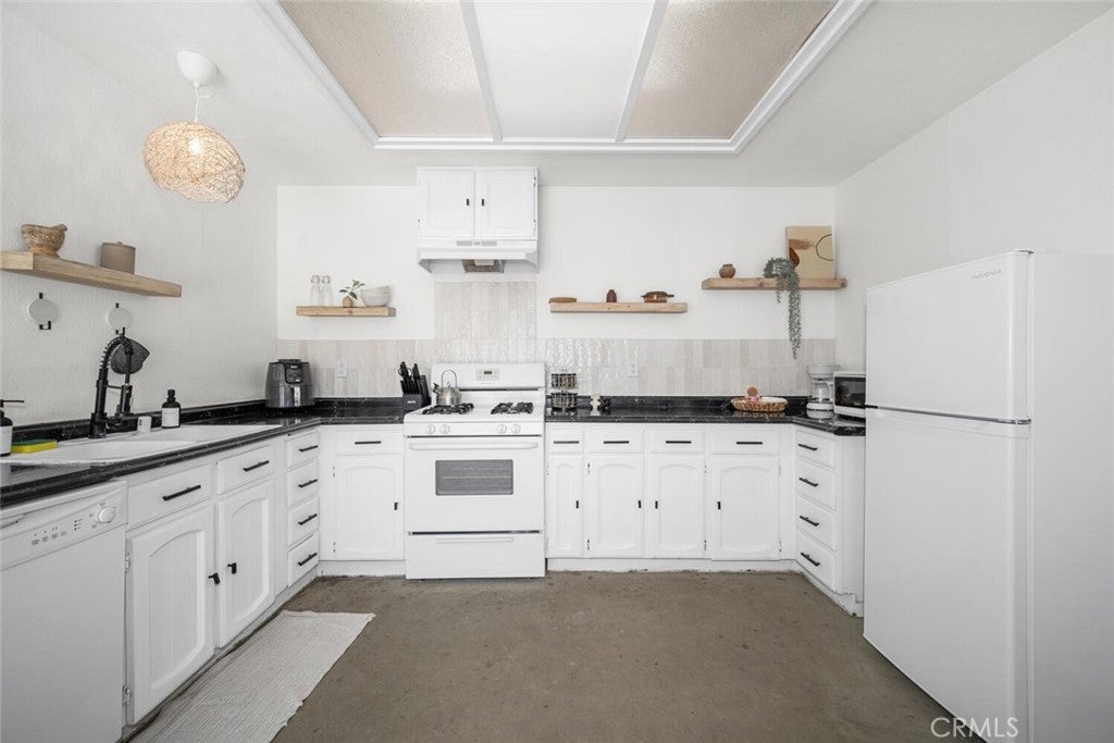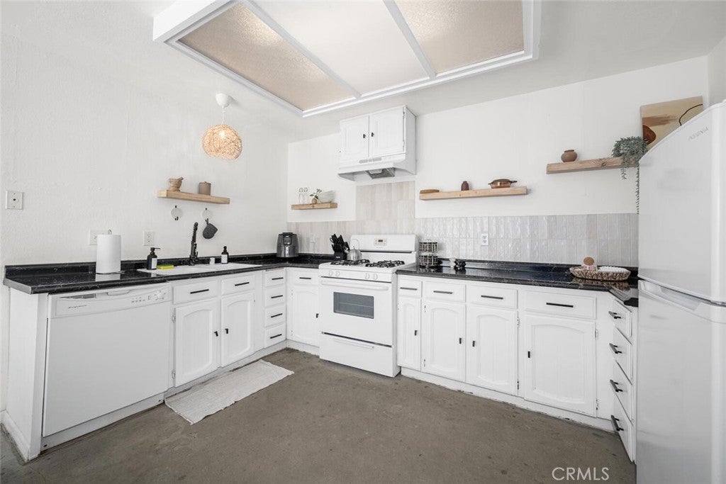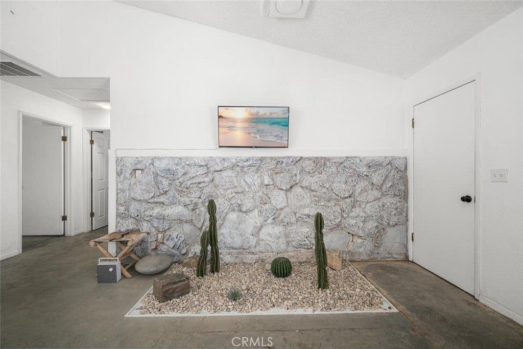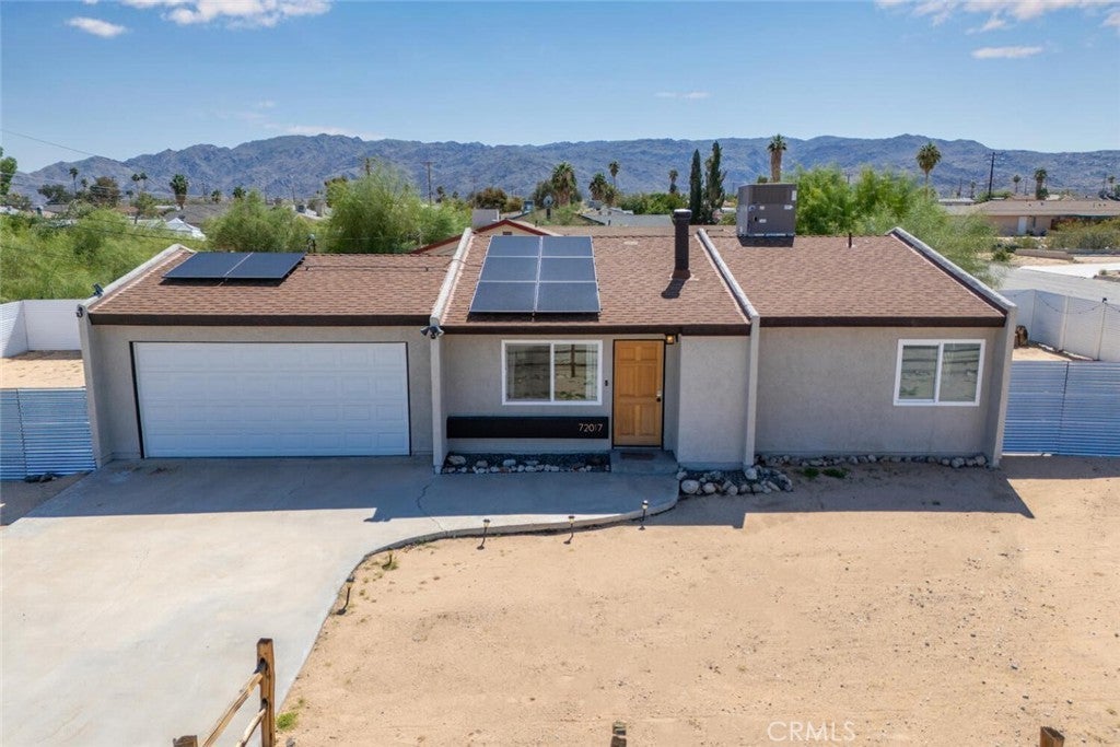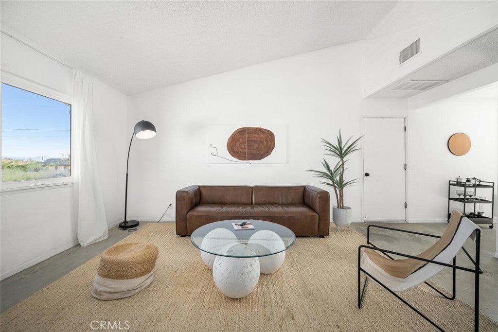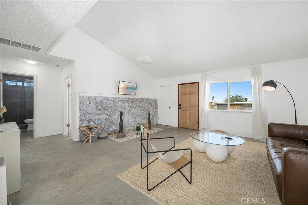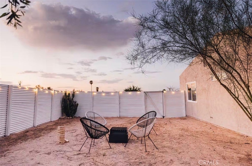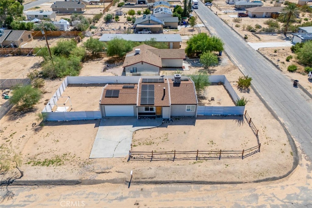 Nestled in a quiet, sunlit neighborhood just minutes from the north entrance of Joshua Tree National Park, this 2-bedroom, 1-bath home presents a seamless blend of modern comfort and relaxed desert charm. As you enter, you’ll feel the calm of the neutral color palette, soft natural light, and an open layout that creates a sense of effortless flow. The living and dining areas are connected, making it easy to host or lounge with ease. Vaulted ceilings add roomy height, and updated windows bring in gentle breezes and desert views. The kitchen is well appointed and designed to be both functional and welcoming. Ample cabinetry, updated appliances, and a breakfast nook/open dining spot near the back patio make daily life comfortable and inviting. Each bedroom retains a serene, understated feel while being flexible enough for guest or personal use. The bathroom is clean and bright, with an expanded walk-in shower newly tiled to the ceiling. Outdoor living is effortless — step out to the patio for morning coffee or evening stargazing. The fenced yard invites desert landscaping, creative outdoor setups, or relaxing in privacy. Located close to local shops, easy access routes, and the natural wonders of the high desert, it offers both serenity and convenience; this home is an ideal full-time residence, desert getaway, or investment opportunity.