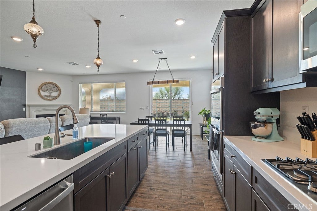This incredible 2022 new build in a beautiful gated community along the mountain range is a must see. The style and beauty of this particular home is not seen anywhere in the community. It is a 4 bedroom and 2 full bath with an incredible interior. The amount of extras in the home are too many to detail. It is a smart home that you are able to control lighting, garage door, and appliances, as well as offers fire sprinklers throughout. With new water con serving landscape as you walk up to the home is a relaxing oasis and in the evening you can enjoy the large back patio. The solar panels are owned outright on top of a clay roof. The entry with office/workout/ reading area off to side, the new flooring is amazing and scratch and water resistance in the kitchen and living areas. The kitchen wide open has new quartz counters, Reverse Osmosis Flo water monitoring system, walk-in pantry, coffee area, new appliances, and a huge island for cooking and entertaining, the living room also wide open to the back and has the most relaxing atmosphere, and gas fireplace. Both have custom fans and lighting that is just enamoring. As you make your way to the bedrooms they are large and roomy, with tons of closet space, a common bathroom huge, that is bright and long counter and full bath with shower and bathtub. The laundry just off the inside separated and has its own storage on doors. Then you make your way to the master bedroom (ensuite) that is so spacious and bright with natural light much like the rest of the home, with the bathroom being wide open and beautiful. Also comes with tankless water heater and ring door system. With a large open backyard with grass area for pets or kids, nice open patio with lighting and fan perfect to relax in the morning or evenings. The garage is a 3 car garage with two charging stations of r electric vehicles both 220V. The home HOA includes internet and cable TV, parks and walking areas, and a playground. Awesome views of the mountain range. This home is near so many amenities, a growing community and a short distance to Joshua Tree national park.