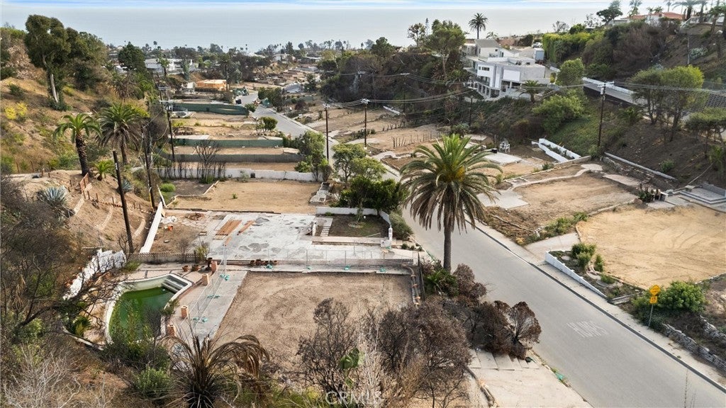 Discover this exceptional half-acre lot in Pacific Palisades, perfectly perched on its own level. This parcel offers unmatched seclusion and breathtaking Catalina views on a clear day, as well as full ocean views from many areas and rooms. Fully certified completion of Phases 1 and 2 by the Army Corps of Engineers. Spanning nearly 24,000 square feet, the lot is ideal for a large home with expansive outdoor living areas, including patios and landscaped gardens. The existing former footprint is approximately 3,000 square feet, allowing for up to 6,000 square feet on two levels. The gently sloping hillside is highly accessible, featuring established trails that lead to a scenic hilltop vista and tranquil rest spot. Additionally, there is potential to extend the build area into the hillside, providing unique opportunities for creative design and functional use of the terrain. A sizable mid-century modern pool remains on-site, awaiting refinement to become a stunning outdoor centerpiece. Situated just moments from the future and newly reconstructed Marquez School, the property offers convenient access to scenic walking trails, panoramic vistas, and outdoor recreation. Elevated above street level, the parcel ensures complete privacy, with no neighboring properties on either side, making it an ideal blank canvas to realize your dream home in one of the most prestigious neighborhoods in Pacific Palisades.