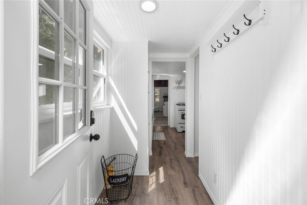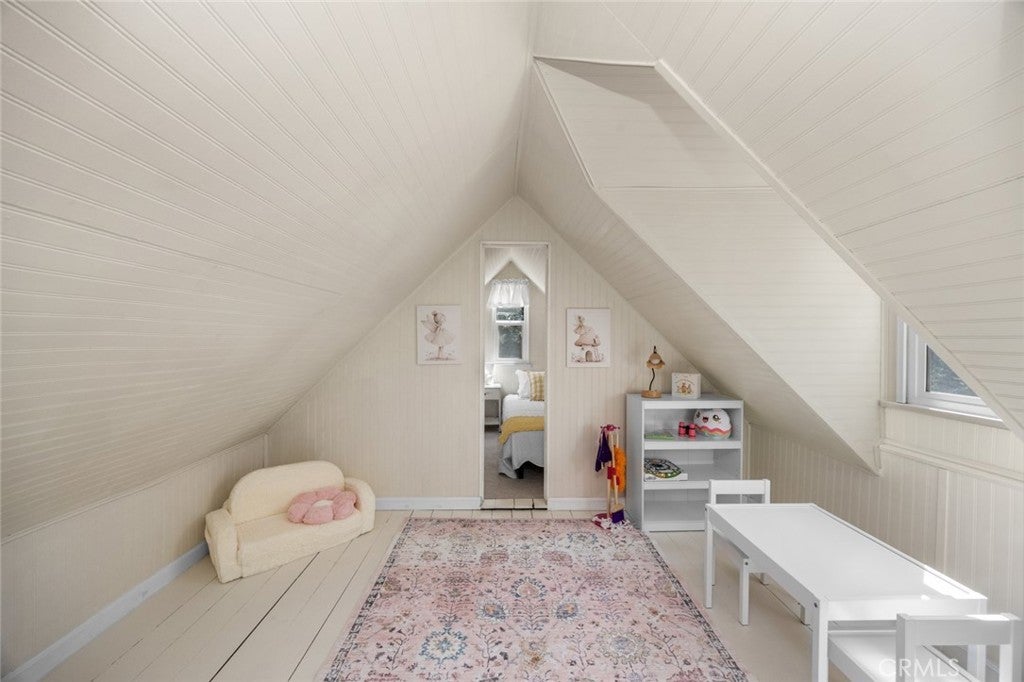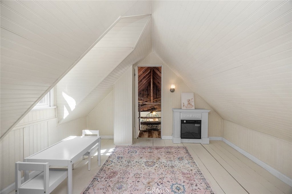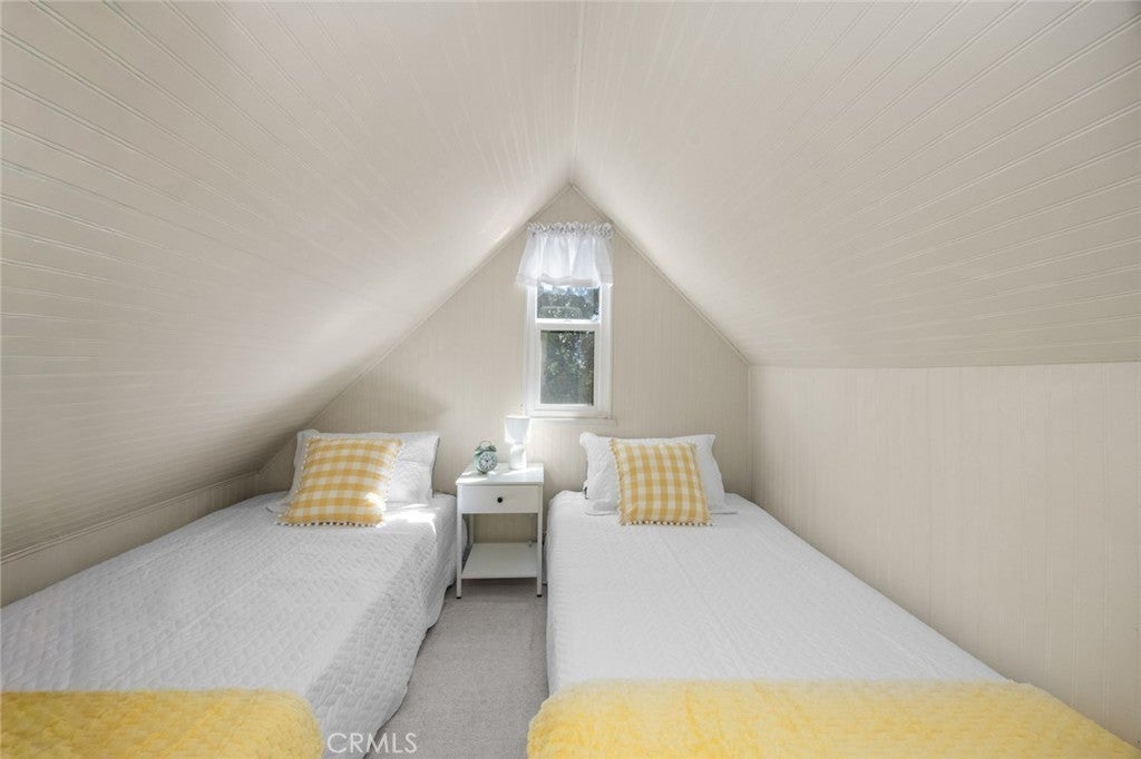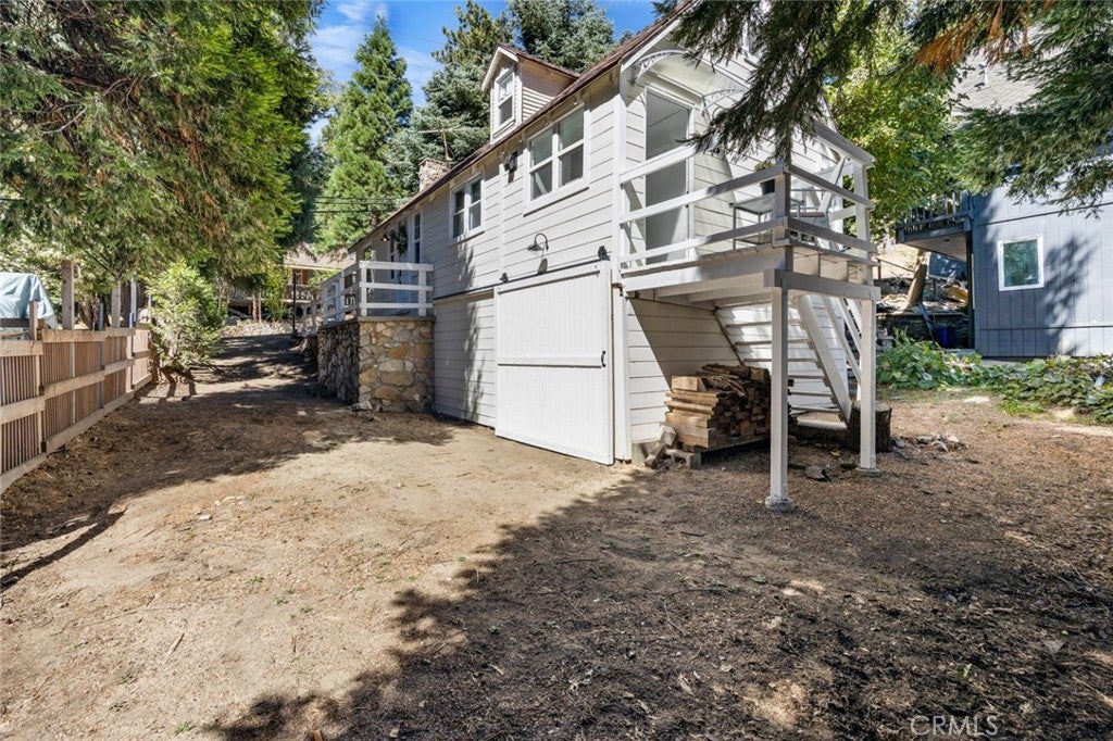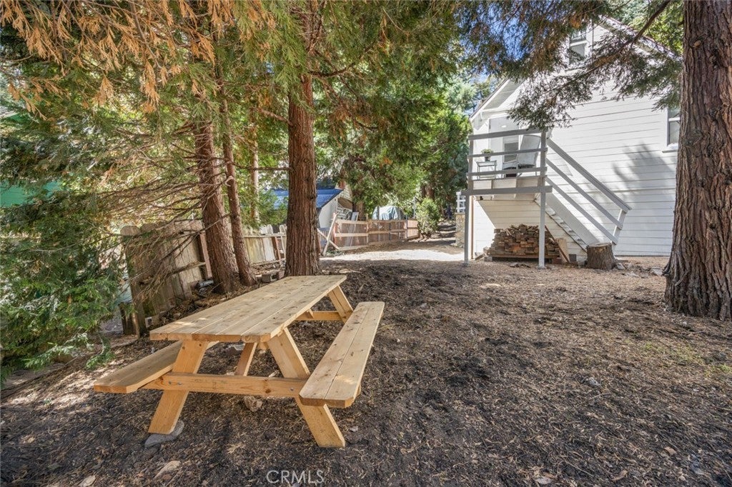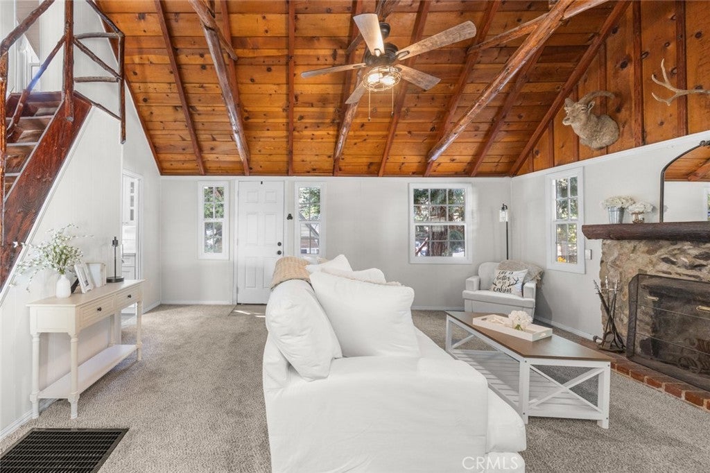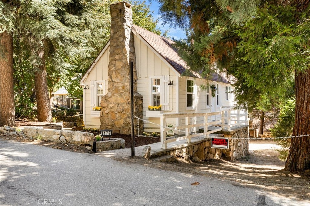 Step inside the high and exposed beamed living room and instantly feel at home. The love and detail poured into this cozy cabin will not go unnoticed. Nestled in the heart of Rimforest, this property offers the best of mountain living, quiet surroundings, nature and close to conveniences. Two bedrooms are located on the main floor and then two additional bedroom spaces are accessible through a small staircase. Below the cabin, there is a barn door to access much storage space. Plenty of yard in front and back for gatherings. All furnishings are brand new and staged to remain in the property and convey with the sale. Do not miss out!