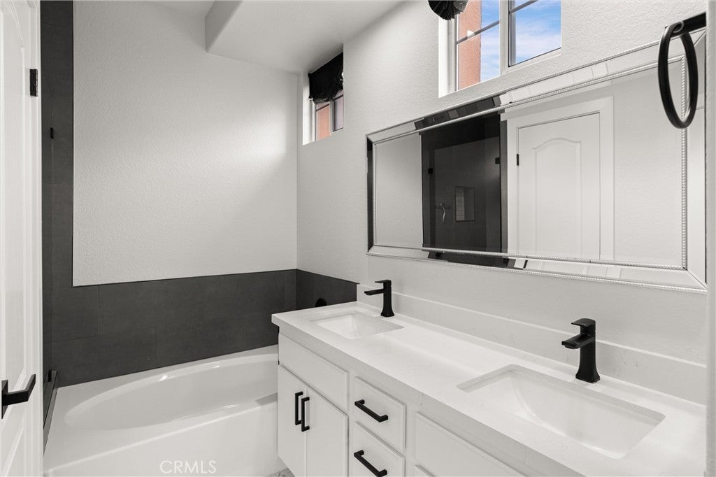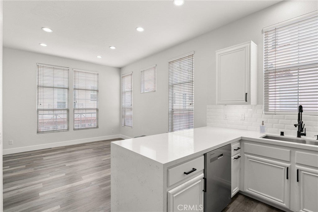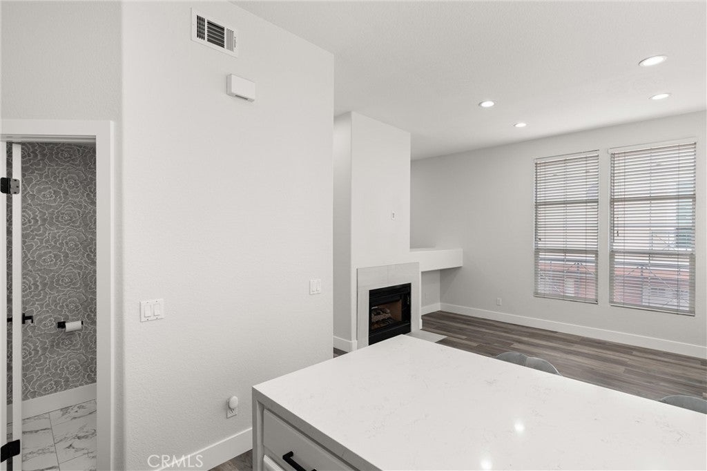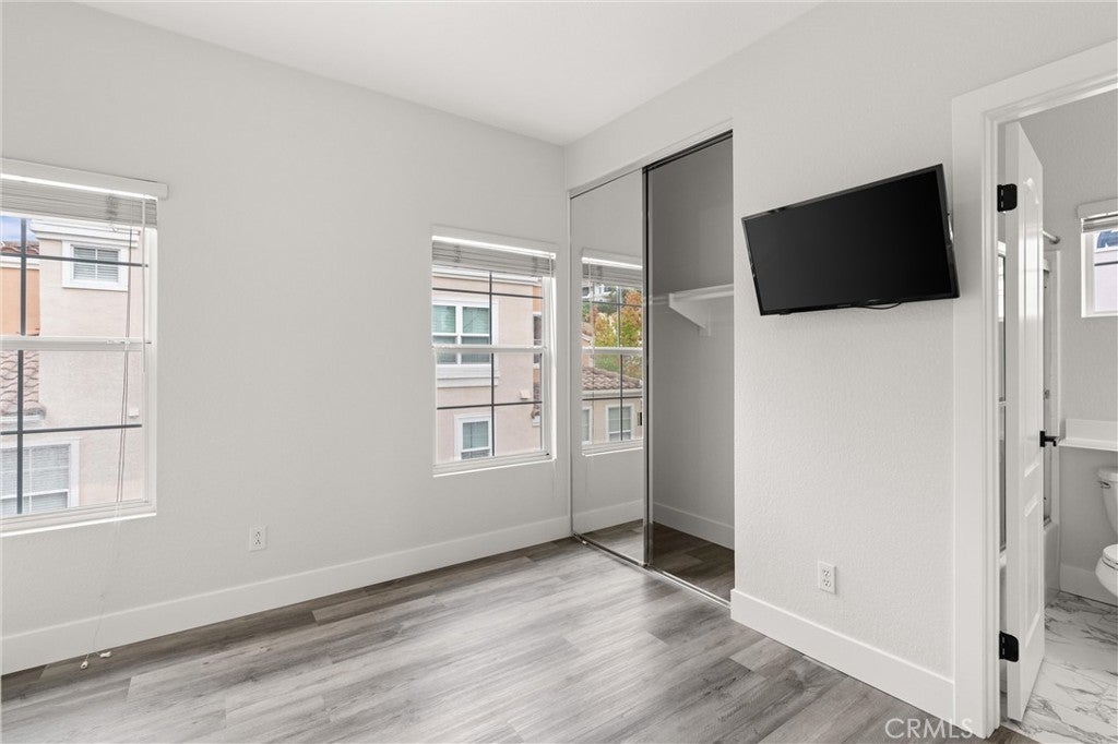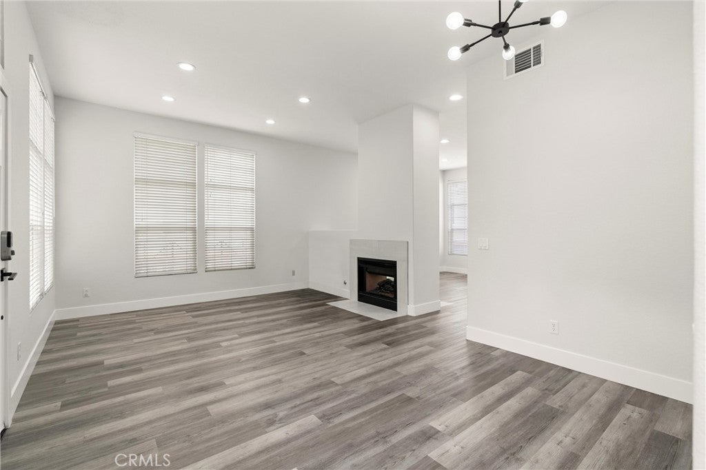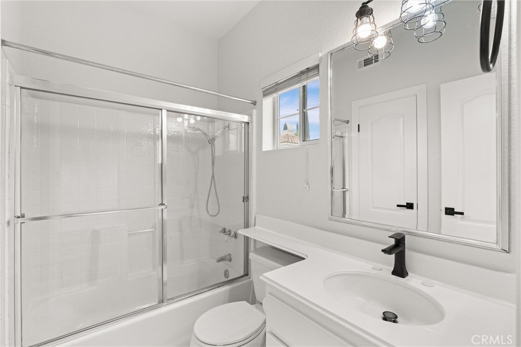Welcome to the largest floor plan available in the highly sought-after, quiet, and gated Summit Renaissance Community. This end-unit townhome has been thoughtfully upgraded throughout, offering both style and functionality. Step inside through a smart front door lock into a bright and open main living area featuring luxury vinyl plank flooring, 5-inch baseboards, fresh paint, and a stunning remodeled dual-sided fireplace. The layout seamlessly connects the den, dining area, family room, and kitchen—ideal for modern living and entertaining. The remodeled kitchen showcases a sleek waterfall-edge quartz countertop, a full subway tile backsplash, and stainless steel appliances. Custom-finished cabinetry includes matte black hardware and soft-close mechanisms, complemented by a large farmhouse sink for both beauty and utility. Just off the kitchen is a stylishly upgraded half-bathroom and direct access to the attached two-car garage. A whole-home water filtration system ensures clean, treated water throughout every tap in the house—perfect for healthy living, soft water, and peace of mind. Upstairs, you’ll find a completely carpet-free second level. The expansive primary suite is a standout, featuring both a walk-in and sliding closet, and a beautifully remodeled en-suite bathroom. The upgraded shower features sleek tile work, modern black fixtures, and a seamless glass enclosure. Dual sinks are set in an expansive quartz slab, complemented by elegant ceramic tile flooring and coordinated cabinetry. Two additional bedrooms share a convenient Jack-and-Jill bathroom, ideal for families or guests. Located within the prestigious Orange Unified school district and nestled in a peaceful, gated community, this smart, clean, and sophisticated home offers upscale living in one of Orange County’s most desirable neighborhoods.