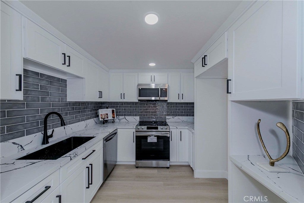Fully remodeled. Beautifully upgraded and ready for you to move in! Great floorplan with everything on one level. This unit has no one below - first floor space is the garage. All new pipes in plumbing, recently completed by the HOA for the community. This unit also has brand-new paint throughout, including doors and baseboards - an inviting white throughout living spaces, kitchen and bathroom. Kitchen has been completely updated with new cabinets, countertops, sink, backsplash, and stainless steel appliances. Dining room has swing louvre doors, providing enough separation to give you the option for a quiet office or temporary guest space. The bedroom is very spacious and includes a large walk-in closet. No mello-roos, low HOA and access to Lake Mission Viejo! Easy access to local shopping, dining, schools and parks.