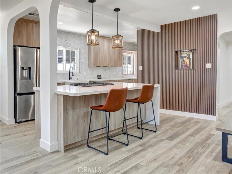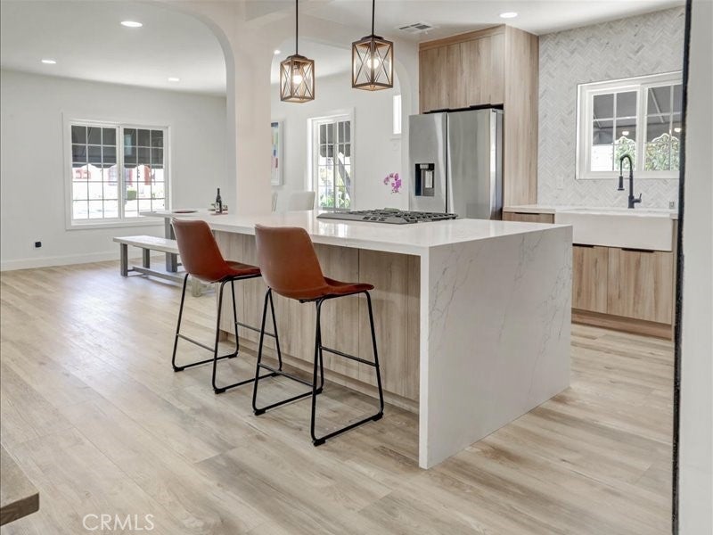 Ideal home for corporate rental/relocation, short or long term considered. Perfectly located in the heart of Anaheim’s Historic Colony District (this home may qualify for the Mills Act), this beautifully reimagined residence is a true showcase of design and craftsmanship. Every inch has been thoughtfully updated, blending timeless character with contemporary comfort. The open-concept floor plan creates an inviting sense of flow, anchored by a fully renovated kitchen that exudes sophistication—complete with high-end architecturally inspired finishes, marble backsplash, sleek quartz countertops, and a built-in coffee bar with beverage and wine coolers. Modern recessed lighting, new flooring, and refined architectural touches elevate the entire space. The expansive Great Room serves as the centerpiece—ideal for entertaining or relaxing in style—while three generous bedrooms and two full baths provide comfort and privacy. The third bedroom includes a private entrance, offering flexibility for an ADU, guest suite, or home office. A covered carport, detached garage, and extended driveway ensure plenty of parking. Perfectly positioned within walking distance to Pearson Park and the Anaheim Packing District, and just minutes from Disneyland, major freeways, and public transit—this home offers convenience, character, and charm in one exceptional package.