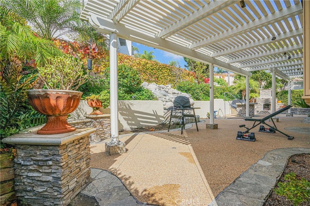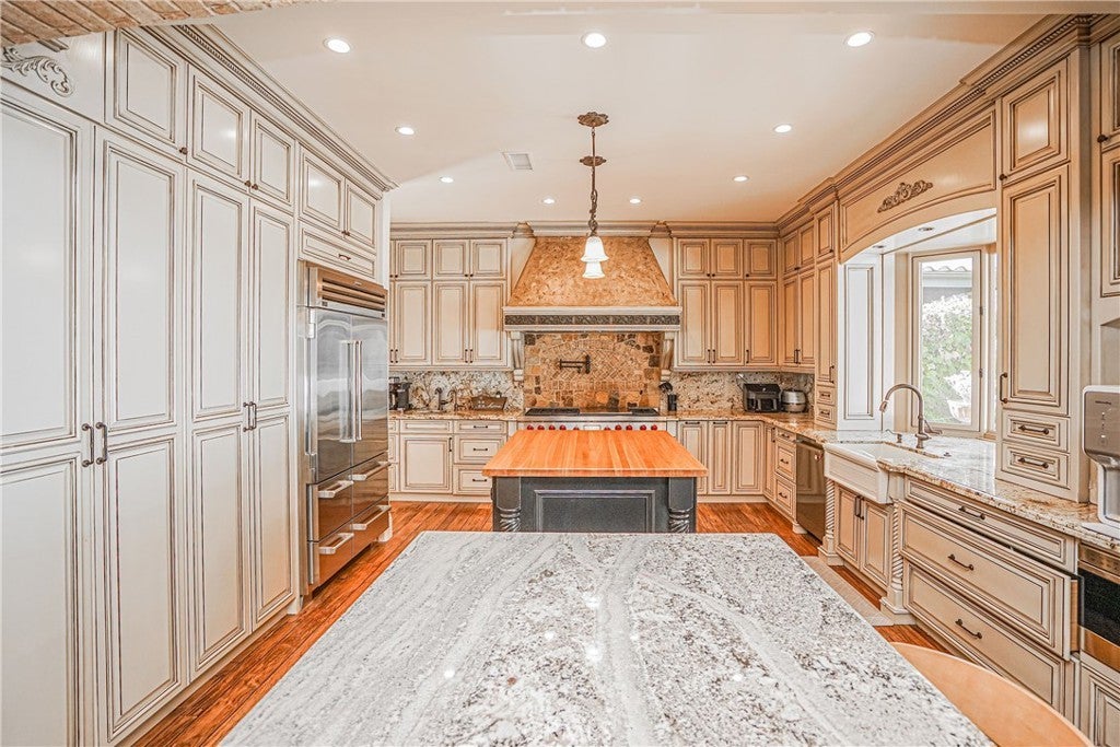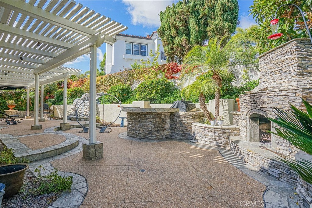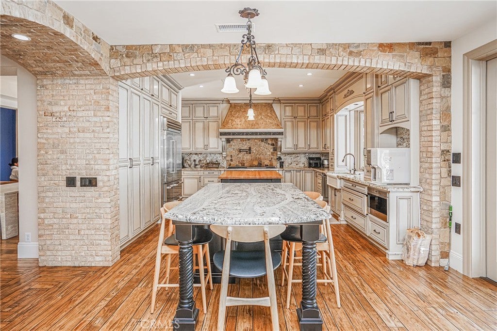 Welcome to 30951 Via Bravo, an elegant home situated inside the prestigious guard-gated Marbella Country Club Estates in San Juan Capistrano. Tucked away on a private cul-de-sac corner lot, this residence combines luxury design, comfort, and a premier country club lifestyle. The chef-inspired kitchen stands at the heart of the home, showcasing custom cabinetry, dual prep islands, professional Wolf appliances including a six-burner range with griddle and pot filler, double ovens, and a 48" Sub-Zero refrigerator/freezer. A farmhouse sink, reverse osmosis system, and bay window complete the space. The open floor plan connects the kitchen to the inviting family room, ideal for gatherings and relaxation. Upon entry, soaring beamed cathedral ceilings and hand-carved 3/4" hickory hardwood floors set a warm, sophisticated tone. The custom wrought-iron staircase leads to a private upstairs library lined with floor-to-ceiling cherry wood built-ins, perfect for reading or quiet work. The primary suite is a true retreat featuring 8-foot arched solid wood doors, dual copper sinks, a jetted jacuzzi tub, multi-head shower, bidet, and a spacious walk-in closet. Throughout the home, custom stonework and an integrated audio system enhance both style and function. Outdoor living shines with a built-in fireplace, rock waterfall, and BBQ bar area surrounded by lush landscaping—perfect for entertaining. The property includes a three-car garage and is move-in ready.