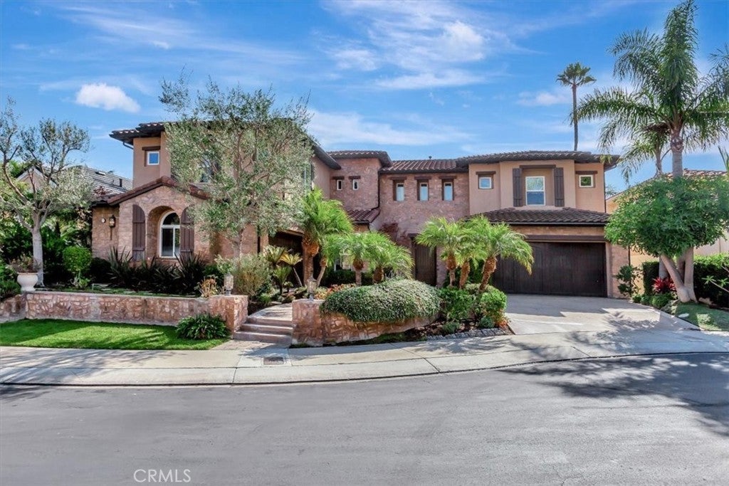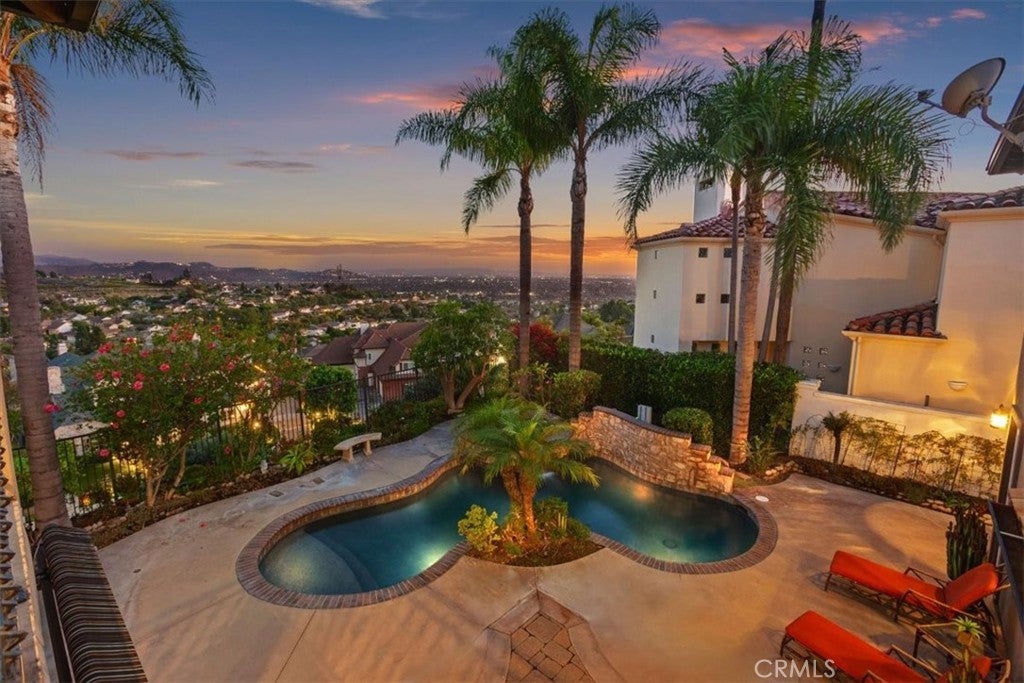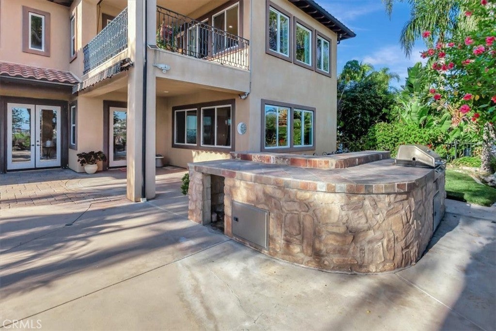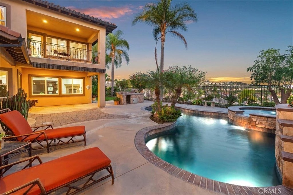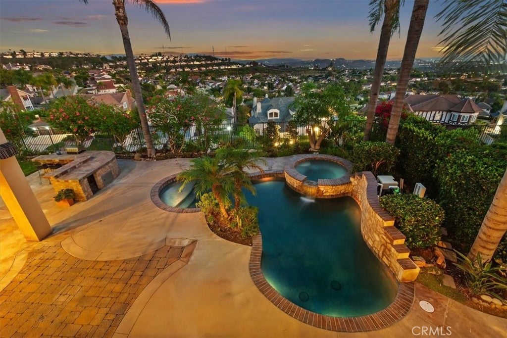 Tuscan Elegance with Panoramic City Views in Guard-Gated Hillcrest. Discover timeless sophistication in this stunning Tuscan-style estate built in 2005, offering 6,468 sq ft with 5 bedrooms, 5.5 baths, and a 4-car garage. The open-concept design connects the family room and gourmet kitchen featuring custom cabinetry, granite counters, prep sink, and professional-grade stainless appliances. A main-floor bedroom with en-suite bath provides ideal guest or multi-generational living. The primary suite includes a sitting area, double-sided fireplace, spa bath, and large deck with sweeping valley views. Enjoy resort-style outdoor living with a sparkling pool, spa, and built-in BBQ island surrounded by lush landscaping. Set on a cul-de-sac within the exclusive Hillcrest guard-gated community, this home defines refined Orange County.