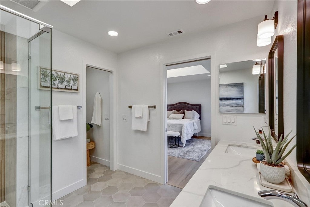 Modern coastal elegance in a prime La Jolla location! Tucked on a quiet street, this stunning single-story home sits on a spacious ~9,900 sq ft lot with 5 beds, 3 baths (incl. bonus suite) and approx. 2,847 sq ft of beautifully remodeled living space. New kitchen features Shaker-style soft-close cabinets, quartz countertops, countertop-to-ceiling backsplash, under cabinet lights, and stainless steel appliances. New baths, floors, paint, doors, and lighting throughout. The inviting primary suite offers a dual-sink vanity, freestanding tub, and frameless shower. Enjoy skylights, a cozy gas fireplace, peek-a-boo mountain views. Front yard features drought-tolerant landscaping with Wi-Fi–controlled drip irrigation and lighting, while the backyard offers artificial turf for a low-maintenance outdoor living. Finished garage with epoxy floors and long driveway. Brand-new energy-efficient heat pump HVAC system and ducts. Newer Dual Paned Windows. No HOA. Minutes to beaches, UCSD, and top-rated La Jolla schools. Link to video & 3D Matterport & more info: (https://blueskypixs.hd.pics/5515-Thunderbird-Ln/idx)