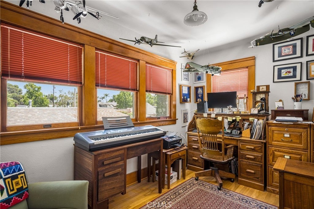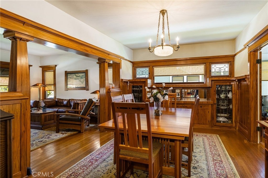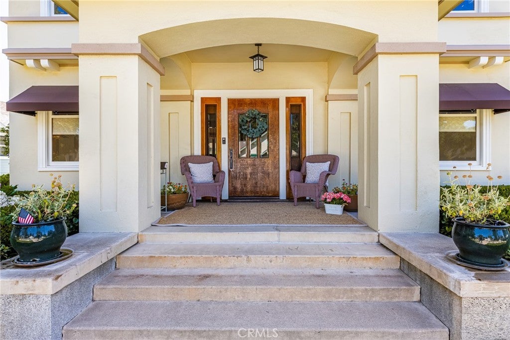 Welcome to this ICONIC 1921 Prairie Style home, meticulously designed to embody the essence of Frank Lloyd Wright's renowned architecture. Nestled on one of Old Towne Orange's most sought-after blocks, this residence is TURNKEY & sure to impress the most discerning buyer! Step inside to discover 4 bedrooms & 2 full baths, natural wood finishes, complemented by built-in cabinetry. A striking oak front door, flanked by sidelights, invites you into the warmth of the original hardwood floors. The open floor plan seamlessly connects the front living room to the formal dining room, boasting an exquisite built-in china buffet with original leaded glass, custom wood wainscoting & picture rails. The unique French doors lead to a private office/library, complete with built-in secretary, pull-out Murphy bed & ornate wood detailing including leaded glass cabinets & bookshelves. Enjoy moments of tranquility in the sunroom, featuring a coffered ceiling & full-length windows that offer serene views of the yard & pool area. A swinging door gracefully divides the dining room from the gorgeous kitchen, equipped with Wedgewood gas stove, kitchen island & wood-faced built-in refrigerator, crisper drawers & freezer. An original hideaway prep table adds nostalgia & practicality to the space, while black DuPont Zodiaq quartz countertops & shaker-style cabinets exude timeless charm. Upstairs you will find 4 bedrooms, including the primary bedroom with walk-in closet & private balcony, perfect for savoring the neighborhood view. Both bathrooms have been beautifully restored, featuring white tile, pedestal sinks, & showers over the tubs. The upstairs bathroom still retains its laundry chute, conveniently connecting to the main floor mudroom. A custom Dutch door leads to the breathtaking rear yard, featuring a remodeled resort-like pool/spa, complemented by a covered patio & numerous fruit trees. The large basement houses the updated HVAC system, water heater & ample storage space. The long driveway, graced with a Porte-cochere & side door entrance, extends to the detached garage. Recent upgrades include a NEW ROOF, copper plumbing repipe, newer rear sewer line & upgraded 200 amp electrical service panel. Fresh exterior paint & custom awnings add to the home's immaculate appeal, while the resurfaced pool/spa enhance the outdoor oasis. This property is eligible for the Mills Act property tax reduction program subject to approval. A RARE OPPORTUNITY to own this Historic Masterpiece!