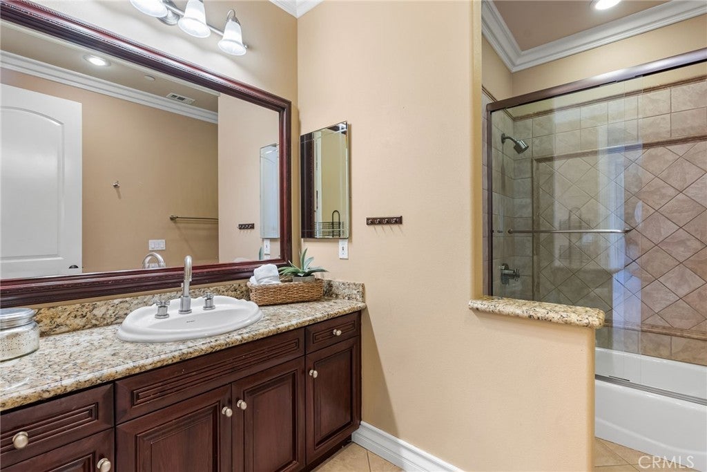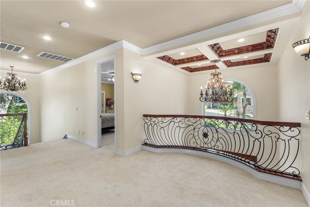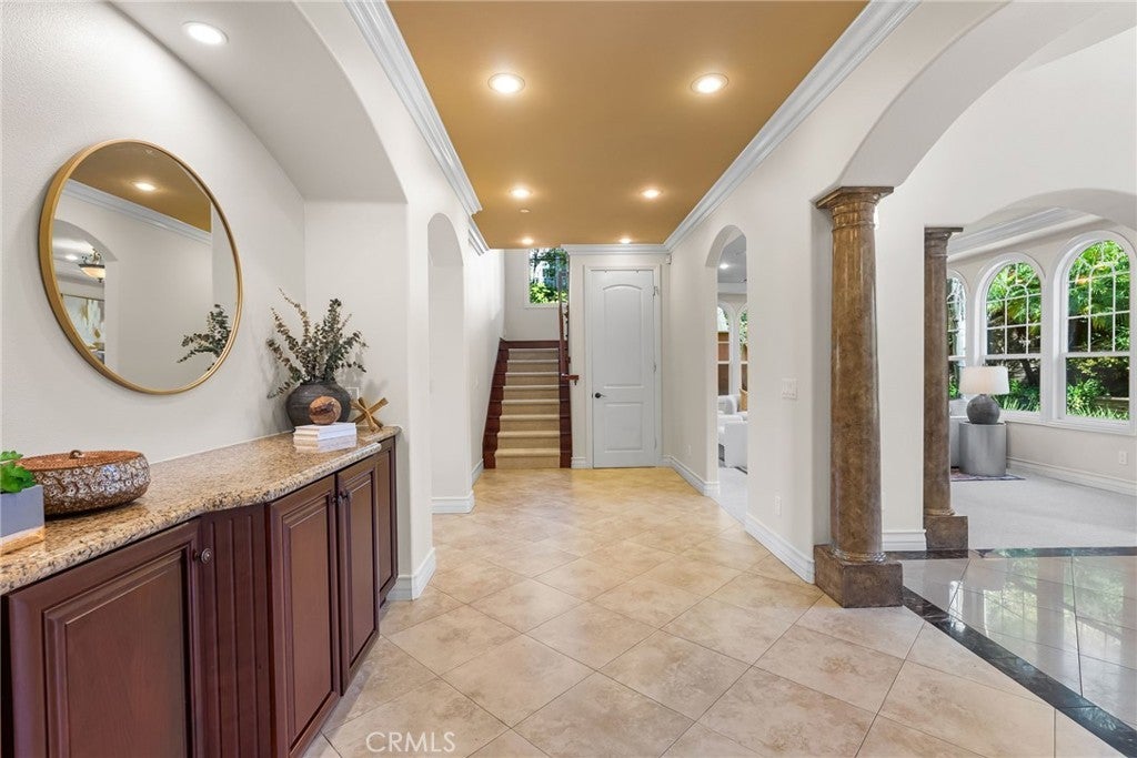 Bask in breathtaking sunset views from this beautifully refreshed North Tustin retreat, where mature palms grace the property and create a tranquil ambiance. Set on a private cul-de-sac, this home blends space, comfort, and timeless style with striking curb appeal. 5 bedrooms, 4 bathrooms, plus a detached office or flex space with 1/2 bath, and approximately 4035 sq. ft. of well-designed living space. 12941 Villa Rose Drive is made for both grand entertaining and everyday living. Step inside to a welcoming entry with formal living and dining rooms that set the tone for gracious gatherings. The heart of the home — a gourmet kitchen — features custom cabinetry, premier Viking stainless steel appliances including three ovens, expansive granite countertops, and coffered ceilings, all opening to a spacious informal dining area and a light-filled, wonderful great room with a cozy fireplace. From here, patio doors invite you to a backyard retreat with expansive patios and decks for dining and lounging, a built-in BBQ, and a grassy yard ideal for play or relaxation. A detached room with its own 1/2 bath adds flexible space for a home office, studio, play room, or creative escape. Upstairs, the primary suite captures stunning sunset views and includes a fireplace, walk-in closet, and spa-inspired bath with dual vanities. Three additional bedrooms, including one en-suite, and a bathroom complete the upper level, while a main-level bedroom and bath offer flexibility for guests or multi-generational living. Fresh interior paint, new carpet, and stone and wood flooring enhance the home’s inviting, move-in-ready appeal. Additional highlights include an oversized tandem three-car garage with a sink and storage galore, plus a convenient upstairs laundry room. Nestled within the award-winning Tustin Unified School District, this exceptional home blends generous living spaces, modern updates, and a peaceful location — where every evening ends with a North Tustin sunset.