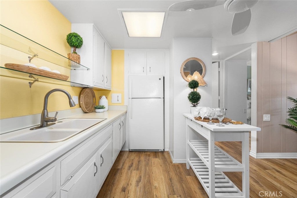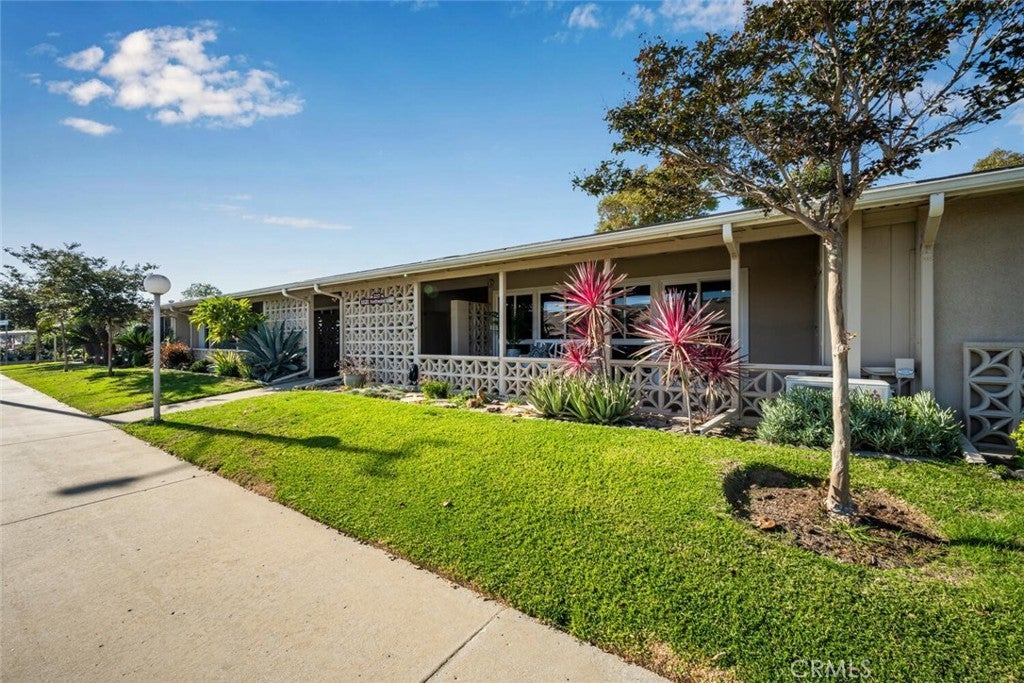 Welcome to this lovely drive-up 2 bedroom, 1 bath home ~ Mutual 9-237D ~ light and bright and move-in ready! You can sit out on your quaint gated patio to watch the sunset. The patio has ceramic tile, including built-in storage closets, and a large openable skylight, bringing in lots of extra light. The unit features white vinyl dual-paned windows, and a convenient sliding glass door in the primary bedroom that opens onto the patio. At the entry, there is a beautiful decorative entry door with leaded glass, adding so much charm and style. The kitchen, with a laminate countertop, electric stovetop and wall oven is well lit from natural sunlight through an overhead solar tube. Keep yourself cool in the summer with a sleek looking ceiling fan. In the bathroom there is a laminate countertop, cut-down shower, toilet and another solar tube. A wall mounted air conditioned and heated unit in the livingroom provides all year round comfort. The flooring is custom faux-wood vinyl plank in the primary bedroom, livingroom and kitchen, and laminate in the guest bedroom and bathroom. Besides the great parking right out front, the nearby carport parking is in building 106 space 34....Leisure World is a 55+ Senior community. Resort like, guard gated with lots of free amenities, par 3 golf, pickleball, bocce ball, pool and hot tub, state of the art gym, open-air amphitheater for live entertainment, 6 clubhouses with plenty of activities to keep you from getting bored. Located just 1.5 miles from the beach and Seal Beach Pier. Come and see your new place in Seal Beach!