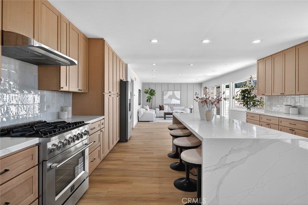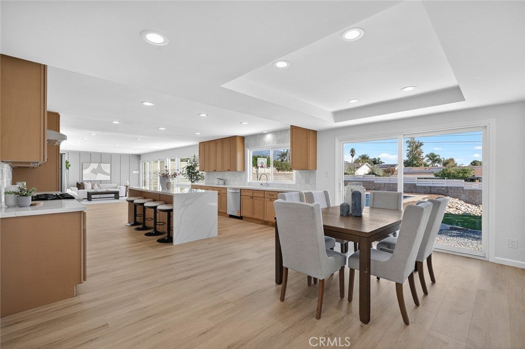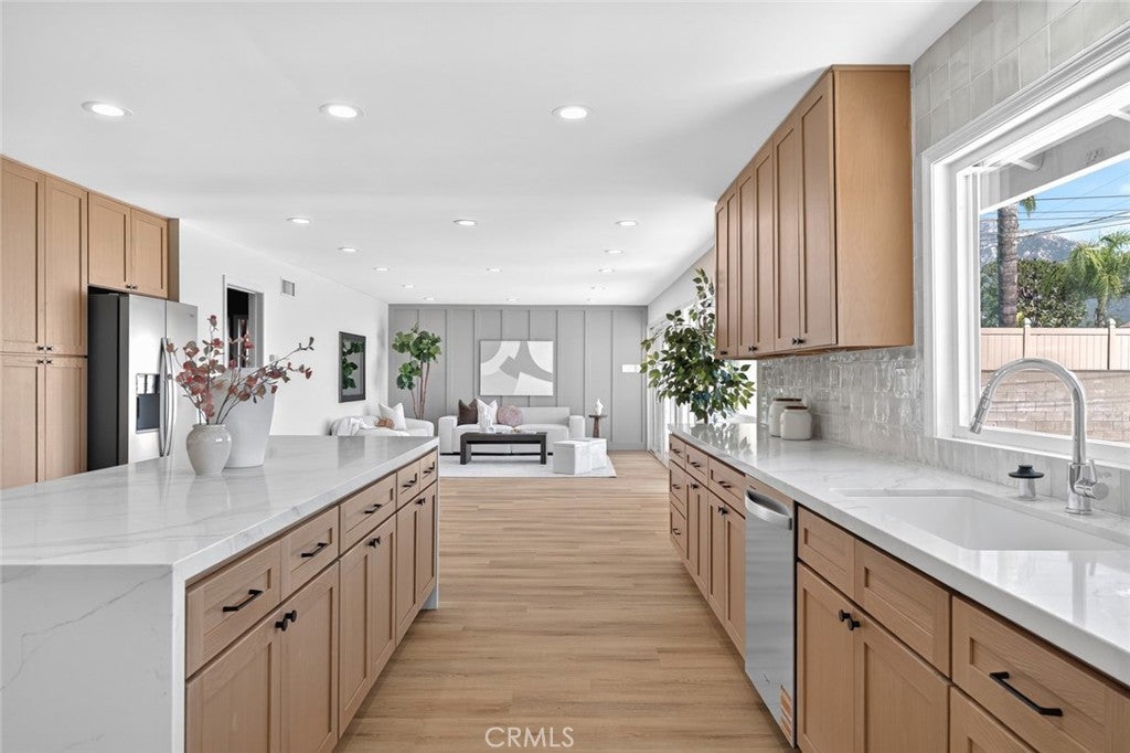 Nestled on a sprawling 15,000+ sq ft lot with breathtaking views of Mount San Antonio, this beautifully designed ranch offers indoor-outdoor living at its finest. The expansive yard features a sparkling pool, a court for recreation, alley access with a double-wide gate for possible RV parking, and plenty of room for entertaining. Inside, earth-toned finishes and warm tans create a nature-inspired palette throughout. The oversized kitchen is a chef’s delight with white oak shaker cabinets, elegant quartz countertops with subtle color veining, and a perfectly sized island ideal for gathering. New LVP flooring and recessed lighting flow through the home, enhancing brightness and a modern feel. Four spacious bedrooms are thoughtfully placed off the main living areas for added privacy. The primary suite includes a dual-sink vanity and a walk-in shower. Practical conveniences include an interior laundry room. A rare combination of generous outdoor space, thoughtful design, and panoramic mountain views — perfect for families, entertainers, and anyone seeking comfortable, single-level living in North Upland.