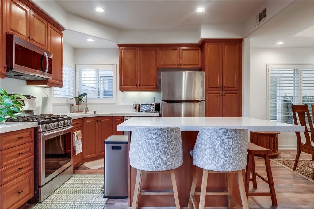 Welcome home! This lovely modern townhome feels like a single-family home, with bright rooms, on-site parking, and a short walk to Heartwell Park. Truly "Turn Key" condition, very fresh inside and out. Floor plan is wide open downstairs, pleasant entry into living room and dining room, with nice laminate flooring. Large island in the kitchen for your friends and family to gather around, great for parties or family time. Stainless steel appliances, gorgeous newer wood cabinets, and ample workspace for creating gourmet meals. All dual-pane, modern windows. Nice fixtures throughout. The enclosed private back patio is large enough for a BBQ, dining area, entertaining, and creating your own garden space. Upstairs features three bedrooms, including a large primary suite with its own spa-like bathroom: Dual-sink vanity, large tub, and separate glass-enclosed shower. Walk-in closets in two of the three bedrooms. Laundry in the upstairs hall, gas dryer. Full hall bath upstairs, and additional half bath downstairs. Extended, large 2-car garage is nicely finished, with room for two cars, plus a craft space, and lots of storage. The home is in excellent, move-in condition, and located in a very desirable area of Long Beach, with transportation corridors nearby, lots of shopping and dining options, and HUGE Heartwell Park just a few steps away: Bike path, walking, baseball, soccer, etc. all nearby, in a gorgeous tree-filled park.