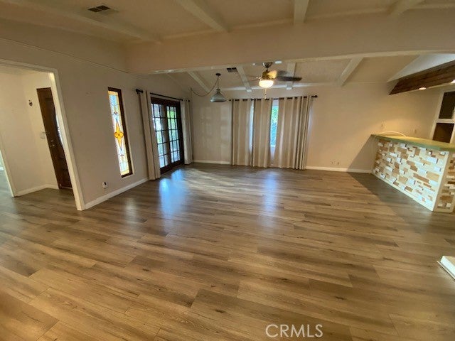 Beamed Ceilings, Built-in Features, Ceiling Fan(s), Cathedral Ceiling(s), Pantry, Recessed Lighting, Wood Product Walls, Main Level Primary, Walk-In Closet(s), Dry Bar, Laminate Counters