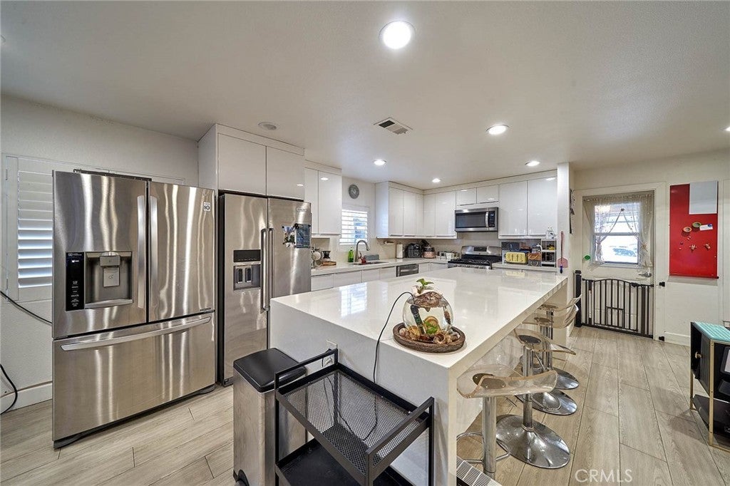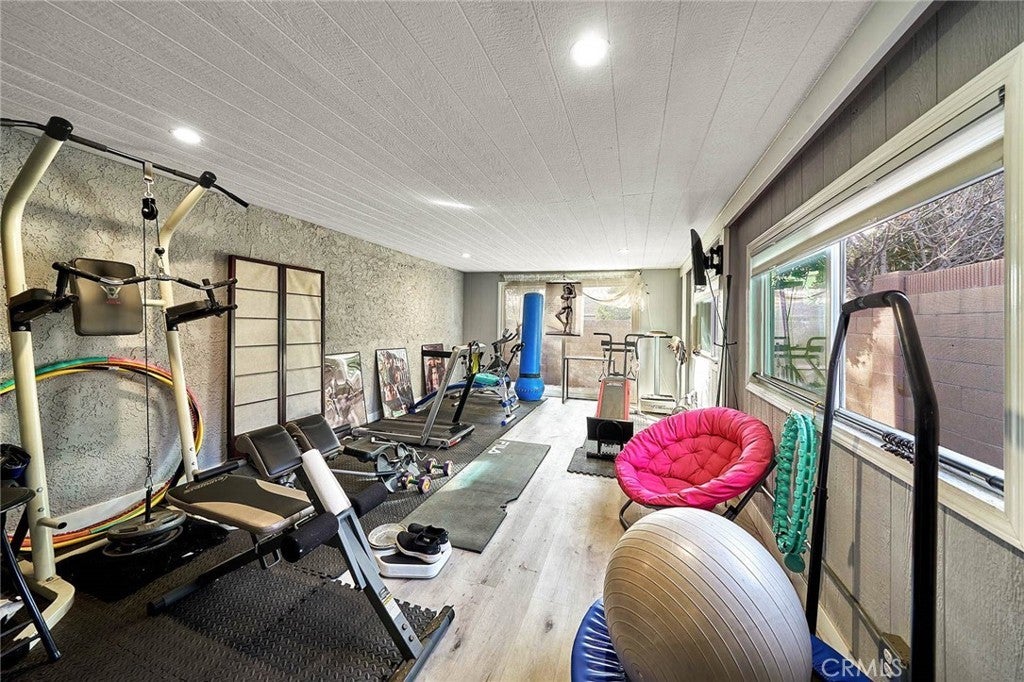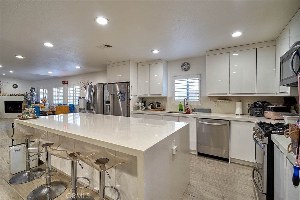 Welcome to the desirable area of Anaheim. This charming home with 4 beds, 2 baths and 1,822 sqft of living space is located in a serene neighborhood and a meticulously landscaped front yard and well-maintained lawn create an inviting entrance to the property. The driveway leads to a spacious garage. This property promises a blend of comfort and elegance, making it an ideal choice for homeowners who appreciate both style and convenience. This modern living room is a perfect blend of comfort and style, ideal for a contemporary lifestyle. The room is well-lit with recessed ceiling. With doors leading to other rooms, this living area promises easy navigation throughout the home. The cozy fireplace promises warmth and ambiance. Natural light floods in through the large windows equipped with shutters, illuminating the expansive floor space that is accentuated by modern flooring. This family room area offers comfort. This modern, spacious kitchen is a perfect selling point for the property and illuminated by natural light and recessed lighting, showcasing the pristine white cabinetry and gleaming appliances. A generous island with seating provides ample space for casual dining or entertaining guests. The open layout ensures easy movement and accessibility to all areas of the kitchen, while the contemporary design elements promise a blend of style and functionality that will appeal to prospective homeowners. Dining area beside the kitchen. Extra space gym area for exercise. This charming single-story home surrounded by beautiful neighborhood is waiting for the new owner. Do not miss the opportunity to make this home yours.