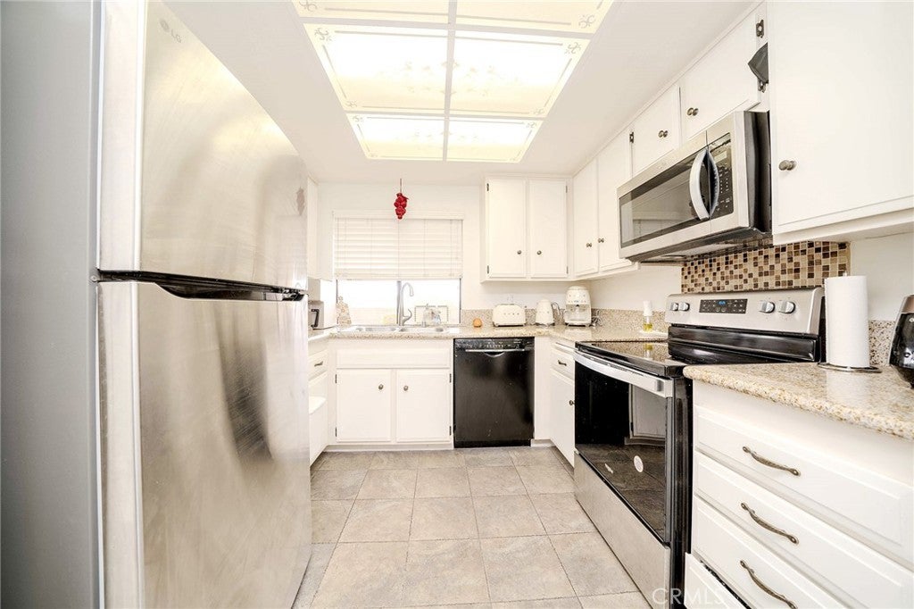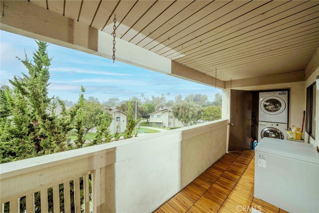Fantastic! Welcome to this beautiful home at the La Mirada Landmark 55+ Community! This a top floor unit that is also a corner with only one shared wall. Large balcony with enclosed utility room for laundry with washer and dryer coming with the property. Sweeping views of greenbelt, trees, mountains and more in most of the rooms in the home. High ceilings with laminate floorings, skylights, and large sliding glass doors let in a ton of natural light. Kitchen has all electric appliances, white cabinets with granite countertops. Large master suite with huge walk-in closet. Open floor plan with large dining room that opens onto living room. Detached one-car garage with remote control. Complex has 24 hour security guard gate, swimming pool, spa, recreation room with large kitchen, tennis courts, ping pong and picnic area and more! Located within walking distance to La Mirada golf course, and the La Mirada center for performing arts. Much more. A must-see!