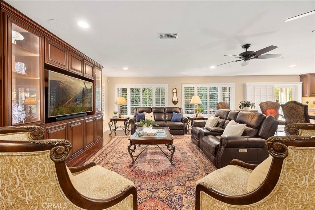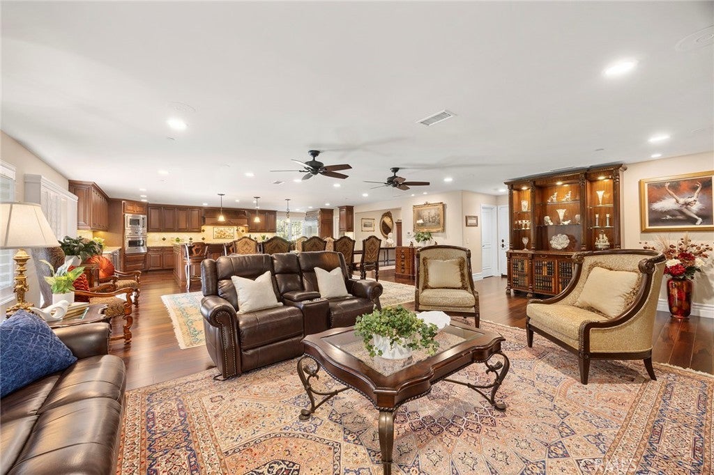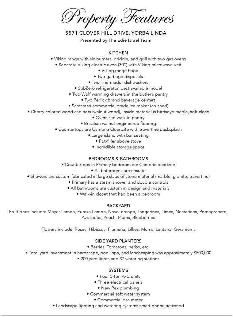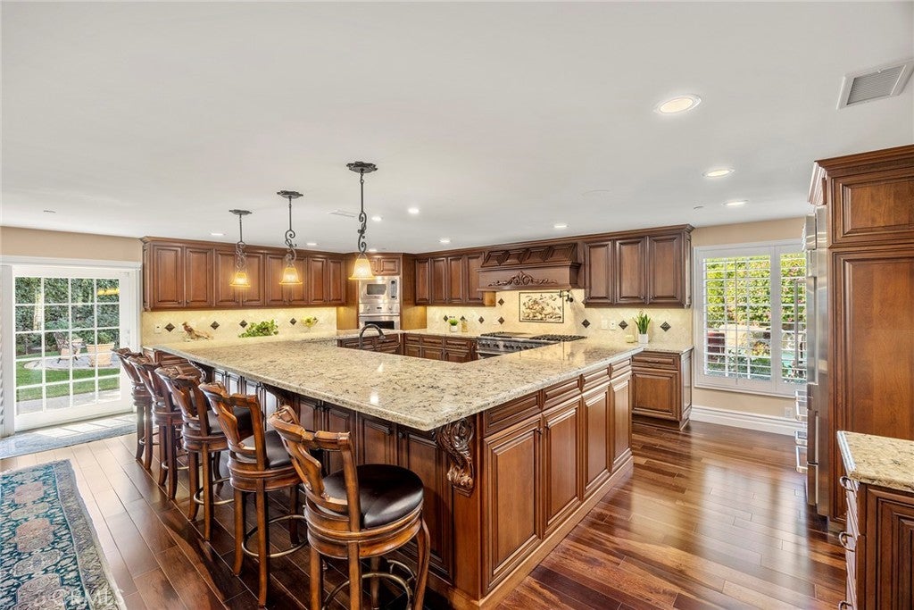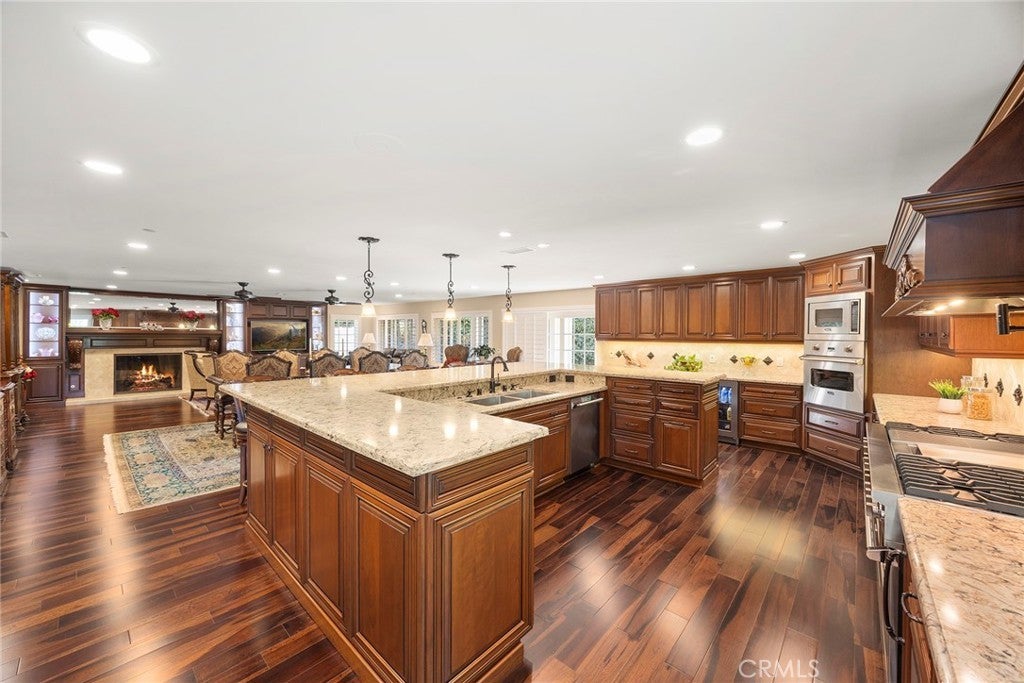 Welcome to a truly extraordinary estate home—an unforgettable blend of luxury, craftsmanship, and refined design. Completely reimagined with the finest materials, this residence lives like a brand-new custom build. Brazilian walnut floors, Cambria Quartzite surfaces, and exquisite Cherry wood cabinetry elevate every space. The chef’s kitchen is a masterpiece, showcasing an expansive island, generous storage, and premier appliances including a SubZero refrigerator, Viking professional range with dual ovens, Viking electric oven/microwave, dual Thermador dishwashers, two Perlick beverage centers, a Scotsman commercial ice machine, and three Wolf warming drawers. The kitchen opens seamlessly to the family room and dining area, creating an inviting environment for both intimate living and grand entertaining. Upstairs, the luxurious primary suite offers a cozy sitting area with a fireplace, a private balcony, a spa-inspired bath with a steam shower and soaking tub, and a spectacular walk-in closet. All additional bedrooms feature ensuite baths crafted with marble, granite, and travertine. A spacious bonus room, upstairs laundry, and flexible downstairs wing—ideal for a gym, guest quarters, office, or a potential ADU—add exceptional versatility. The backyard is an enchanting oasis, the product of a $500,000 investment. Surrounded by fruit trees and lush blooms, the resort-style pool, waterfall, spa, and firepit create a private paradise reminiscent of an English garden. This remarkable home must be experienced to be truly appreciated.