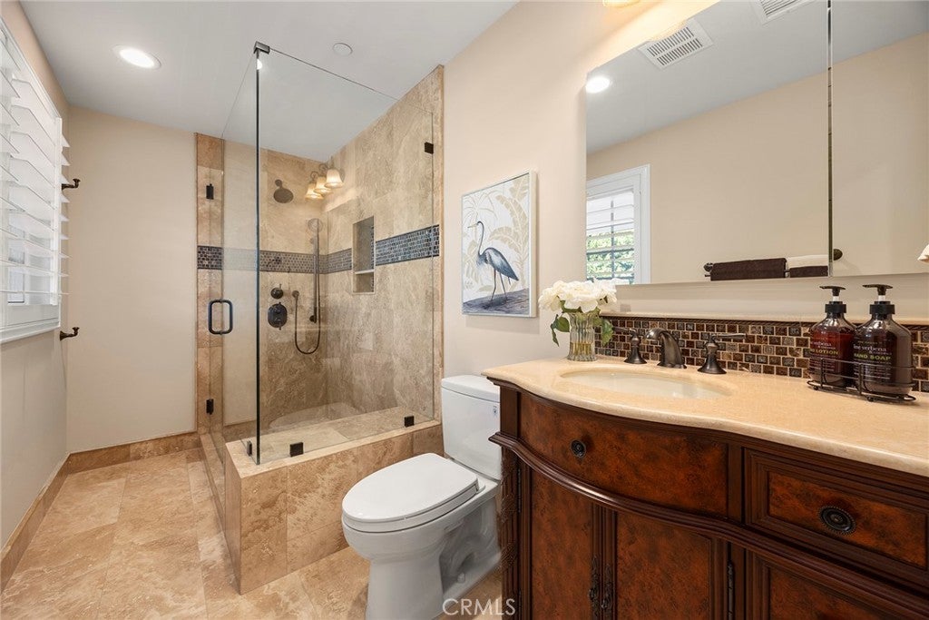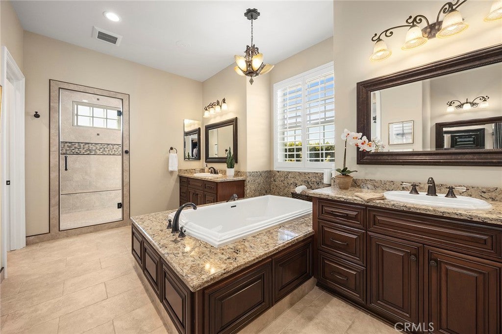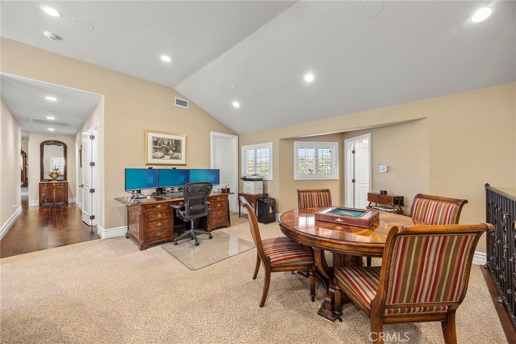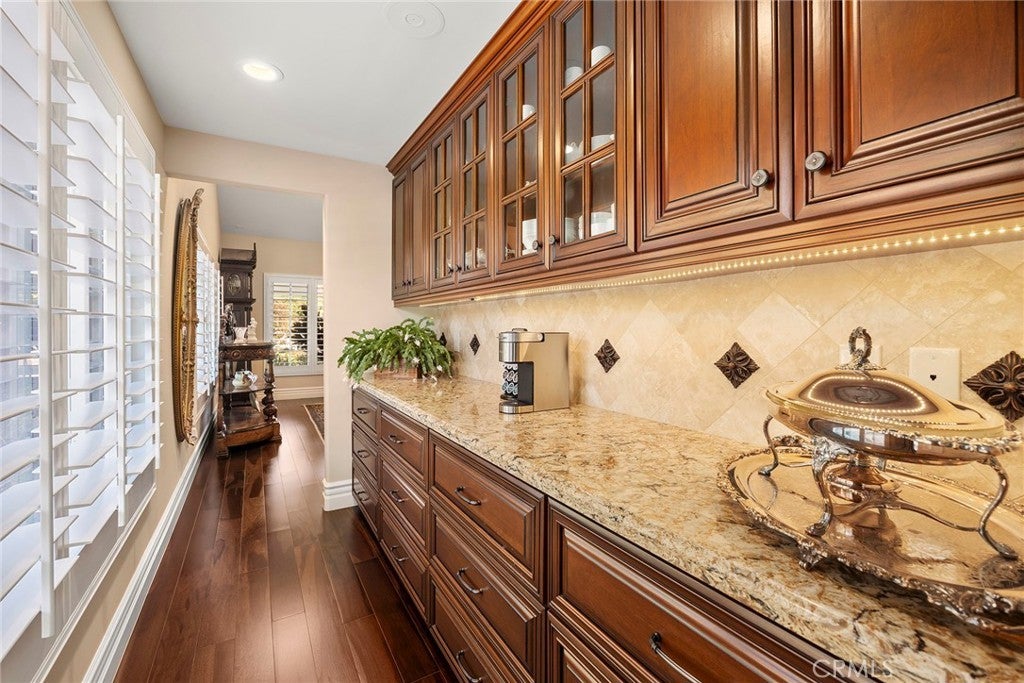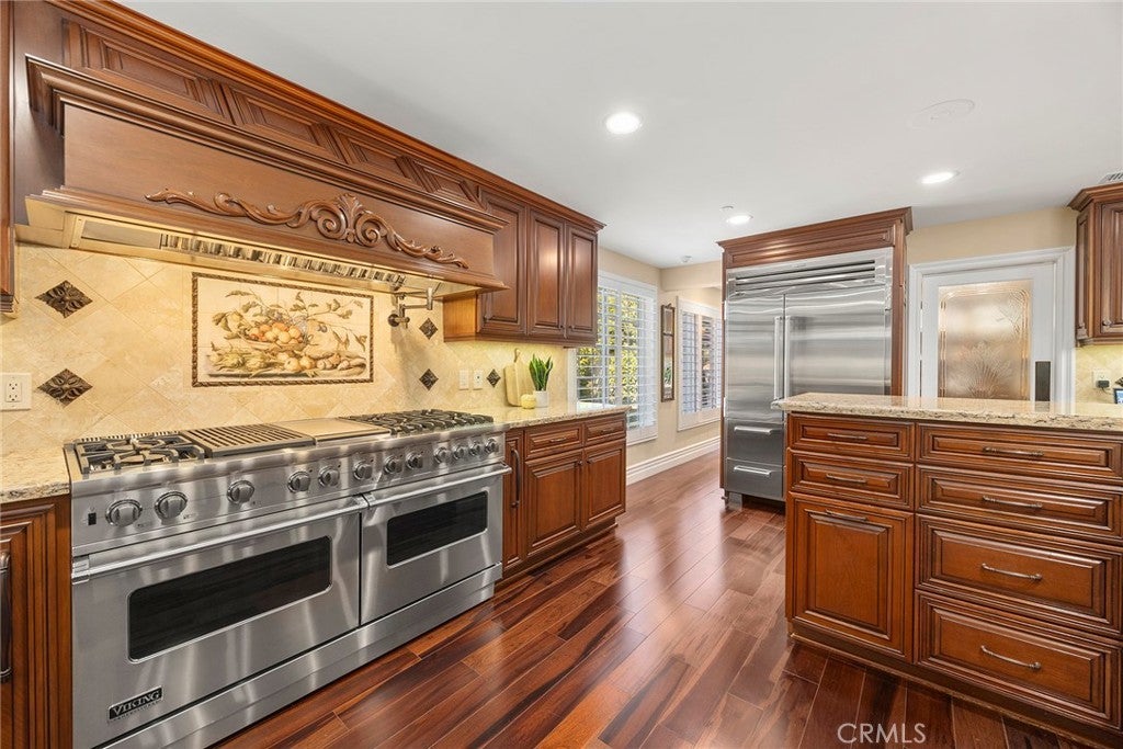 Welcome to a truly extraordinary estate home—an unforgettable blend of luxury, craftsmanship, and refined design. Completely reimagined with the finest materials, this residence lives like a brand-new custom build. Brazilian walnut floors, Cambria Quartzite surfaces, and exquisite Cherry wood cabinetry elevate every space. The chef’s kitchen is a masterpiece, showcasing an expansive island, generous storage, and premier appliances including a SubZero refrigerator, Viking professional range with dual ovens, Viking electric oven/microwave, dual Thermador dishwashers, two Perlick beverage centers, a Scotsman commercial ice machine, and three Wolf warming drawers. The kitchen opens seamlessly to the family room and dining area, creating an inviting environment for both intimate living and grand entertaining. Upstairs, the luxurious primary suite offers a cozy sitting area with a fireplace, a private balcony, a spa-inspired bath with a steam shower and soaking tub, and a spectacular walk-in closet. All additional bedrooms feature ensuite baths crafted with marble, granite, and travertine. A spacious bonus room, upstairs laundry, and flexible downstairs wing—ideal for a gym, guest quarters, office, or a potential ADU—add exceptional versatility. The backyard is an enchanting oasis, the product of a $500,000 investment. Surrounded by fruit trees and lush blooms, the resort-style pool, waterfall, spa, and firepit create a private paradise reminiscent of an English garden. This remarkable home must be experienced to be truly appreciated.