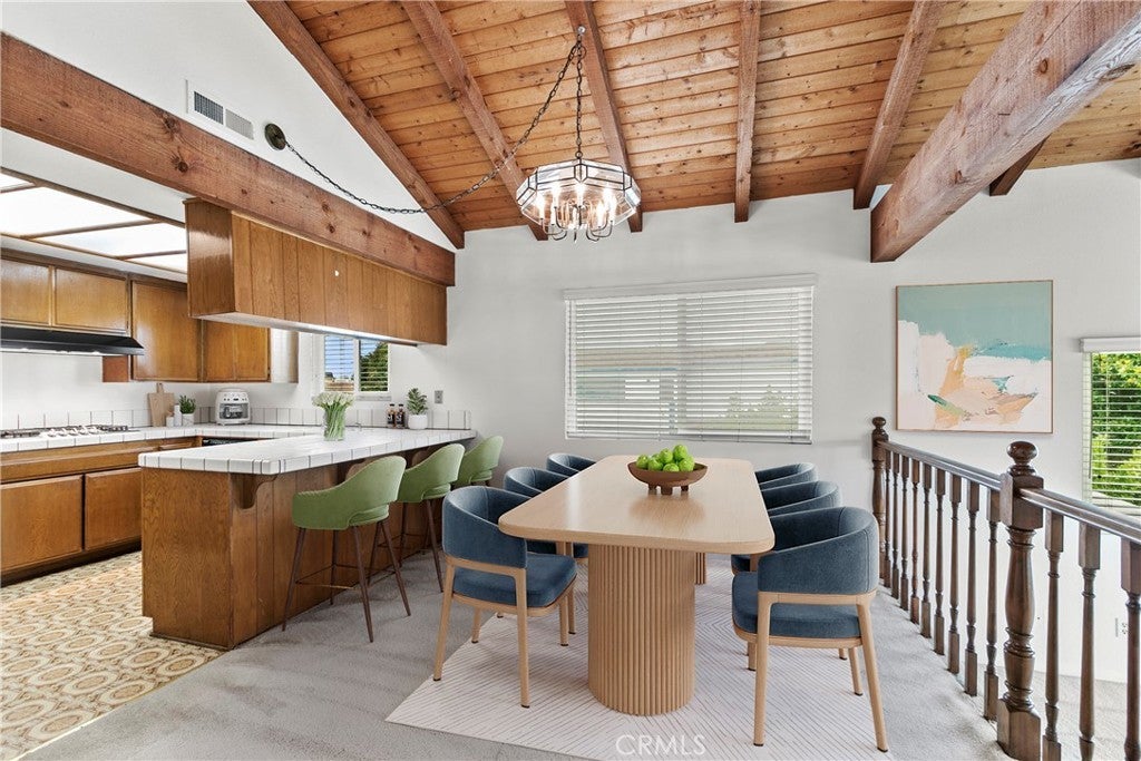 Beamed Ceilings, Breakfast Bar, Cathedral Ceiling(s), Separate/Formal Dining Room, Eat-in Kitchen, Open Floorplan, Pantry, Tile Counters, Bedroom on Main Level, Main Level Primary, Walk-In Closet(s), Ceramic Counters