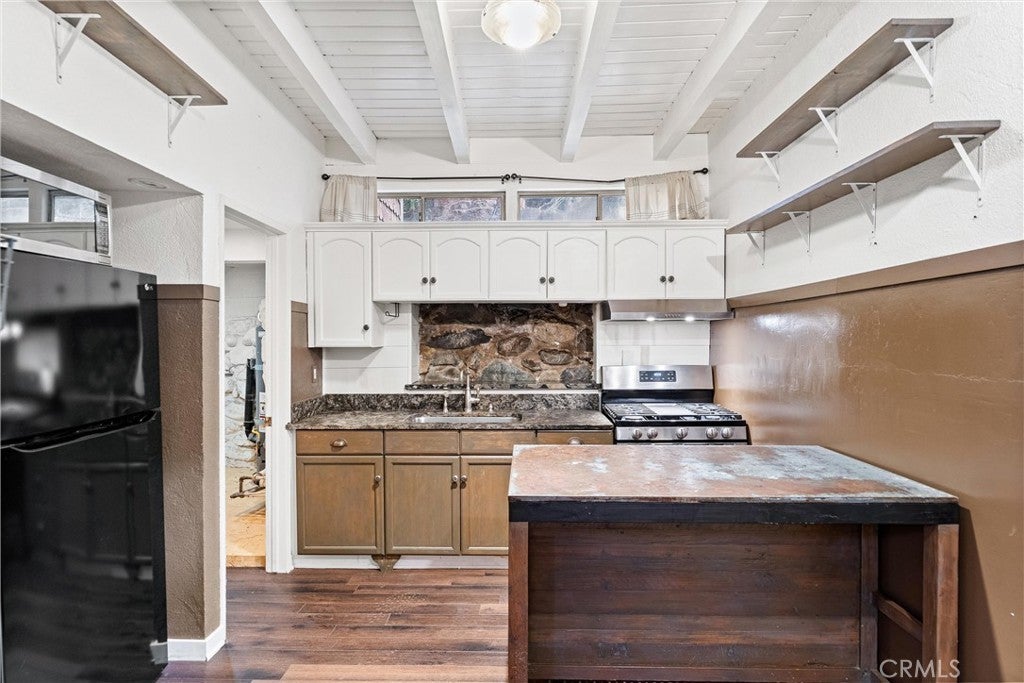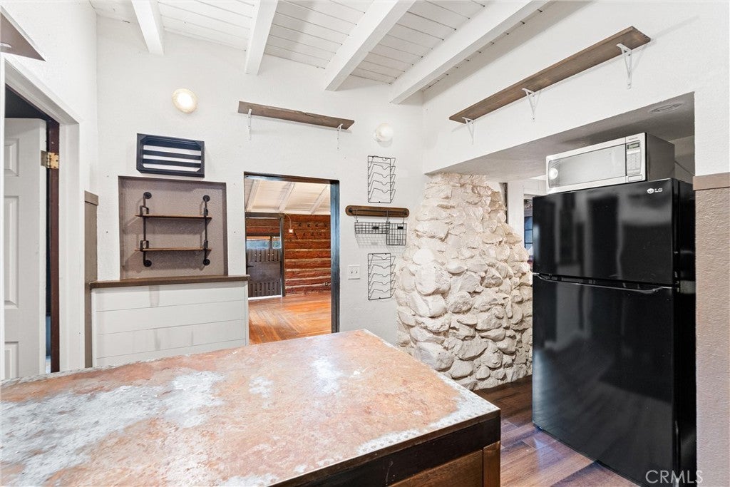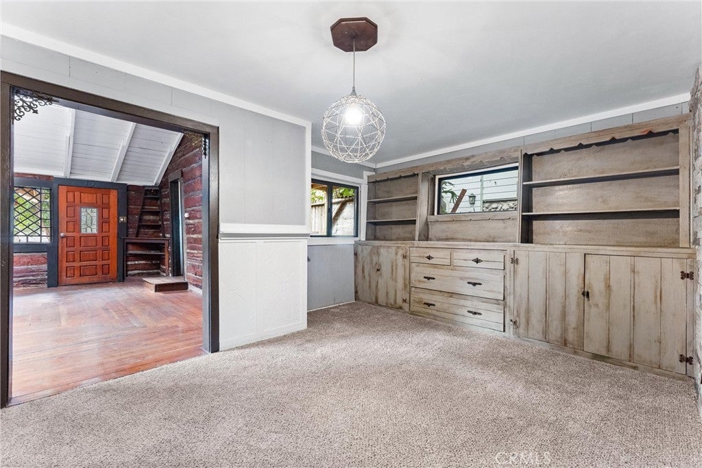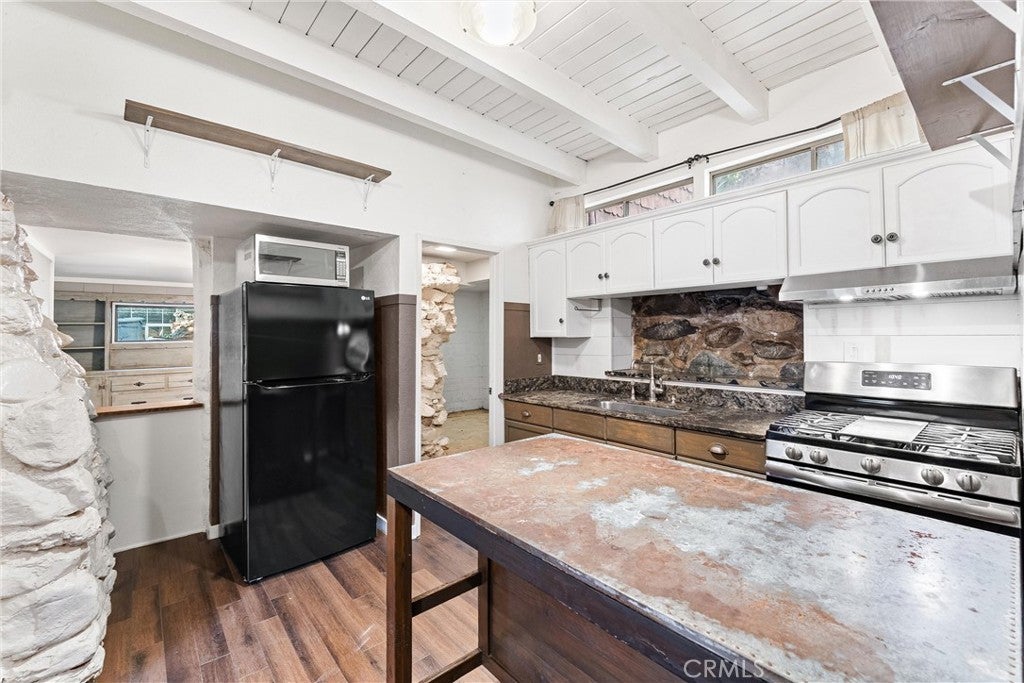 28751 Sycamore Drive, Silverado, CA 92676 is a rustic canyon retreat in the heart of Silverado Canyon, just minutes from Irvine, Foothill Ranch and the 241 Toll Road. Surrounded by mature trees, a seasonal creek and terraced outdoor spaces, this home offers a rare blend of nature, privacy and access to Orange County job centers and amenities. Per the assessor, 28751 Sycamore Drive is recorded as a 2 bedroom, 1 bathroom home. In addition to the two designated bedrooms, the property includes additional finished spaces that can function as a den, home office, studio or extra sleeping quarters, giving buyers flexible options for multi-use living, work-from-home needs or hosting guests. A wood and iron entry gate leads to a welcoming courtyard and elevated front deck with canyon views, a producing orange tree and space for lounging, grilling and outdoor dining. Inside, the main level features a spacious living room with high ceilings, log-style walls, hardwood floors and a wood-burning fireplace that creates a true cabin ambiance. A separate dining area with built-in buffet and stone accent detail connects easily to the remodeled kitchen, which offers white cabinetry, granite counters, an industrial-style center island and an adjacent utility / pantry room with full-size laundry. The main floor bedroom is wrapped in windows and includes a vintage built-in dresser, while the updated main-level bathroom has an exterior door for quick access to the side yard, pet area or garden. Upstairs, the additional finished areas provide multiple layout possibilities—ideal as a den, office, creative space or extra sleeping areas, depending on a buyer’s needs. These upper spaces give the home a “retreat level” feel without changing the assessor-recorded count of 2 bedrooms and 1 bath. Outside, the rear yard climbs above the seasonal creek with several terraced levels under the trees—perfect for entertaining, gardening, play areas or quiet relaxation while listening to the water and wildlife. The Silverado Canyon community offers a small-town atmosphere with local events, hiking and outdoor recreation, all while keeping you approximately 15 minutes from shopping, dining and freeway access. Property may qualify for USDA program (buyer to verify). Buyer to verify square footage, bedroom and bathroom count, permits, lot size, use, and all other information to buyer’s satisfaction with the appropriate professionals and authorities.