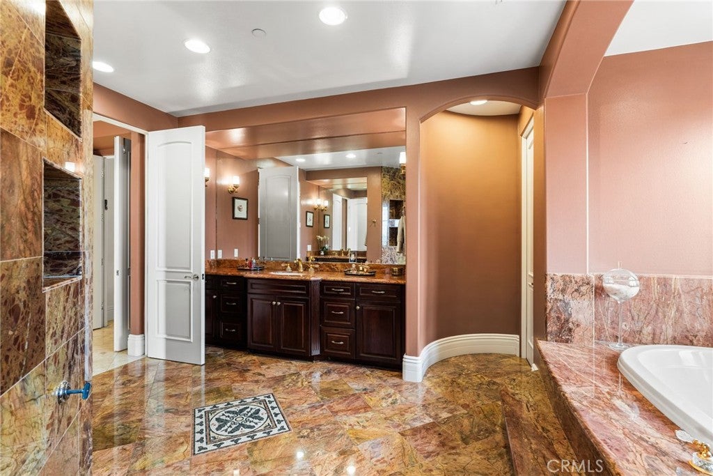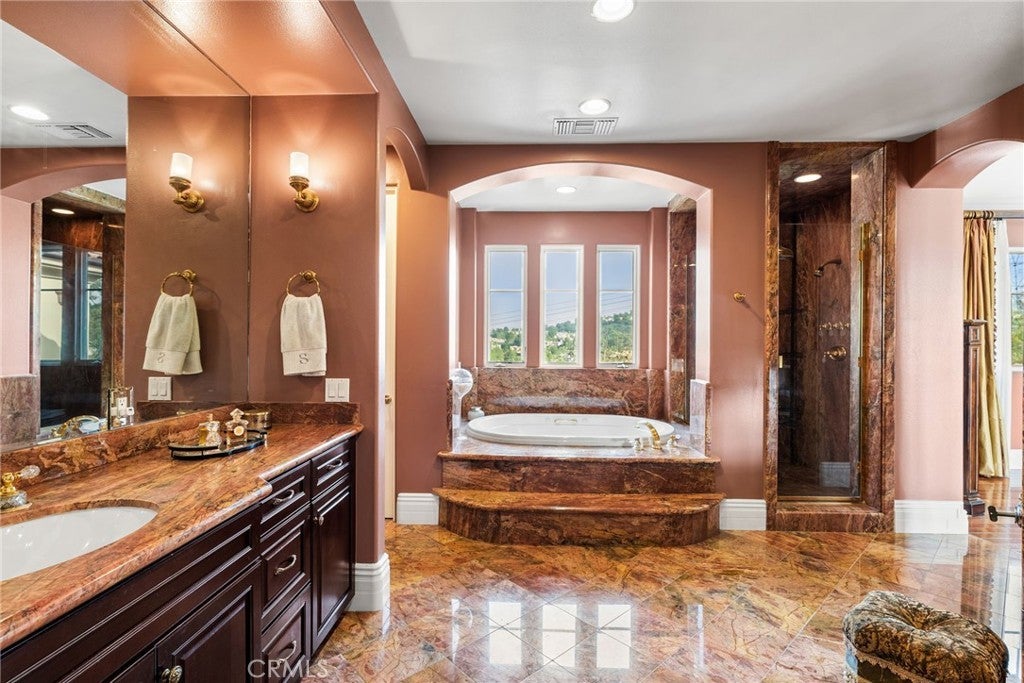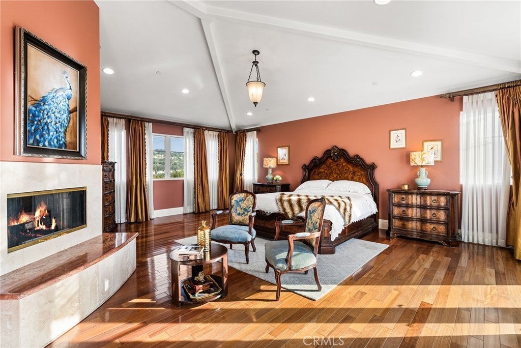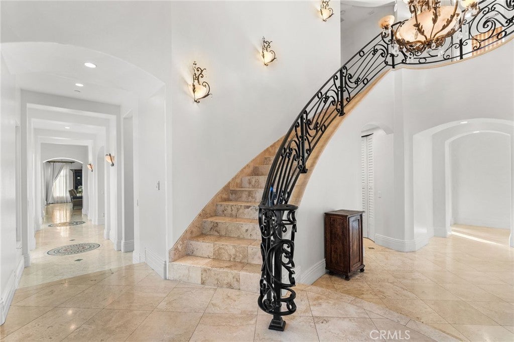 Set at the top of Mohler Loop in Anaheim Hills and just minutes from major shopping and dining, this beautiful Mediterranean home sits behind private gates and showcases sweeping canyon and hillside views. Soaring ceilings, abundant windows, and effortless indoor–outdoor flow create an inviting environment for both everyday living and elevated entertaining. Outdoors, you’ll find a relaxing fire pit lounge, a built-in BBQ area, charming patios with soothing fountains, and a sparkling saltwater pool—your own resort-style retreat. 4-car garage and plenty of gated driveway space for additional parking (totaling additional 1,038 SqFt) and additional bonus room basement room of 768 SqFt. For a total of 6,390 Sqft. Basement is fully built with travertine flooring, full sauna-spa bathroom, with standing shower and his & hers vanity. Perfect for a gymnasium, extra bedroom or theatre/wine room. Inside, the living room, kitchen and game room one can capture stunning city-light views. The main level offers a spacious chef’s kitchen equipped with Viking and Sub-Zero appliances, two private guest suites, a formal dining room, an elegant living room, and a grand staircase. Upstairs, the primary suite enjoys dramatic sunsets and hillside vistas, a luxurious bath, fireplace, and private balcony and two additional en-suite bedrooms and a flexible bonus room—ideal for a wellness studio, office, or craft space—provide plenty of versatility. With gated privacy, incredible views, seamless indoor-outdoor living, and exceptional flow, this home is designed for comfort, style, and effortless entertaining.