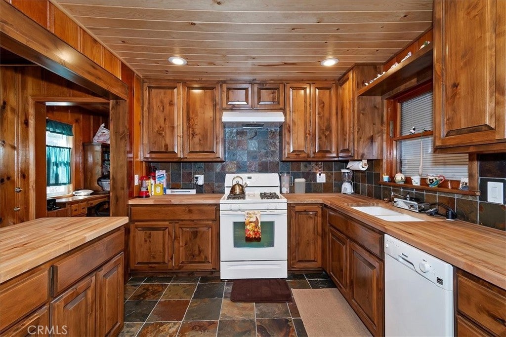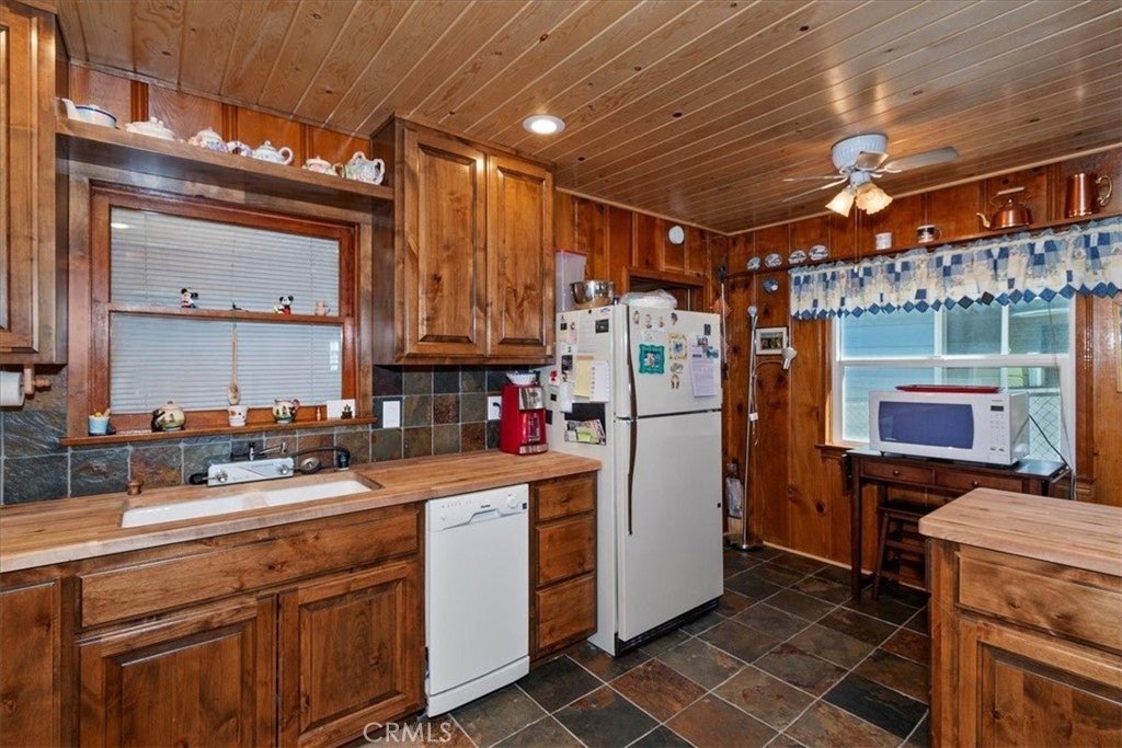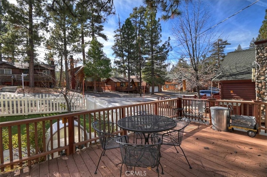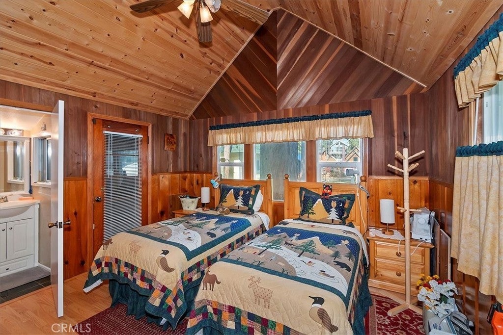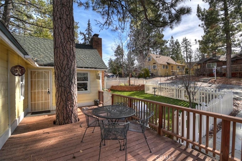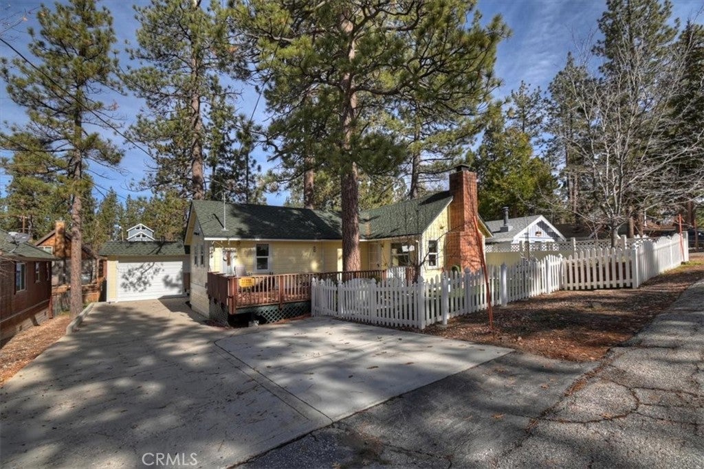 ESCAPE TO THIS CHARMING MOUNTAIN RETREAT IN THE HEART OF BIG BEAR LAKE! Ideally located just minutes from the lake, marinas, the Village, ski resorts, snow play, and all the best Big Bear amenities. Step inside and immediately feel the warmth of the knotty pine tongue-and-groove walls and ceilings, giving the home its timeless rustic charm. This inviting single-story layout offers an open living area anchored by a classic brick fireplace, along with a fully equipped kitchen featuring abundant cabinetry, butcher-block counters, and slate flooring. Two spacious bedrooms and updated slate-floored bathrooms provide comfort and convenience, along with washer/dryer hookups. A two-car detached garage offers even more versatility with its freestanding wood-burning stove and convenient half bath. Enjoy the low-maintenance front yard with white vinyl fencing, synthetic turf, and Trex-style decking—perfect for year-round enjoyment. Southern exposure ensures quick snow melt, and the large driveway provides plenty of off-street parking. A sizable storage shed in the backyard adds even more functionality. Whether you're seeking a full-time home, a weekend escape, or an income-producing investment, this mountain gem is ready to welcome you.