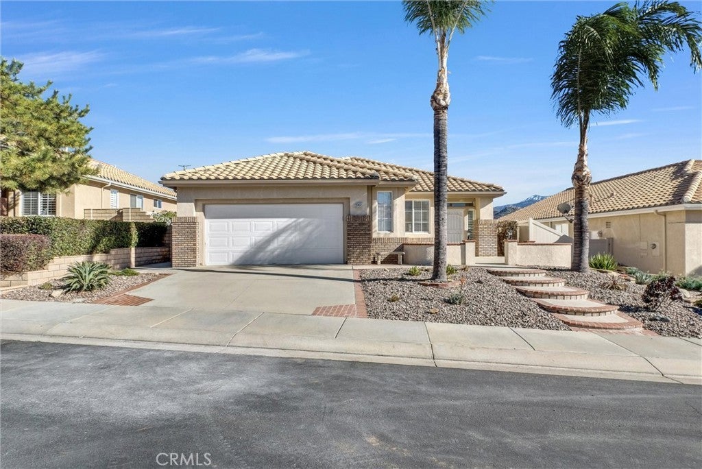 Beautifully updated Jasmine floor plan with mountain views, privacy, and modern upgrades. This highly sought-after and rarely available Jasmine model is one of the most desirable floor plans in the community. Located on a quiet cul-de-sac with beautiful mountain views and no rear neighbors, this updated home offers comfort, privacy, and easy single-story living. The front yard features low-maintenance rock landscaping, while the backyard includes brand-new synthetic grass installed in 2025. The spacious front patio is perfect for enjoying sunsets and mountain views. The backyard also features a fully covered patio ideal for outdoor dining or entertaining, along with four dwarf fruit trees—lime, tangerine, orange, and lemon—set in attractive brick-lined flower beds. Inside, the home features brand-new interior paint, 9-foot ceilings, and abundant natural light. The large open living room creates an inviting entry experience. Just off the entry is a versatile private room, perfect for a home office or flex space, with two windows providing great natural light. The open kitchen and family room feature Corian countertops, stainless-steel appliances, gas cooking, and a natural-gas fireplace with electronic starter. The layout flows seamlessly to the covered patio through 8-foot sliding doors from both the kitchen and primary bedroom. Additional upgrades include recessed lighting, a hallway sunlight tube, new 2-inch blinds, wood shutters in the living room, and outdoor sunshades on the family room and kitchen nook windows. The home includes an updated A/C and heating system (2021) with smart thermostat and an updated water heater (2021). The primary suite features a walk-in shower, dual sinks, private toilet area, crisp white cabinetry, Corian countertops, and a generous walk-in closet with mirrored doors. The guest bathroom includes Corian countertops and a bathtub/shower with clear glass door. Additional features include an indoor laundry room with cabinetry, updated door hardware, and an oversized two-car garage with additional golf cart parking and an EV charging plug. Sun Lakes is a vibrant 55+ resort-style community offering two golf courses, three clubhouses, pools, tennis, pickleball, fitness centers, restaurants, walking trails, and an active social lifestyle. Conveniently located near shopping, dining, Morongo Casino, Desert Hills Premium Outlets, and Palm Springs.