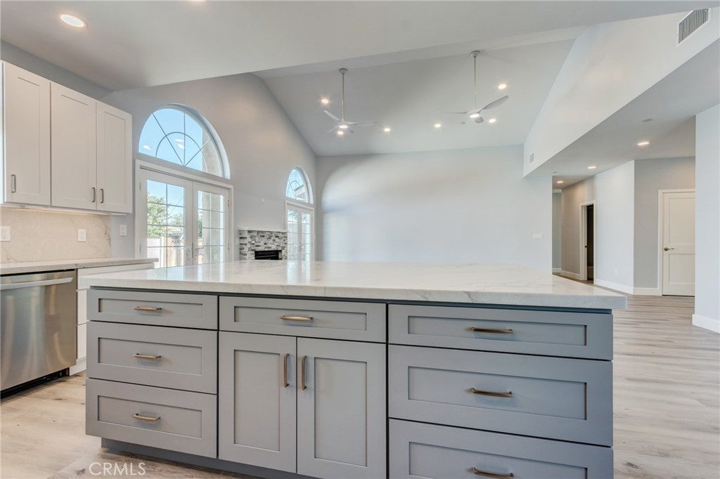 Open Floorplan, Quartz Counters, Recessed Lighting, Walk-In Closet(s), Bedroom on Main Level, Cathedral Ceiling(s), Ceiling Fan(s), High Ceilings, Main Level Primary, Pantry