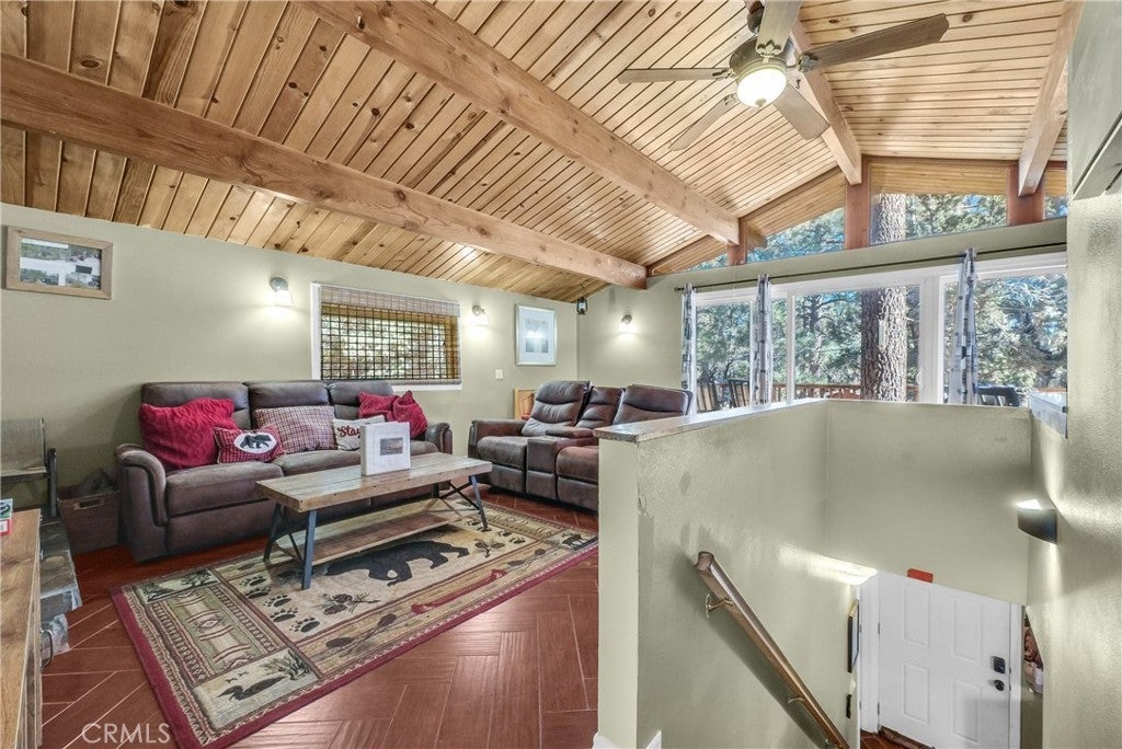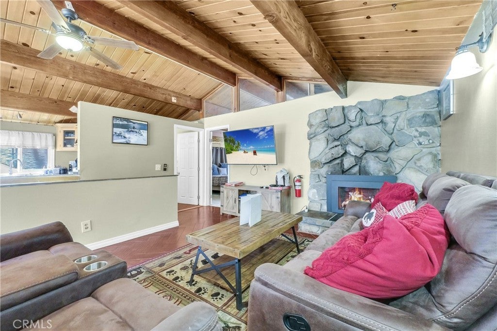 Charming Sugarloaf Big Bear Retreat – Spacious 5-Bedroom Home! This inviting single-family home in the desirable Sugar Loaf area offers plenty of space and comfort with 5 bedrooms and 2 full baths. Enjoy an expansive open floor plan featuring two large living rooms, each with its own fireplace—including a brand-new gas fireplace inserts that provides exceptional warmth and ambiance. Perfect for gatherings, the home boasts a large wood deck off the family room, ideal for entertaining, plus a private deck off the primary master bedroom for peaceful morning coffee or evening relaxation. With four bedrooms located downstairs and one spacious master bedroom upstairs, this layout comfortably accommodates large groups and makes an excellent full-time residence, vacation home, or potential rental property.