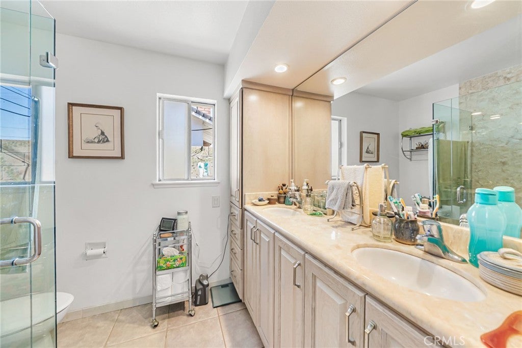 Welcome to the influential home tract. This 5-bedroom 3-bath has a very functional floorplan. The semi-circular driveway leads to an oversized 2 car garage with laundry and direct access into the home or the staircase to the upstairs featuring 2 bedrooms and 1 bath with a wall of storage and built-ins. Great area to have separate living quarters with a door! The formal entry leads to a large living room with a stone fireplace and french doors out to a covered alumawood patio, a trouble-free solution to a wood-like patio made out of white aluminum. The rear yard features raised planters and a dual-use extra-large tuff-shed. A family kitchen allows for a large seating area with a mobile island that can be tucked away or used to prepare meals with stainless appliances, including a built-in microwave, convention oven, dishwasher, and built-in gas range. Euro-white cabinets with white granite counters. 3 bedrooms on the main level, the primary bedroom has french doors out to the covered patio and its own ensuite bath with glass shower, dual sinks, and lots of storage. The other 2 bedrooms have a full bath with dual sinks,a soaking tub with a hand-held shower. Central heating and air keep the home comfortable all year long. close to award-winning El Modena High School, shopping, parks, and close to freeways.