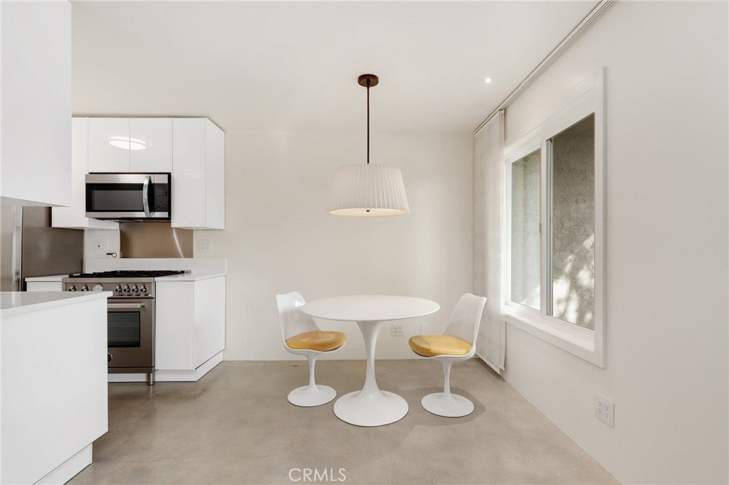 Welcome to this beautifully updated 1 bedroom 1 bath condo at 1125 Pico Blvd 109 offering modern comfort, thoughtful upgrades, and an ideal Santa Monica lifestyle. This residence has been completely remodeled with fully insulated walls for improved energy efficiency and sound reduction, newer vinyl windows, and a newer vinyl sliding glass door that fills the home with natural light and opens to the oversized balcony. Polished concrete floors deliver a clean, contemporary look that is both stylish and easy to maintain. The remodeled kitchen features modern cabinetry and stainless steel appliances including a Bertazzoni Professional series gas range, microwave hood combo, and refrigerator, and flows seamlessly into the dining area where the Saarinen table and iconic Tulip chairs are included in the sale, complemented by a Rejuvenation light fixture that beautifully anchors the space. The spacious living room opens directly to the balcony facing Pico Boulevard with a peek-a-boo ocean view through the palm trees, creating the perfect spot to enjoy morning coffee, evening drinks, or relaxed people watching. A short hallway leads to a flexible work-station that can be converted to a stackable in unit washer and dryer, recently approved by the HOA, and for those who choose not to install in unit laundry, the community laundry room is conveniently located immediately adjacent to the unit and is accessible without climbing any stairs. The luxurious full bathroom is appointed with Kohler fixtures and a deep 60 gallon soaking tub and shower combo highlighted by a ceiling mounted rain style shower head. Storage is abundant with a hallway closet and a walk-in closet in the bedroom, which is tucked privately at the end of the hall. The unit offers step free access with a gated ramped entrance from quaint 12th Street that leads directly to the condo without climbing a single stair. Additional features include one dedicated underground parking space and a private lockable storage area nearby. Located less than a mile from the beach and just a short stroll to restaurants, parks, schools, and shops, this home delivers the best of Santa Monica living while offering outstanding value in a highly desirable coastal community.