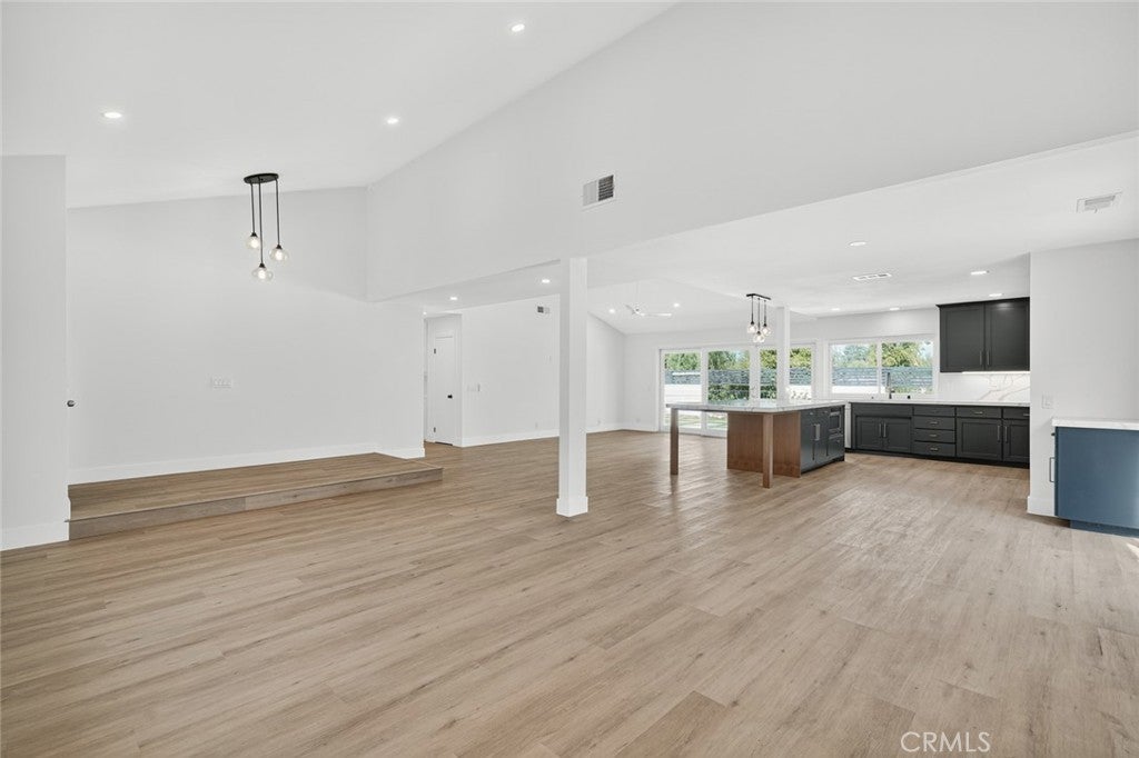 Discover this beautifully designed 4-bedroom, 2-bathroom single-story home offering 2,038 sq ft of open and inviting living space. The open floor plan is filled with abundant natural light from large glass doors and multiple windows, creating a bright and airy atmosphere throughout. The kitchen is both stylish and functional, featuring a center island perfect for casual dining, along with ample counter space and generous storage. The living room serves as a stunning focal point with a dramatic floor-to-ceiling fireplace, ideal for relaxing or entertaining. Situated on a spacious 9,583 sq ft lot, the exterior is equally impressive with a modern permeable patio and a large in-ground pool that thoughtfully wraps around the corner of the home, maximizing outdoor living space. This home seamlessly blends comfort, design, and indoor-outdoor living.