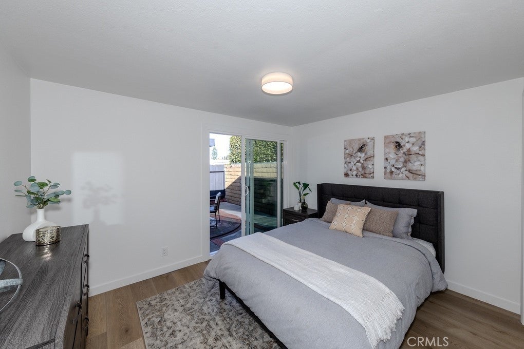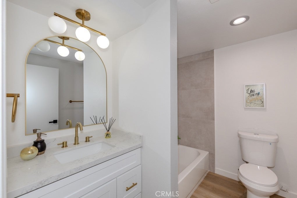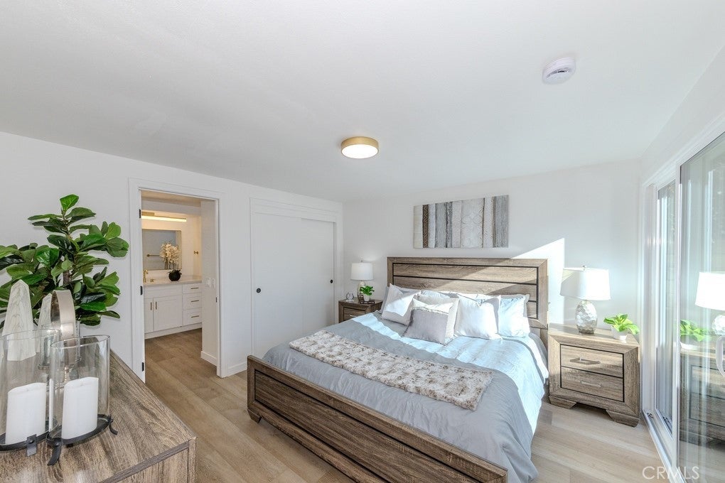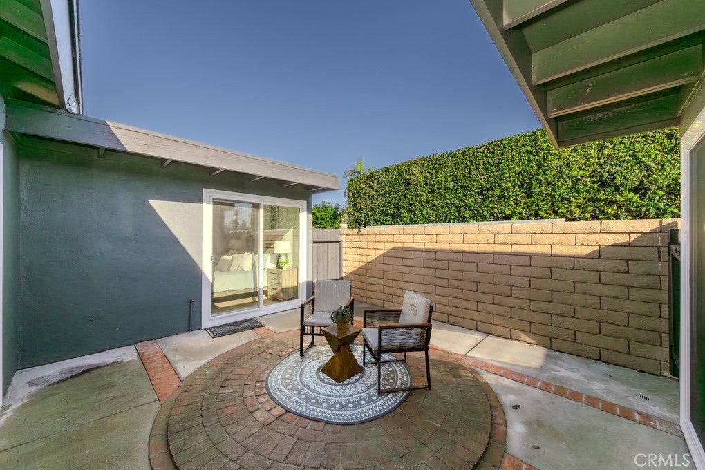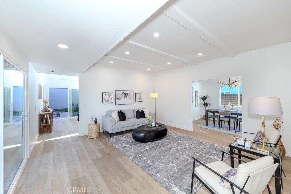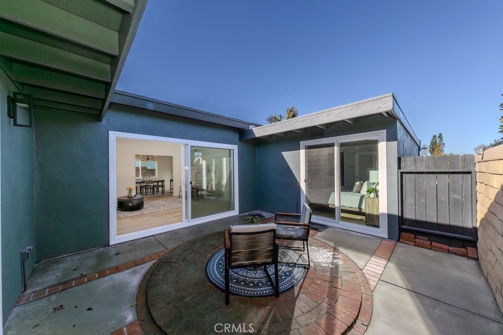 Single-story single-family home with fully renovated interior and modern finishes, located at 14452 Denbigh Lane, Tustin, CA 92780 in the Broadmoor Exclusives community. This Model 2 Custom Residence offers 3 bedrooms, 2 bathrooms, and 1,526 square feet of updated living space within a neighborhood of 128 homes built by Broadmoor. Entry begins through new double front doors into a defined landing with a closed coat closet. The living room is filled with natural light from a large sliding door opening to the atrium. The adjacent dining area connects seamlessly to the living space and includes recessed lighting. Continuing through the home, the family room features a fireplace with a wood mantel, recessed lighting, and open flow into the kitchen. The kitchen has been fully redone with quartz countertops, a matching quartz backsplash, shaker-style cabinetry, and a bar top seating area. Stainless steel appliances include an electric range, microwave, dishwasher, and refrigerator. A deep sink is paired with coordinated gold-tone fixtures and hardware carried consistently throughout the home. Recessed lighting and updated fixtures complete the space, while a side sliding door brings in additional natural light. The primary bedroom is set apart from the rest of the home for added privacy with no shared walls. It is positioned toward the front of the residence and offers dual closets, including one mirrored closet, along with a sliding door to the atrium. The en suite bathroom has been completely remodeled with quartz counters, new cabinetry, coordinated gold fixtures, and a walk-in shower with stone walls. Two additional bedrooms are located off the main hall, one with its own sliding door to the atrium. The guest bathroom includes quartz counters, updated cabinetry, matching gold fixtures, and a full bath with a stone surround. Renovations include permitted kitchen and bathroom remodels, new LVP wood flooring throughout, all new windows and sliding doors, new interior doors, updated electrical outlets and switches, fresh interior and exterior paint, and new exterior light fixtures. The backyard offers a private setting and serves as a blank canvas for future outdoor use. The property includes a two-car garage with direct interior access. Community amenities include a pool and a lounge area. Located within the Tustin Unified School District and close to shopping and restaurants, with convenient proximity to The District at Tustin Legacy and Old Town Tustin.