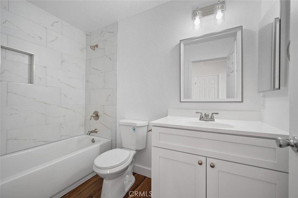 Completely remodeled 2 bedroom 2 bath upstairs apartment with air conditioning, with a 2 car garage with new doors and openers. The apartment has been upgraded with vinyl flooring throughout, new custom kitchen cabinets, new quartz countertops, all new appliances (stove, dishwasher, microwave). Brand new bathtubs and tiled showers, new vanities, new mirrors and all new fixtures in both bathrooms. The electrical has been updated with all new switches and outlets, new recessed lighting, and new ceiling fans. The exterior building has been updated and recently painted.