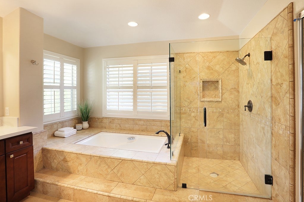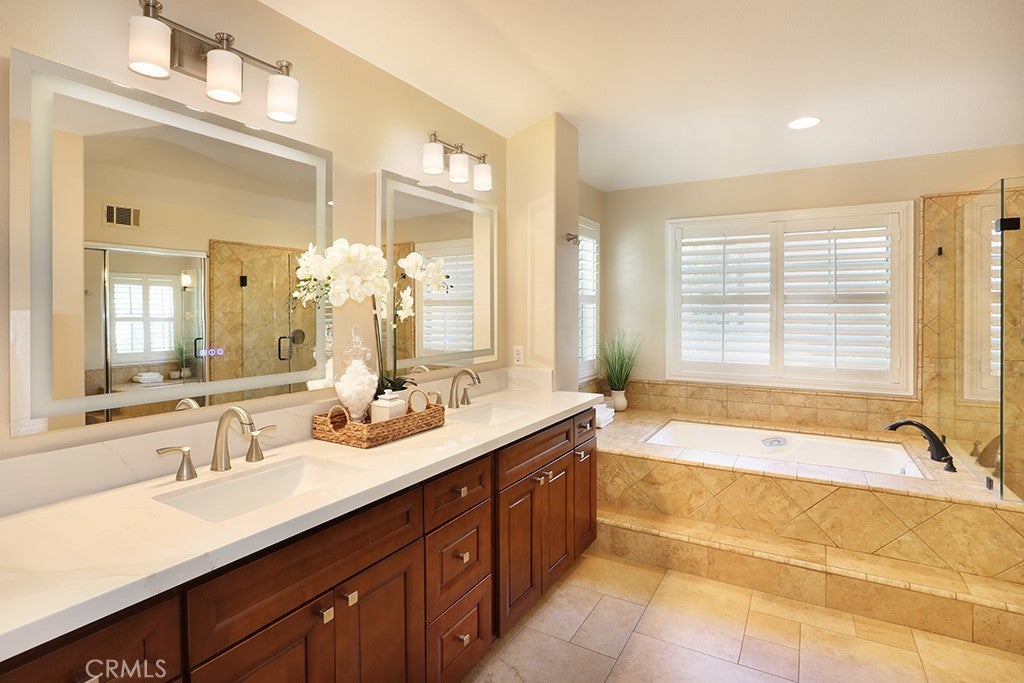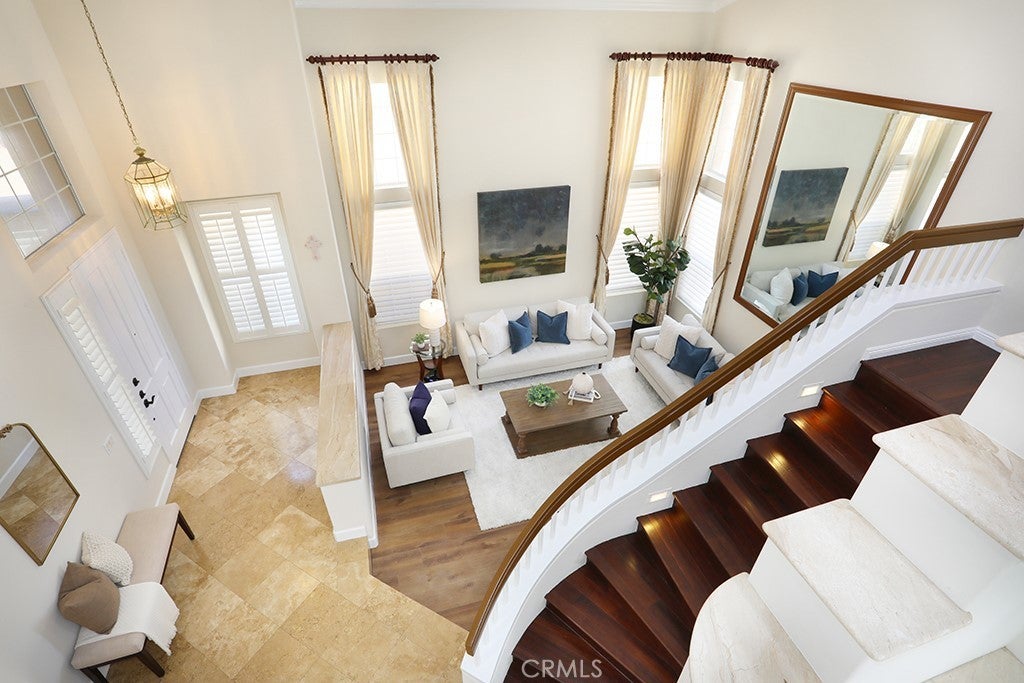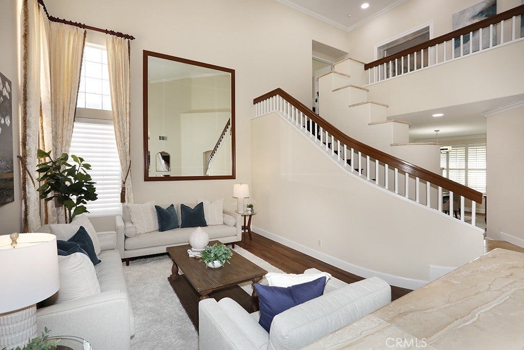 LARGEST MODEL PLAN 3 in GATED COMMUNITY of ALICANTE with interior location. Spacious 3,325 sq. ft, 4 Bedrooms PLUS Bonus Room PLUS Office and 3 Baths. Grand entrance with Travertine Flooring, Cathedral Ceilings. Grand Formal Living Room with Custom Drapery and NEW Silhouette Shades and Custom Mirror (included). New LVP Flooring, New Recessed Lighting, New Chandeliers, New Baseboards, New Paint, New Custom Window Shades. Formal Dining Room with Wet Bar and Glass Shelving, Plantation Shutters and Crown Molding. Cozy Fireplace in Family Room with a Breakfast Nook, Slider to backyard with custom Silhouette Electric Shade. Gourmet Granite Island in Kitchen. Brand New Stainless Dishwasher, Faucet, New Stainless Vent over gas cooktop, Dual Ovens. Tons of storage in Kitchen. MAIN FLOOR BEDROOM. MAIN FLOOR NEWLY REMODELED BATH with Shower. ALL BATHS REMODELED, NO CARPET DOWNSTAIRS. NEW DUAL AC, FURNACE & WATER HEATER. Upstairs Office with built-in desk and storage cabinets AND Closet, could be a 5th bedroom. PRIMARY BEDROOM with cathedral ceilings, Custom Drapes, NEW CARPET with upgraded padding. Primary UPGRADED bathroom with soaking tub and walk-in shower. Primary Large Walk-In Closet. 3 Additional Spacious Bedrooms Upstairs, NEW Carpet. BONUS room with Plantation Shutters and wood flooring. Synthetic, easy care, grass in front yard and backyard. Spacious 3 car garage with driveway. Close to Highly Rated Schools, Parks, Peters Canyon Walking Trails, Irvine Park, Market Place and District Shopping, Freeways. TERMITE CLEARANCE. NO MELLO ROOS and Low HOA.