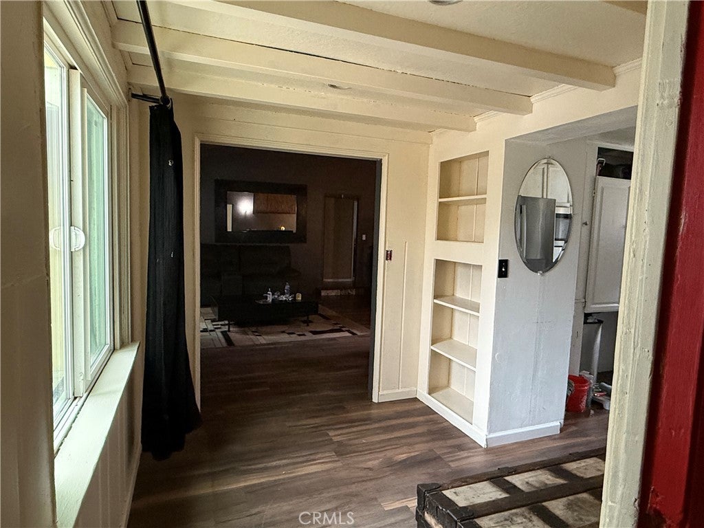This 2-bedroom, 2-bath home sits on a generous 9,147 sq ft lot and offers a solid layout with plenty of opportunity to update and make it your own. The living room stands out with vaulted ceilings, exposed beams, dual ceiling fans, and a striking marble-style fireplace built into rich, dark paneled walls, complemented by built-in shelving that adds both charm and function. The kitchen is intimate and practical, featuring a window over the sink that looks out to the backyard. Two bedrooms are located on one wing of the home, the primary with a walk-in closet, and a shared bathroom positioned between them with updated tile and a tub. On the opposite side, an office or optional third bedroom connects to the laundry area and a second bathroom with a tiled walk-in shower, with direct access to the garage through a sliding door. Outside, the backyard offers ample space with partial paving—ideal for future customization—while the front of the home features a convenient half-circle driveway. Located in a desirable Banning neighborhood just down the street from Banning Parks and Recreation, this cosmetic fixer presents a great opportunity to add value and personalize a well-laid-out home in a solid area. Broker and agents do not represent or guarantee the accuracy of the square footage, income, expenses, condition, development potential, bedroom/ bathroom count, lot size or lot lines, dimensions, permitted or non-permitted spaces, or school eligibility. Buyer is advised to independently verify the accuracy of all information with appropriate professionals. There are no warranties or guarantees, buyer to rely solely on his/her/their own findings.