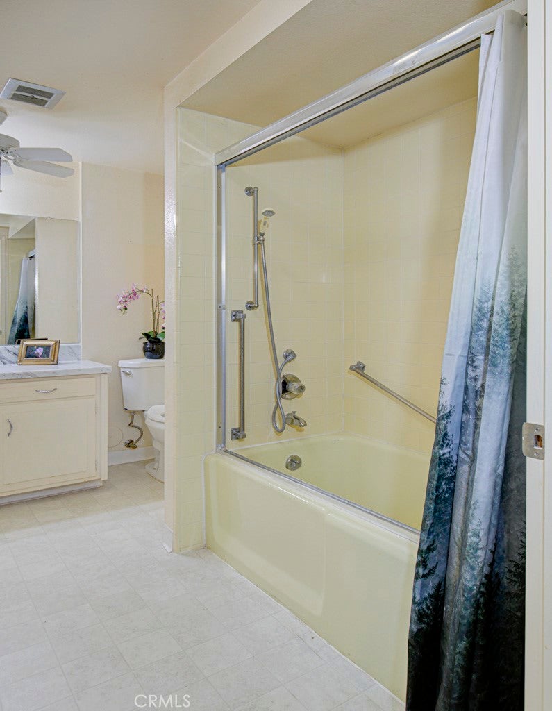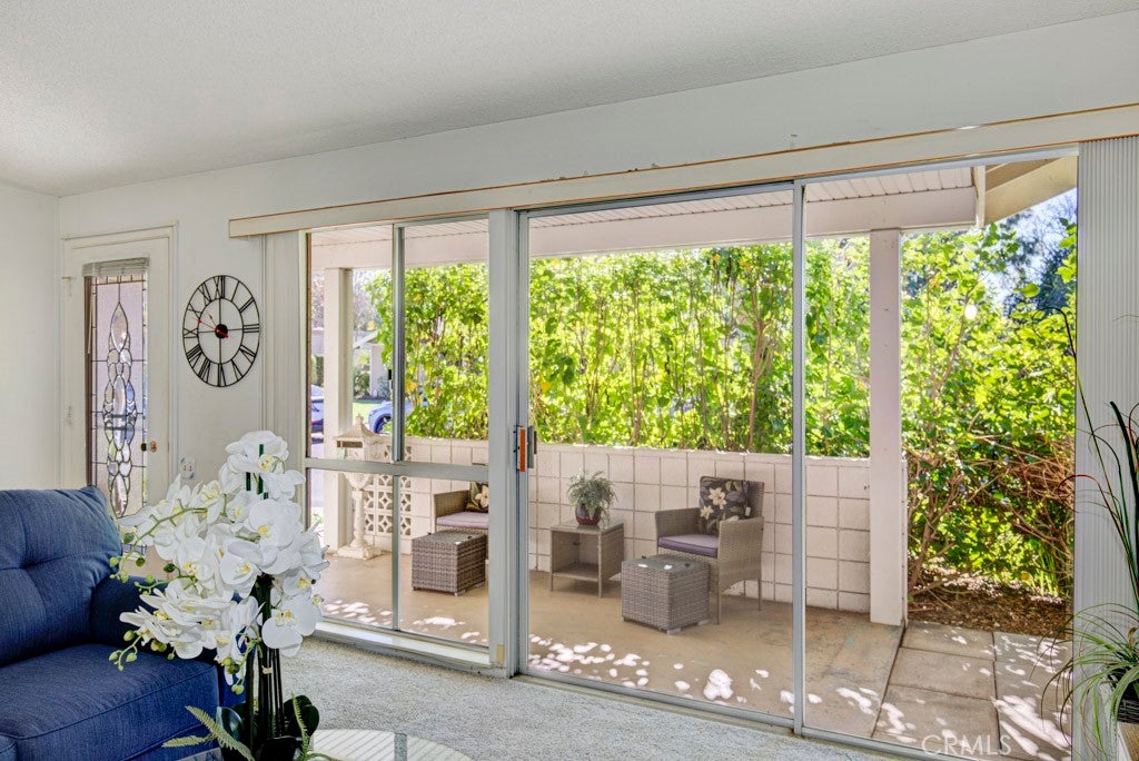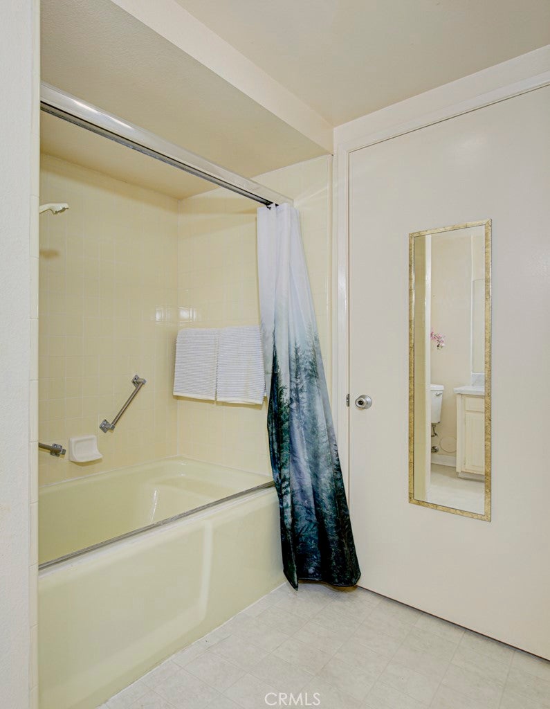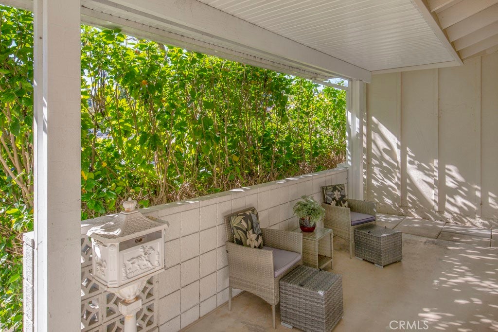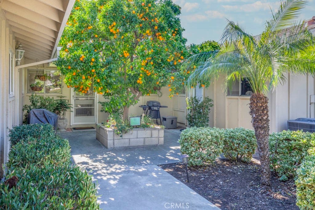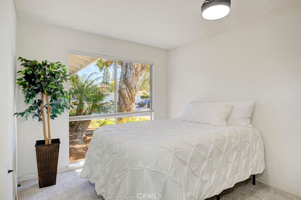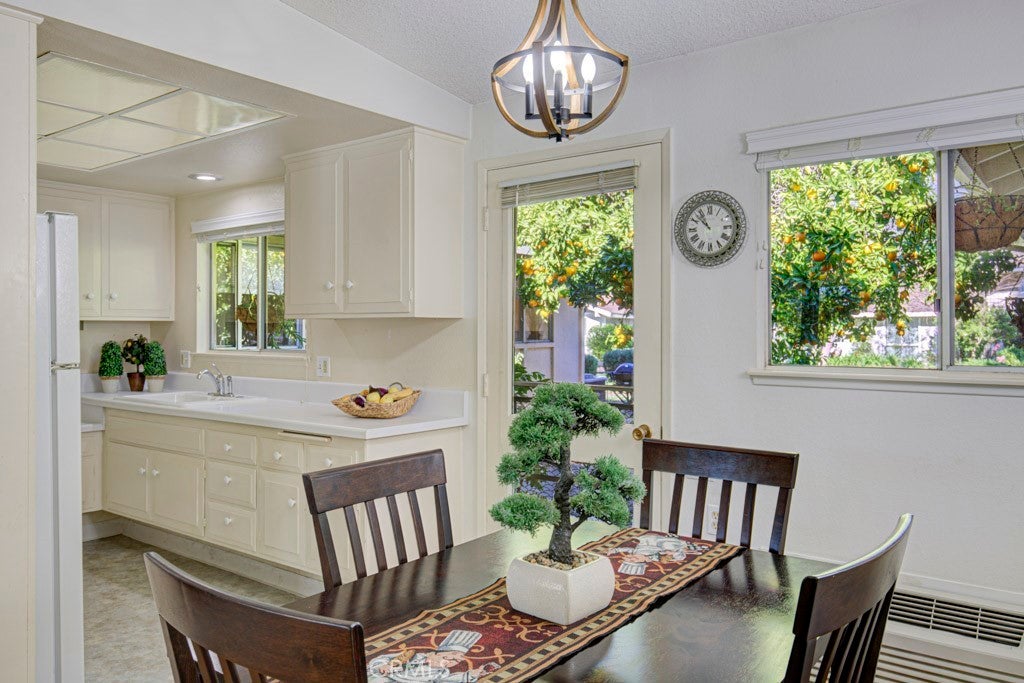 POPULAR Single Story SAN SEBASTIAN model - This model features vaulted ceilings in the living room & dining room. Park right at your front door! Enjoy the ease of HOA-maintained landscaping and mature trees. Enter through your private, covered front patio, a lovely shaded spot to relax. Step inside to spacious living and dining areas featuring vaulted ceilings that create an open, luxurious feel. The living room enjoys lush greenery views and patio access via a sliding door. The large galley kitchen, with abundant cabinets and counter space, overlooks a sunny, shared courtyard with a charming orange tree. A handy back door from the kitchen leads directly to your nearby carport, making grocery unloading a breeze. (HOA maintains refrigerator, cooktop, and oven). The central hallway leads to the generously sized guest and primary bedrooms, both featuring large windows, versatile blinds/shades, and extensive floor-to-ceiling closets for ample storage. A functional Jack 'n Jill bathroom connects the two, offering separate vanity areas and a shared tub/shower combination accessible from both sides. The primary bedroom easily accommodates large furniture (queen bed shown) and includes a second closet for even more storage. This light-filled home seamlessly blends indoor comfort with charming outdoor spaces. It's ready for some fresh paint --- so you can choose your own color palette. Ownership affords you the use of all the amenities that make Laguna Woods Village one of the most sought after senior communities. Enjoy 5 swimming pools, 7 clubhouses, 3 gyms, craft studios, 2 gorgeous golf courses (27 hole & 9 hole par 3), over 250 social clubs, performing arts theater, tennis courts, equestrian trails, stable, fare free bus service, golf cart paths, manned security gates, lawn bowling, bocce ball, pickle ball & much more.