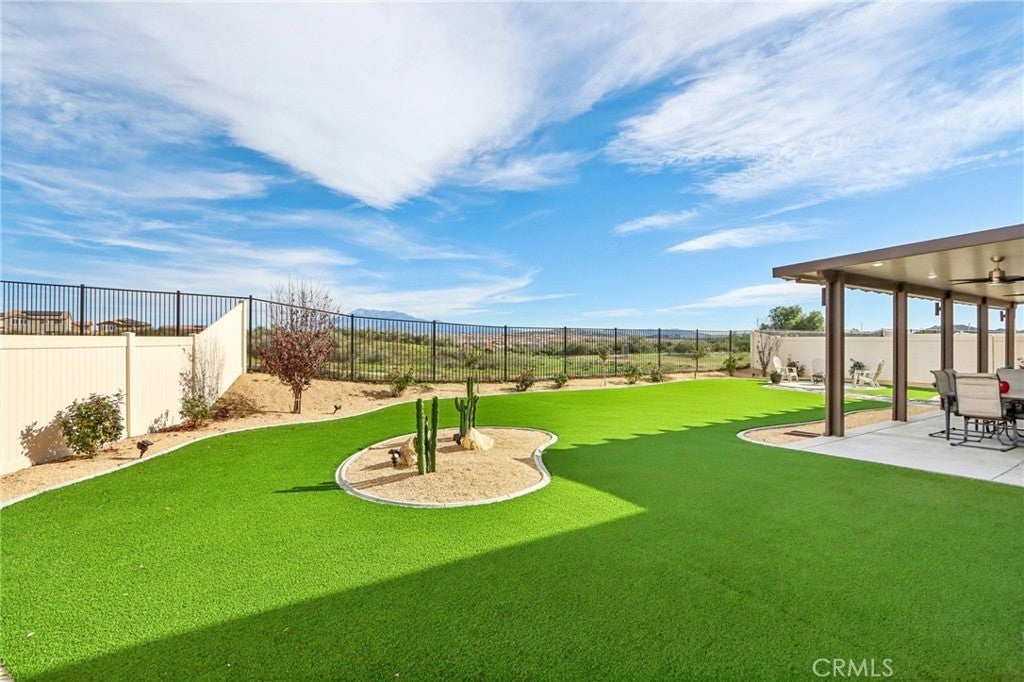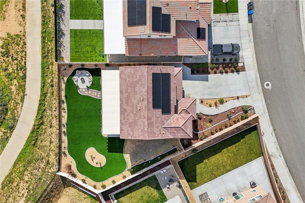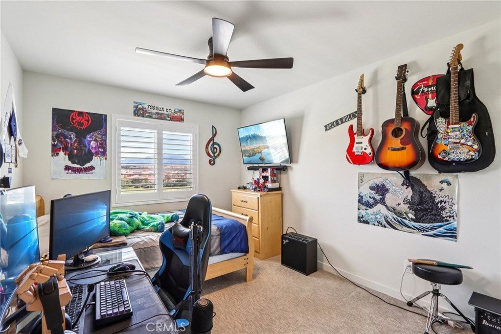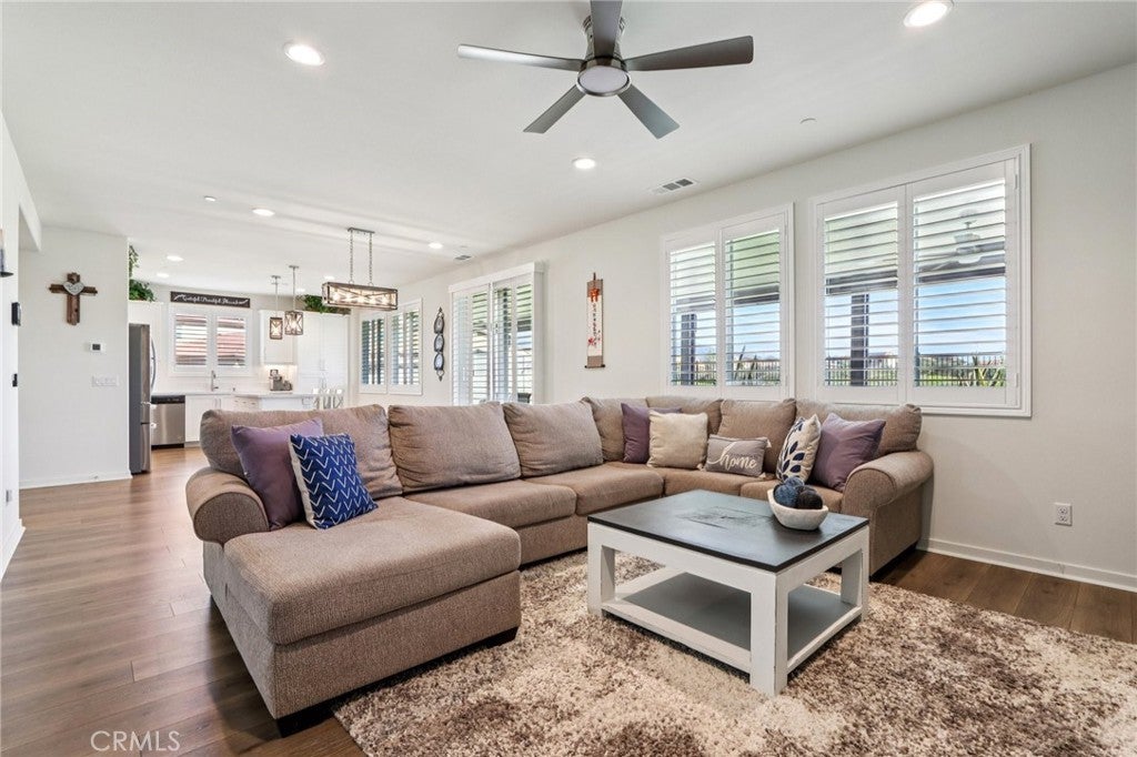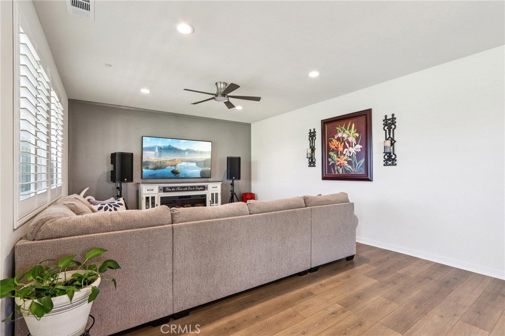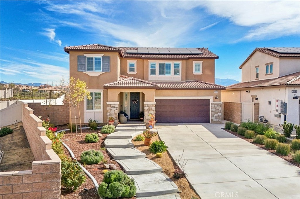 Welcome to The Fairway Community, where you can experience modern resort-style living at its finest. This breathtaking premium corner lot home sits on an expansive 7,815 sq. ft. lot overlooking The Legends GOLF COURSE with stunning MOUNTAIN VIEWS—a rare find in today’s competitive real estate market. Properties in this sought-after neighborhood consistently trend above average for both appreciation and desirability, making this an exceptional investment opportunity as well as a dream residence. The exterior features self-maintaining landscaping, including turf, decorative rocks, vinyl fencing, and drought-tolerant plantings, ensuring both excellent curb appeal and easy upkeep. The outdoor space is perfect for year-round entertaining, featuring an Alumawood patio cover with recessed lighting, ceiling fans, TV, and a dedicated BBQ and dining area—ideal for hosting gatherings or relaxing with loved ones while enjoying the scenic backdrop. Inside, you’ll find a bright, open 2,239 sq. ft. floor plan with four spacious bedrooms and three full bathrooms. A convenient main-floor bedroom and bath provide an ideal space for guests or multi-generational living. The chef’s kitchen is a showstopper, featuring white cabinetry, stainless steel appliances, quartz countertops, and a large island with designer pendant lighting and extra seating. Upstairs, a large loft offers flexible additional living space, while a well-appointed laundry room with extra storage adds everyday convenience. The spacious master suite offers picturesque views, a large walk-in closet, and a luxurious bathroom featuring dual quartz vanities, a soaking tub, and a walk-in shower, creating your own private retreat. Additional features include earth-tone luxury vinyl flooring, wood plantation shutters, recessed lighting, and ceiling fans throughout. This meticulously maintained home is truly move-in ready that includes a tankless water heater and "OWNED SOLAR!"—a major value in today’s energy-conscious market. Residents of The Fairway Community enjoy resort-quality amenities, including a clubhouse, gym, two sparkling pools, a jacuzzi, a splash pad, a playground, and picnic areas. Schedule your private showing today and secure your place in one of the area’s most desirable communities!