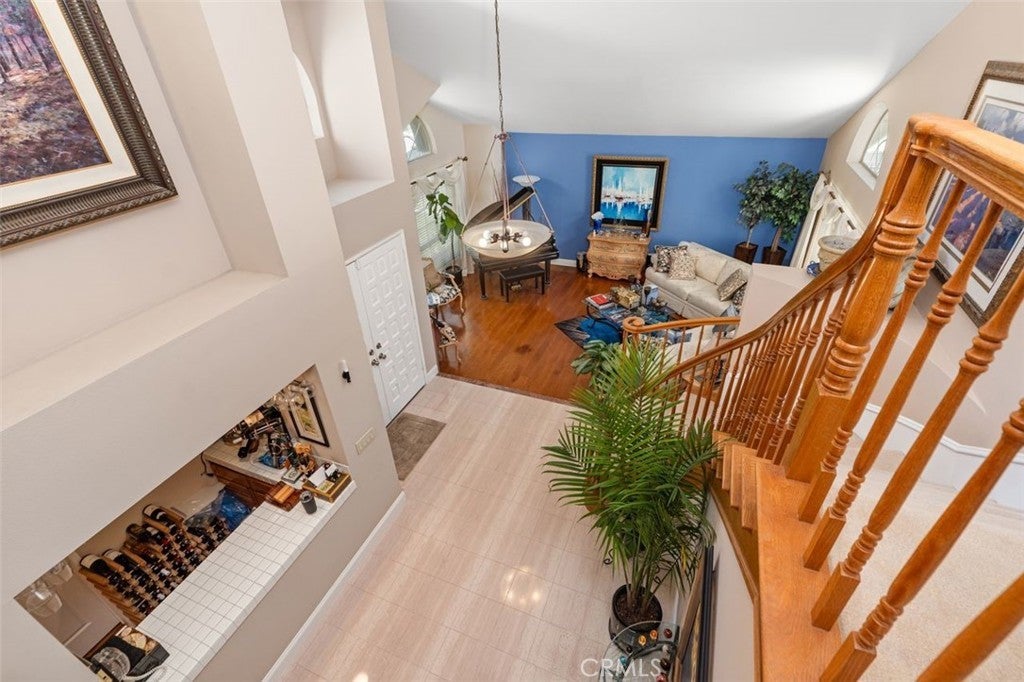 Perched on a premium corner lot along Aviemore Drive, this impressive residence offers sweeping hill and mountain views, exceptional privacy, and sits on a nearly 20,000 square-foot lot. The curb appeal is striking from the moment you arrive, with a beautifully elevated setting, mature trees, and a grand stairway rising from the sidewalk entryway, creating a memorable first impression and leading to the welcoming front entrance. An expansive driveway complements the elevation and provides access to a rare four-car garage featuring two single-car garage doors and one oversized two-car garage door. Inside, the home is filled with natural light, high ceilings, and beautiful flooring throughout. The open kitchen is designed for both function and style, offering a center island with gas cooktop, recessed lighting, stainless steel appliances, abundant storage, and a large breakfast nook that looks toward the backyard, providing a comfortable dining space with peaceful views of the outdoor setting. The lower level includes a convenient bedroom, a three-quarter bath, a wet bar off the dining area, direct garage access, and a dedicated laundry room. Upstairs, the spacious floor plan continues with four additional bedrooms, including a generous secondary bedroom with double-door entry. The large primary suite features a vanity area, step-in tub, walk-in shower, and private toilet room. A well-appointed hall bath with dual vanities serves the additional bedrooms. The backyard is a true retreat. Thoughtfully designed by the owner, the custom pool and spa were intentionally positioned to maximize the breathtaking views—allowing you to relax in the spa while overlooking the rolling hills. A water feature that cascades into the pool from the spa, brick and concrete hardscape, and towering pine trees create a serene atmosphere that feels worlds away from city life. The property also overlooks Eastside Community Park, enhancing the sense of openness and connection to nature. With plentiful driveway and street parking, a spacious interior layout, and a lot that delivers exceptional outdoor living, this home embodies the essence of Yorba Linda—The Land of Gracious Living. Close to shopping, dining, and conveniences, this is a rare opportunity to own a view property in one of the city’s most desirable settings.