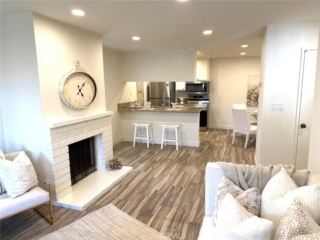 Ground Floor End Unit Two Bedroom Condominium. Just completed $20,000 in upgrades and appliances! It looks spectacular! Wood floor looking tile, open kitchen area, dining room, fireplace, patio, and two nice sized bedrooms. Light and bright!! This unit includes a Garage plus additional open parking spaces both up and below in a dedicated parking garage. Enjoy the amenities such as a pool, spa, and a tennis court! Great location near restaurants, shops, groceries, and the freeway. You could walk or bike to many of these locations easily. Ideal for someone who wants or needs ground floor living. Be ready to jump on this property as soon as it goes live! You don't want to miss it!